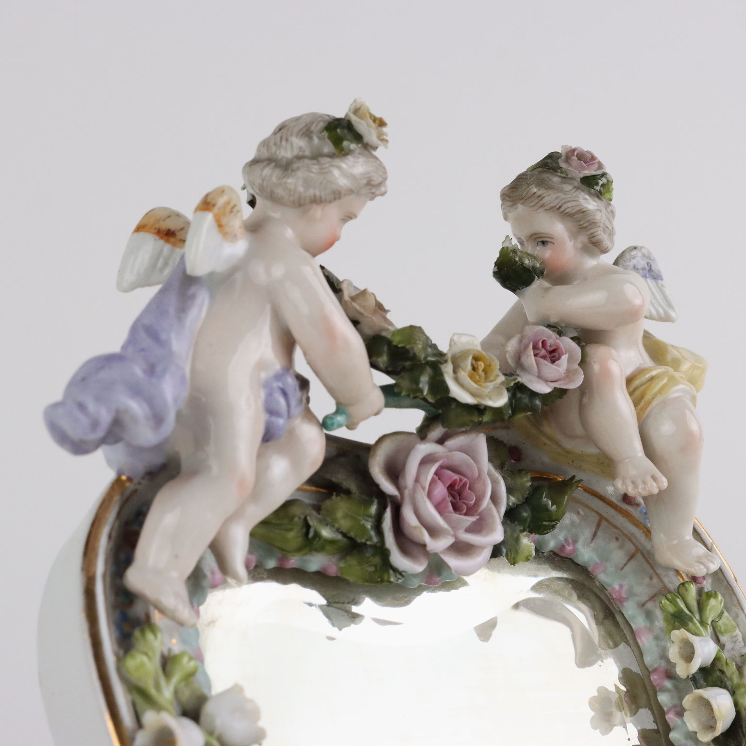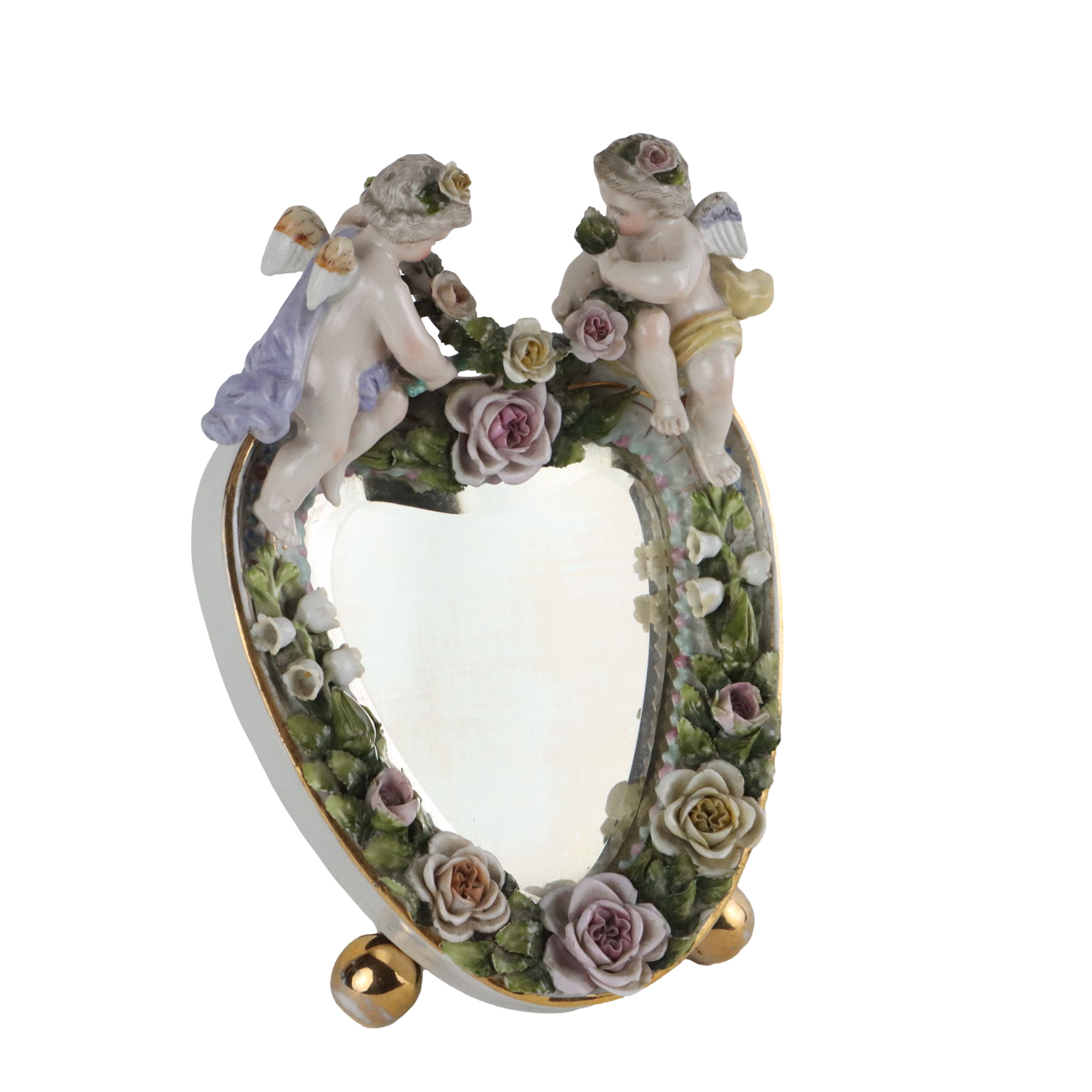 Specchierina da tavolo in porcellana policroma, manifattura tedesca di Sitzendorf, a forma di cuore, sormontata da due cherubini e impreziosita da fiorellini a rilievo lungo tutto il bordo. Marchio della manifattura di Sitzendorf in blu sotto smalto.