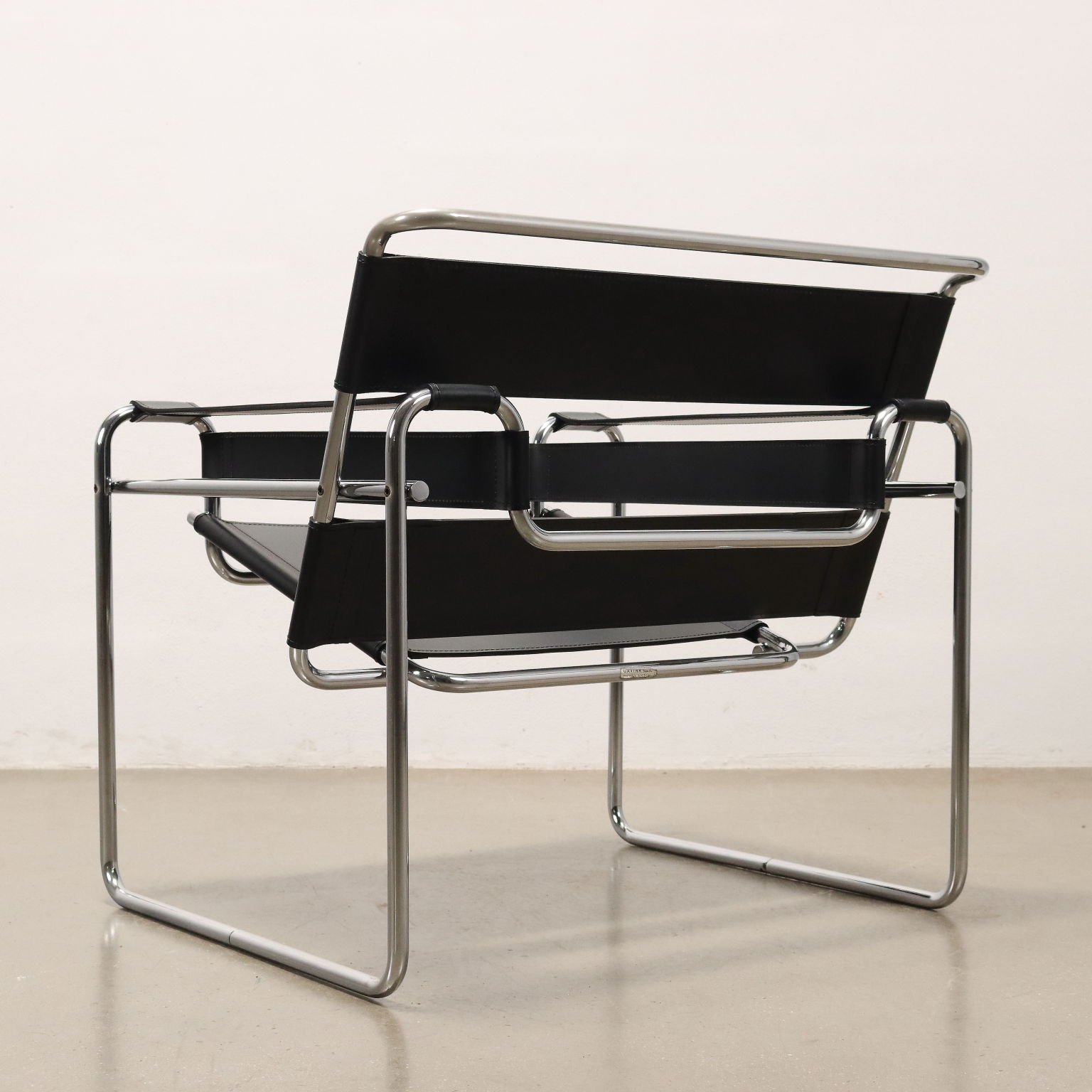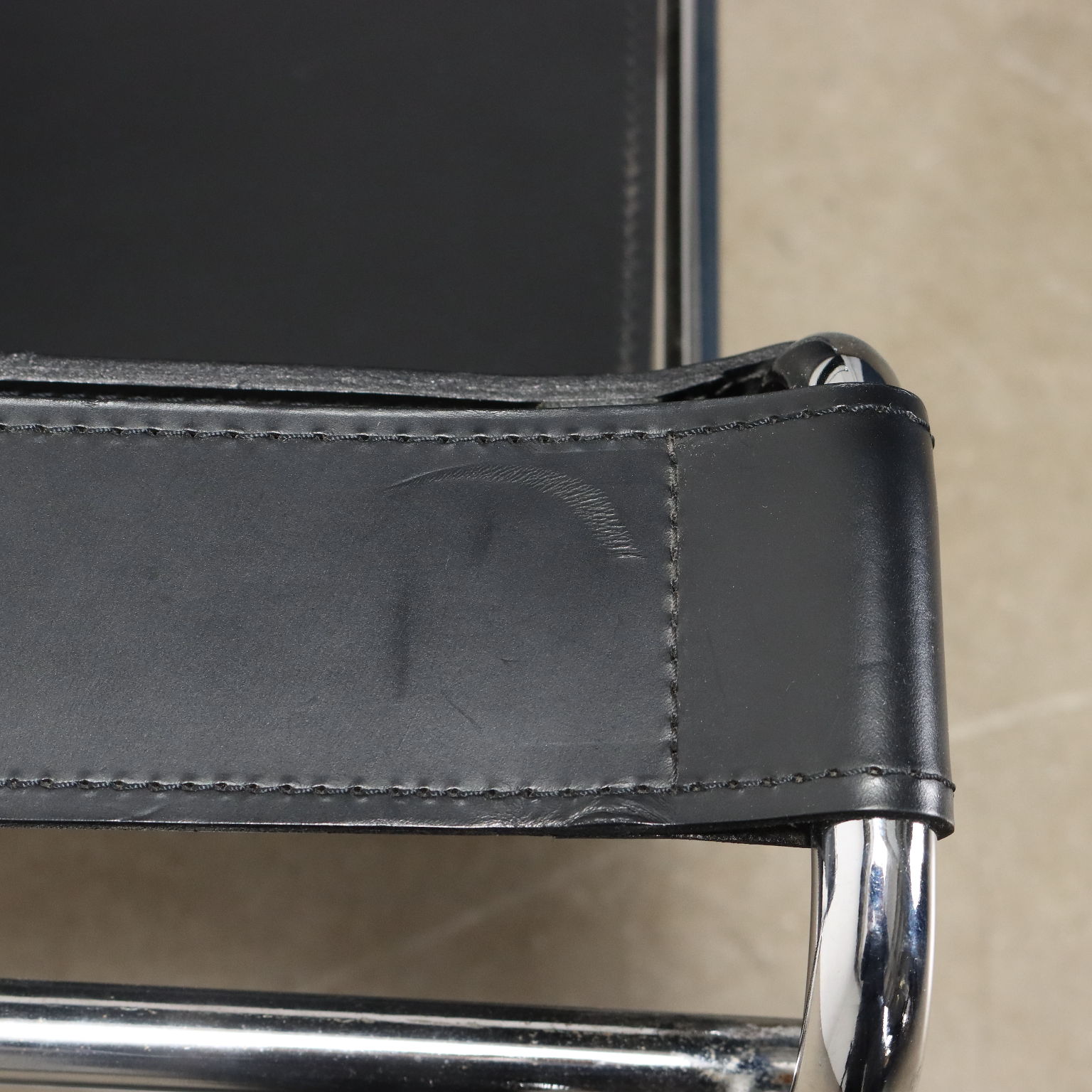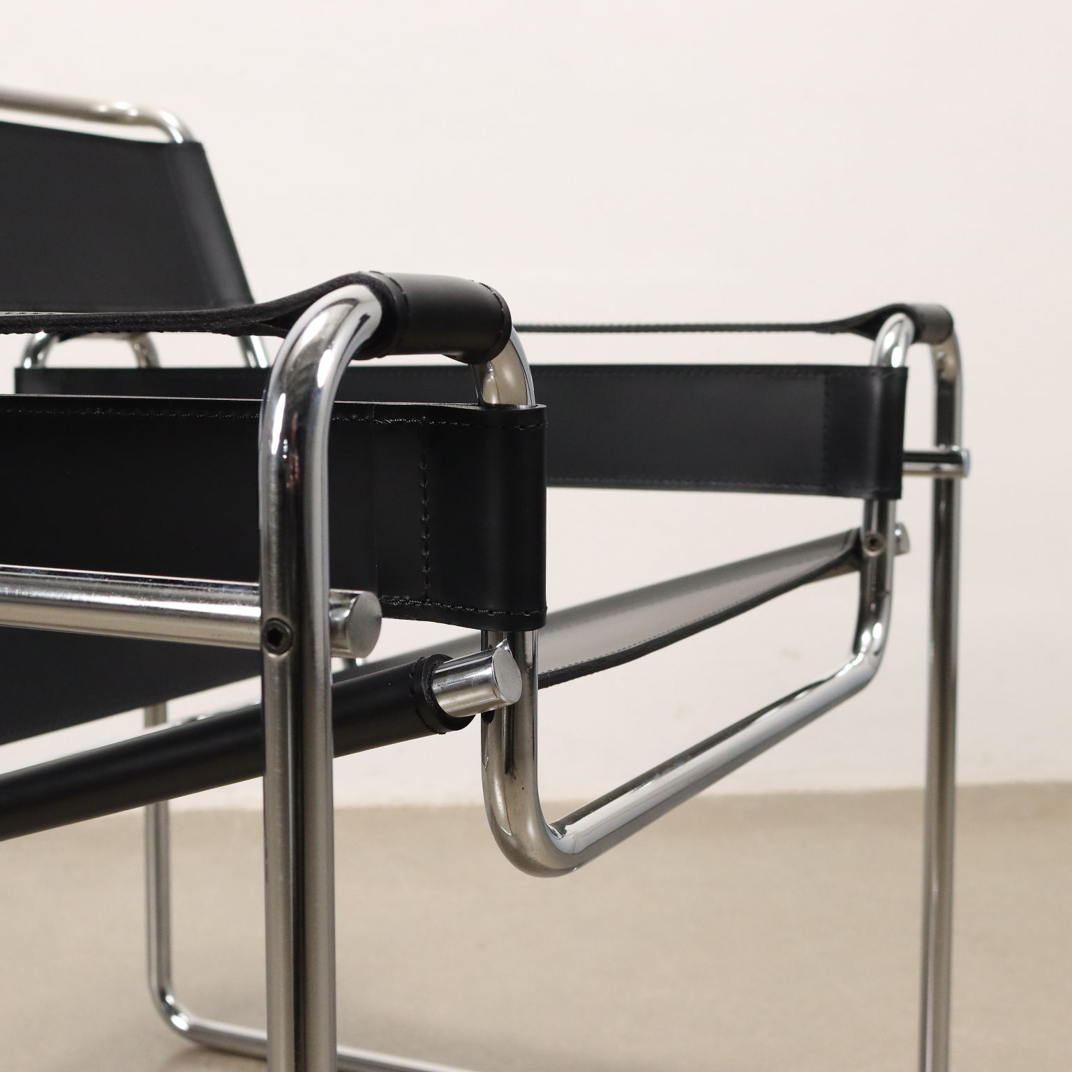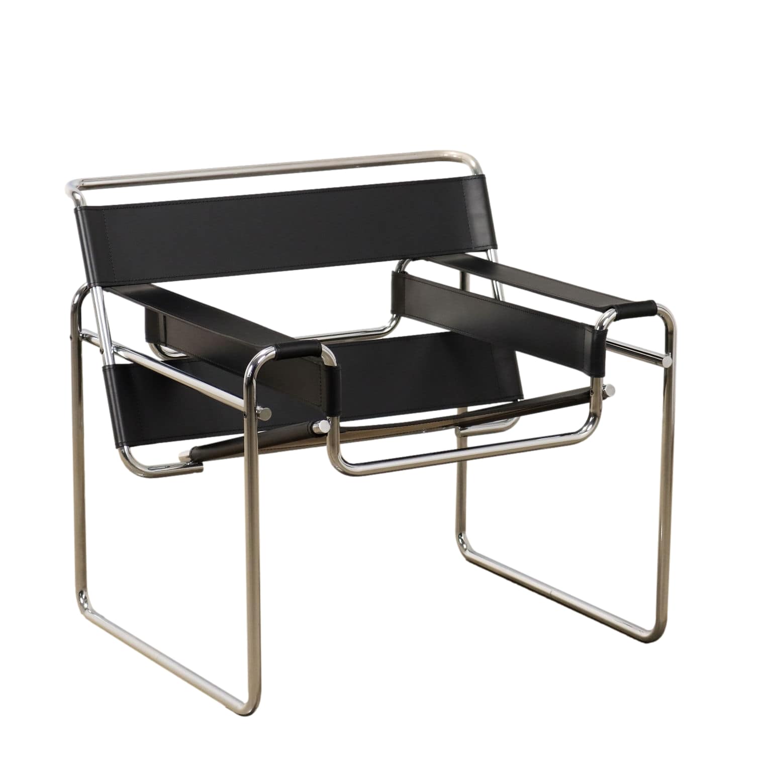 Iconica poltrona disegnata nel 1925 da Marcel Breuer per il pittore costruttivista Wassily Kandinsky. Realizzata in tubolare in acciaio cromato e cuoio, riporta l'adesivo della produzione. Presenta piccoli graffi sui braccioli.