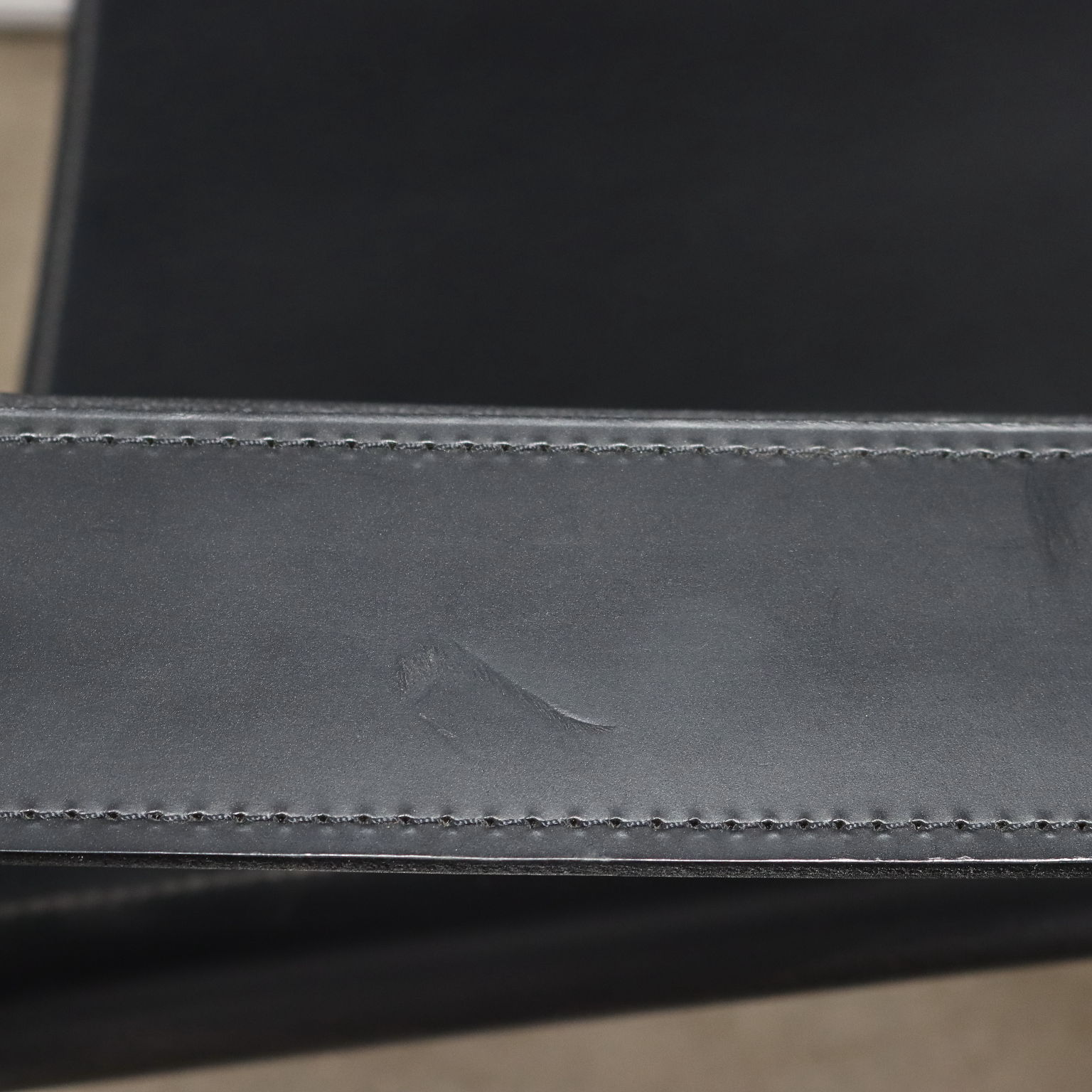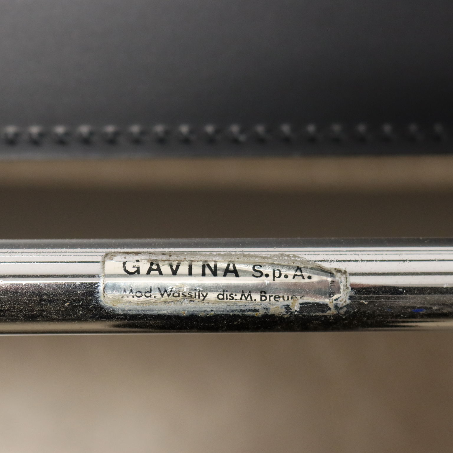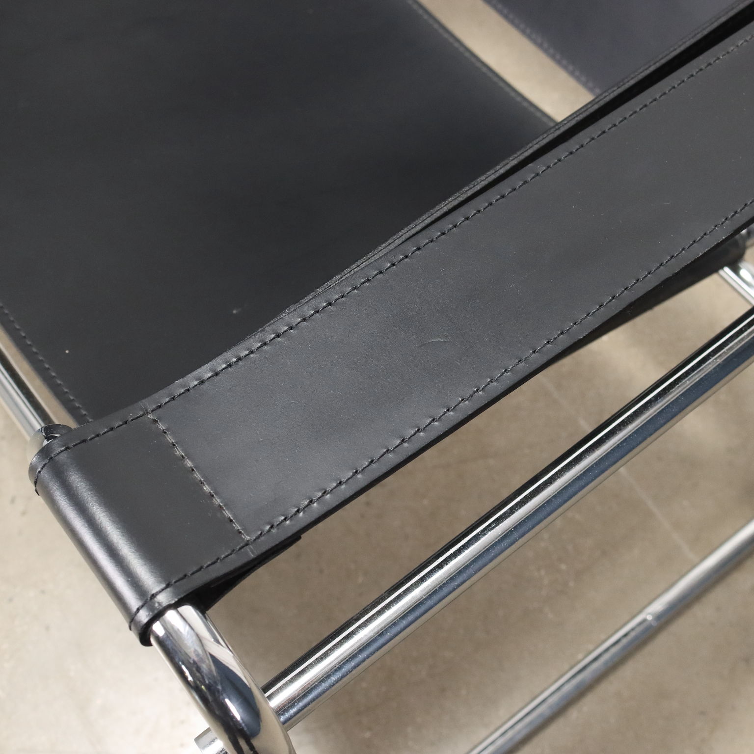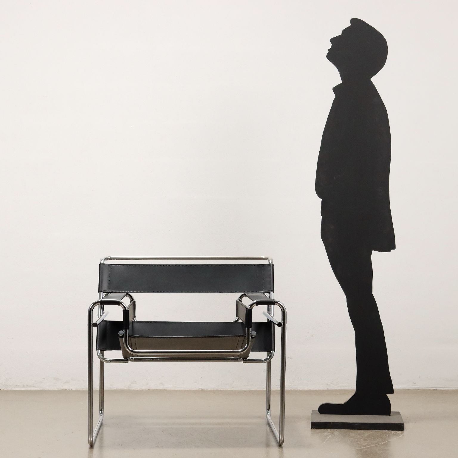 Iconica poltrona disegnata nel 1925 da Marcel Breuer per il pittore costruttivista Wassily Kandinsky. Realizzata in tubolare in acciaio cromato e cuoio, riporta l'adesivo della produzione. Presenta piccoli graffi sui braccioli.