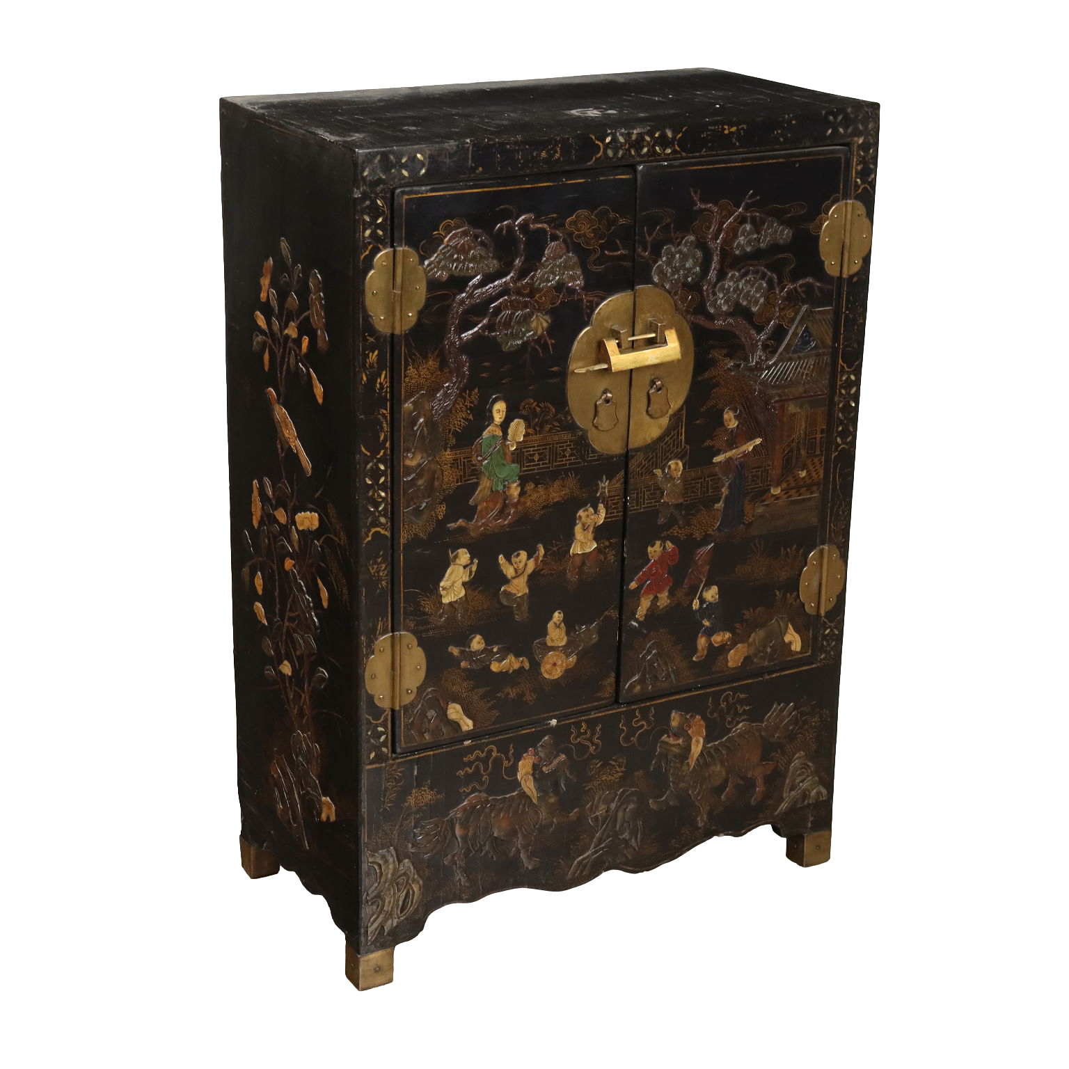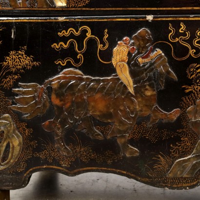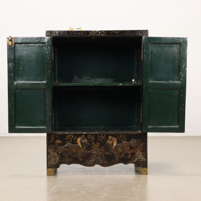 Piccolo stipo a due ante, all'interno presenta doppio fondo; laccato, all'esterno è decorato con personaggi e paesaggi orientali, realizzati in giada intagliata.