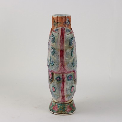 Vaso insolito a foggia di farfalla con le ali spiegate. Le due farfalle contrapposte sui due lati decorate fantasiosamente a simularne il manto. Base con fascia di foglie e frutti e collo scanalato con farfalle su fondo arancione.