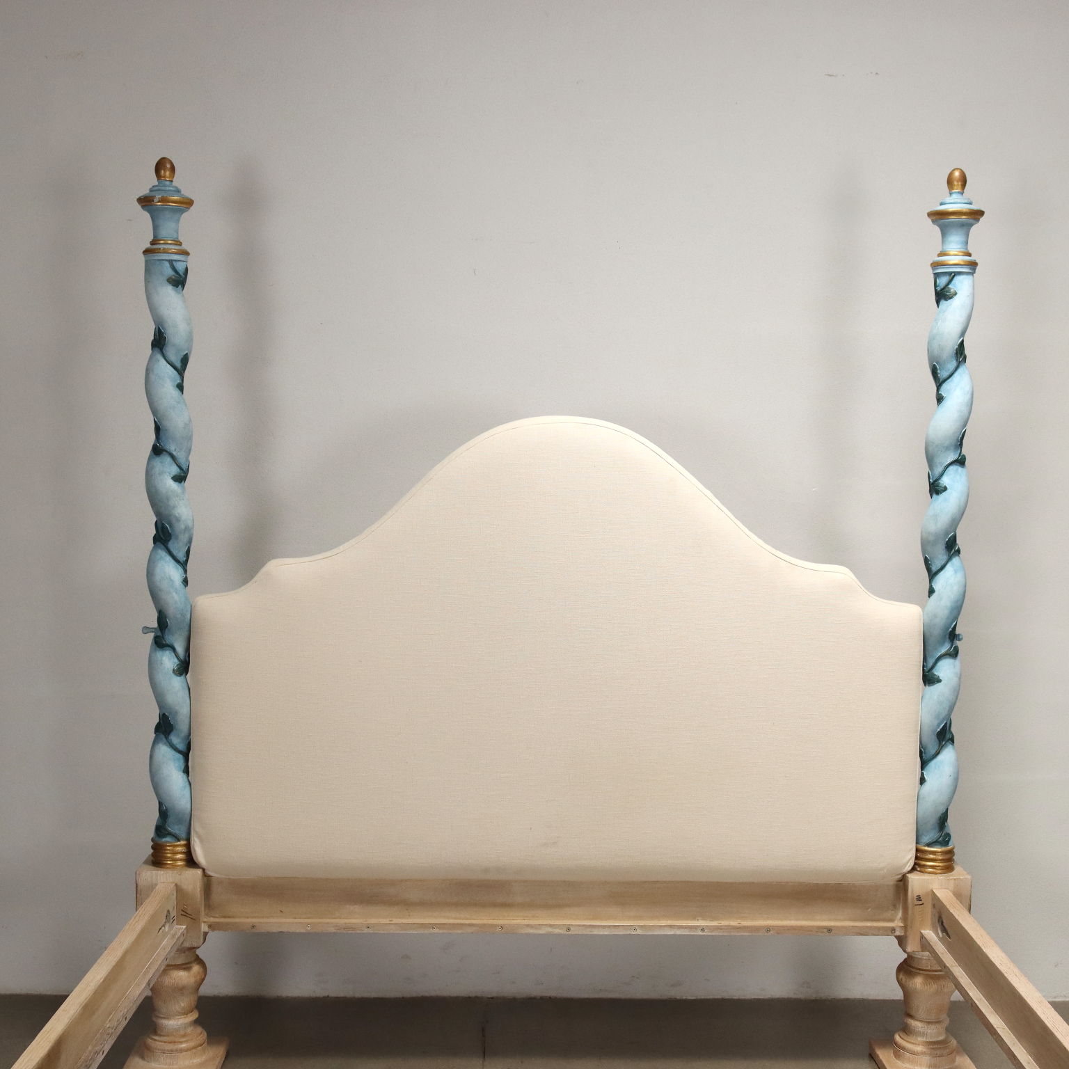 Letto in stile con montanti costituiti da colonne tortili ornate con racemi vegetali, dipinte e dai capitelli parzialmente dorati, la testiera è imbottita.