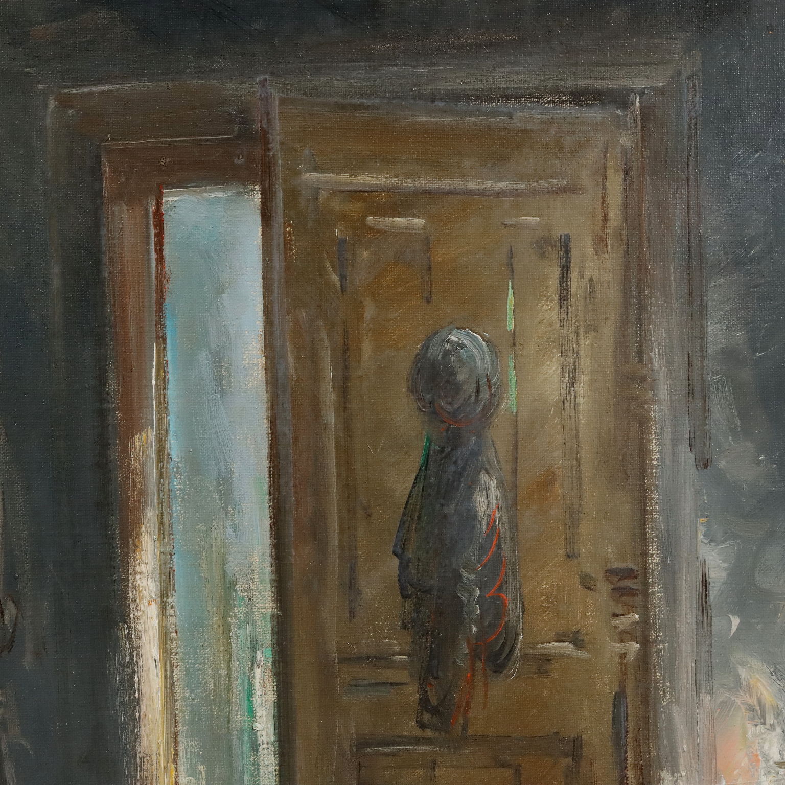 Olio su tela. Firmato in basso a sinistra. Al retro cartiglio con il titolo. E qui proposto un tema ricorrente del pittore Mario Fattori, che ritrasse momenti della vita contadina e pastorale, prevalentemente della Toscana. Qui la scena è ambientata in uno stanzone di una cascina, poveramente arredato: : davanti al grande camino acceso siede una donna anziana, mentre due bambini accovacciati osservano le galline che entrano dall'uscio aperto. L'opera è presentata in cornice in stile.