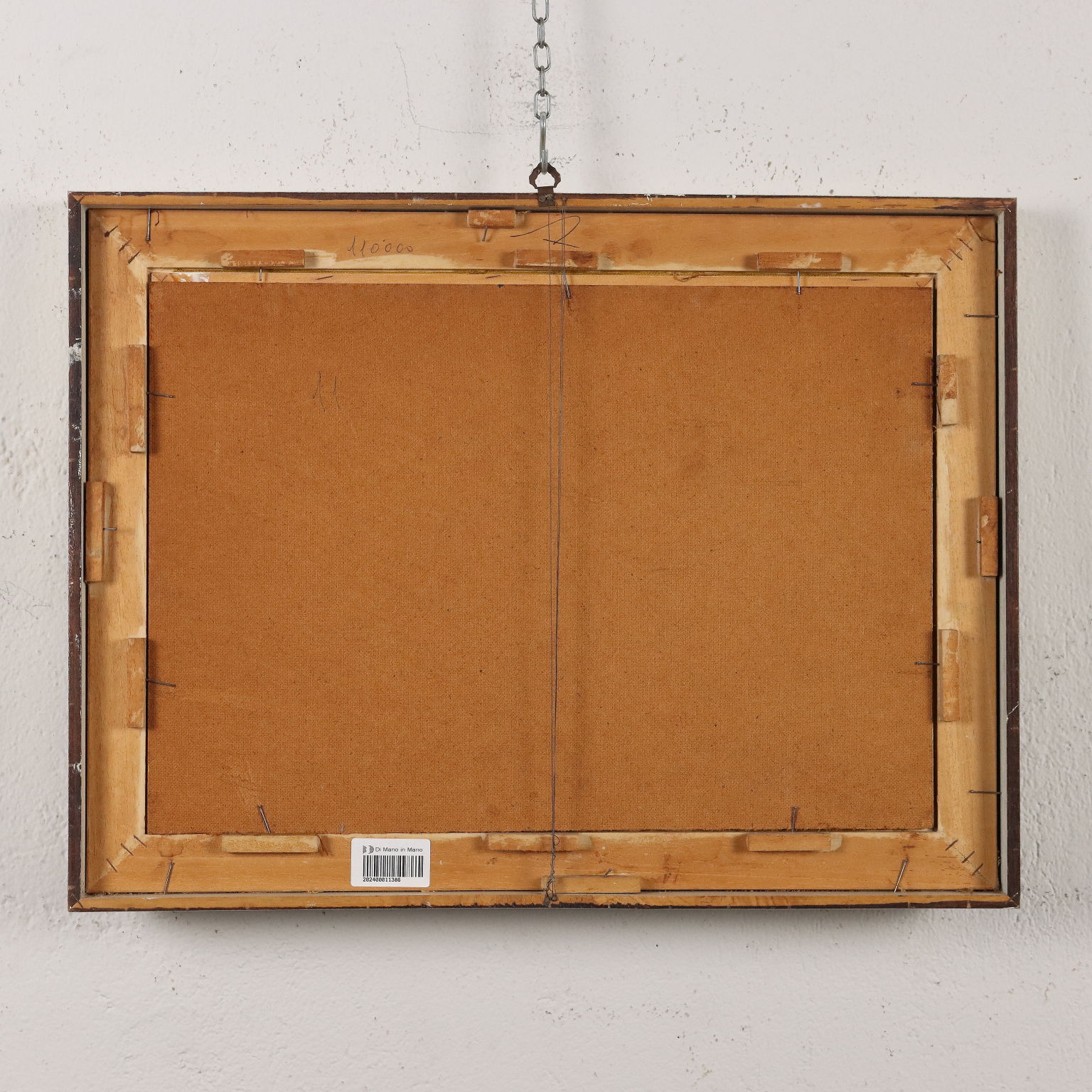 Olio su faesite. Firma, data e titolo in alto a destra. Udo Toniato, pittore naïf, è noto per le sue opere che raccontano la sua terra d'origine, la Bassa del Po, con i suoi personaggi. Qui raffigura tre pretini che, armati di ombrello per ripararsi dal sole della Bassa, si dirigono verso la cappella votiva sulla strada di campagna, osservati da una divertita capretta, per le ultime preghiere della giornata. L'opera è presentata in cornice.