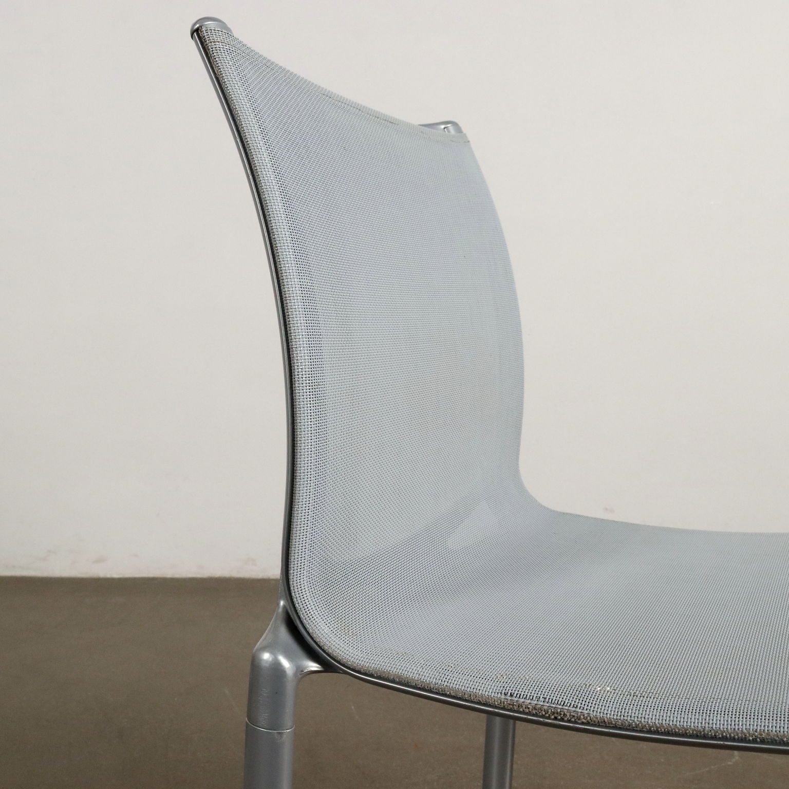 Gruppo di 3 sedie, in alluminio e la seduta e lo schienale in rete plastificata.