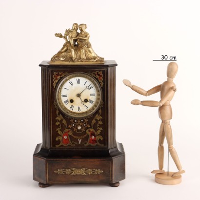Orologio da appoggio in legno con inserti in ottone, madreperla e finta tartaruga, sormontato da scultura in bronzo dorato raffigurante scena galante. Mostra in metallo smaltato con ore a numeri romani protetta da coperchio con vetro bisellato.
