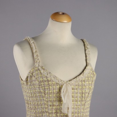 Abito da cocktail in tweed di cotone con filato giallo pastello, beige e marrone. Lo scollo è impreziosito da un nastro in seta. Tasche inserite. Foderato.