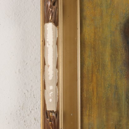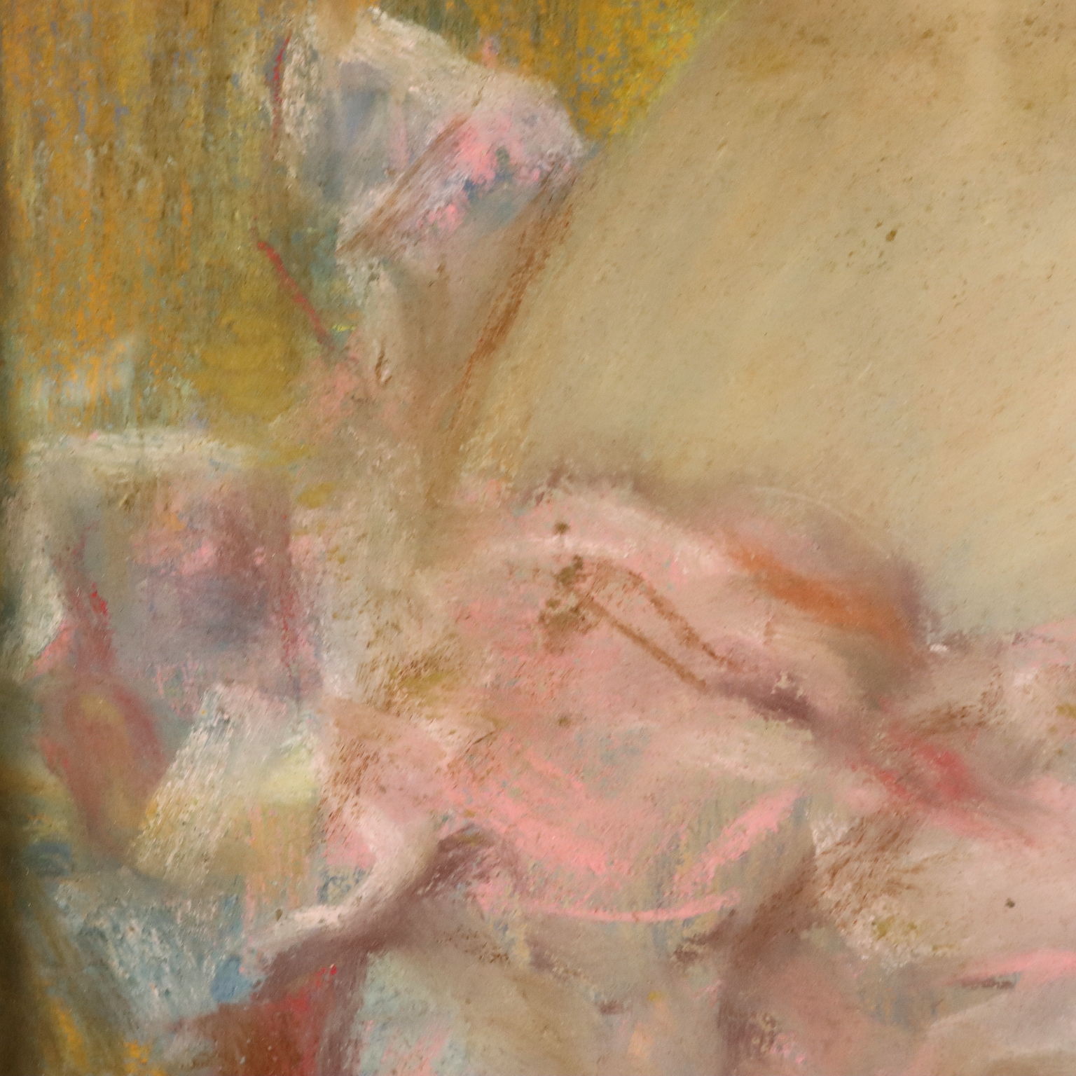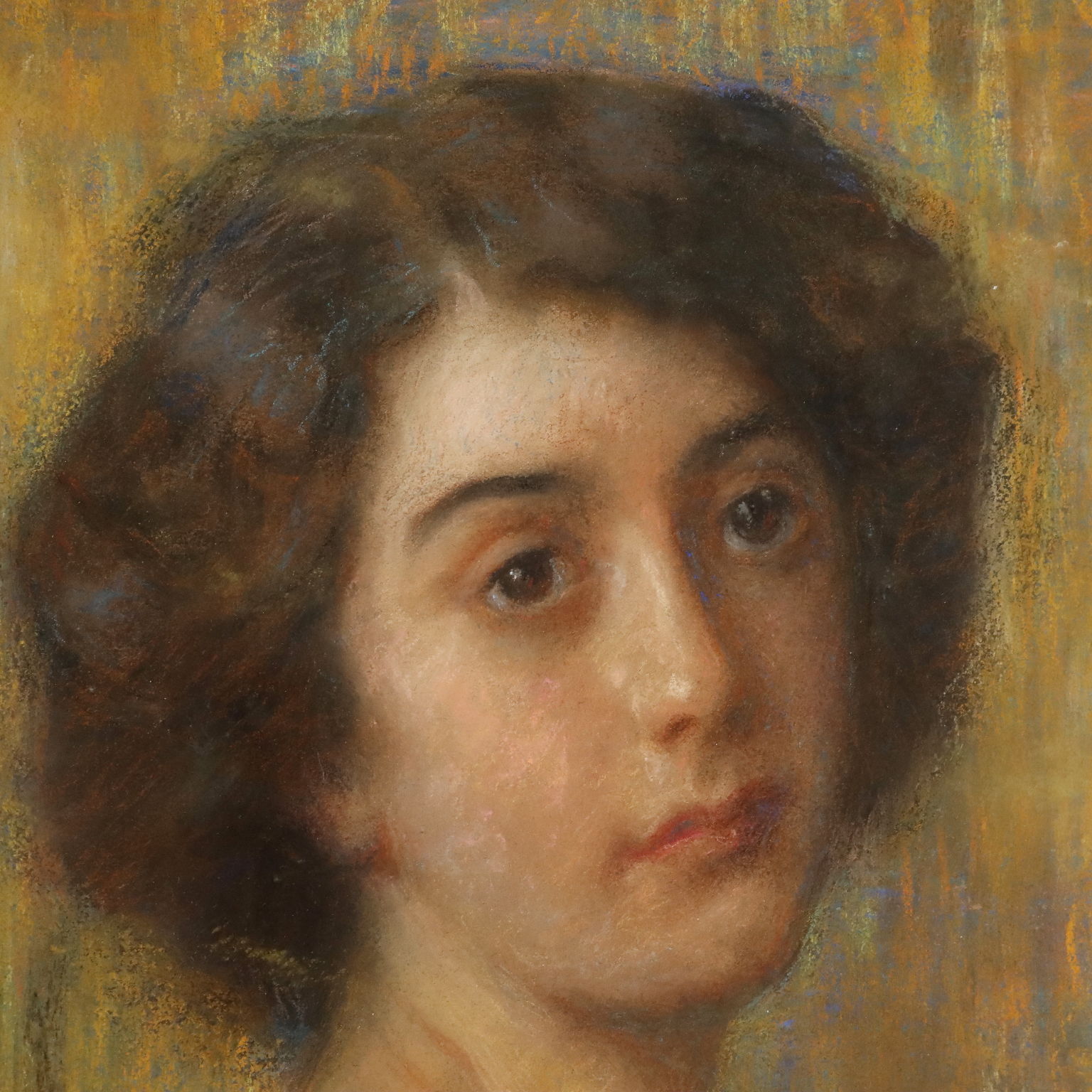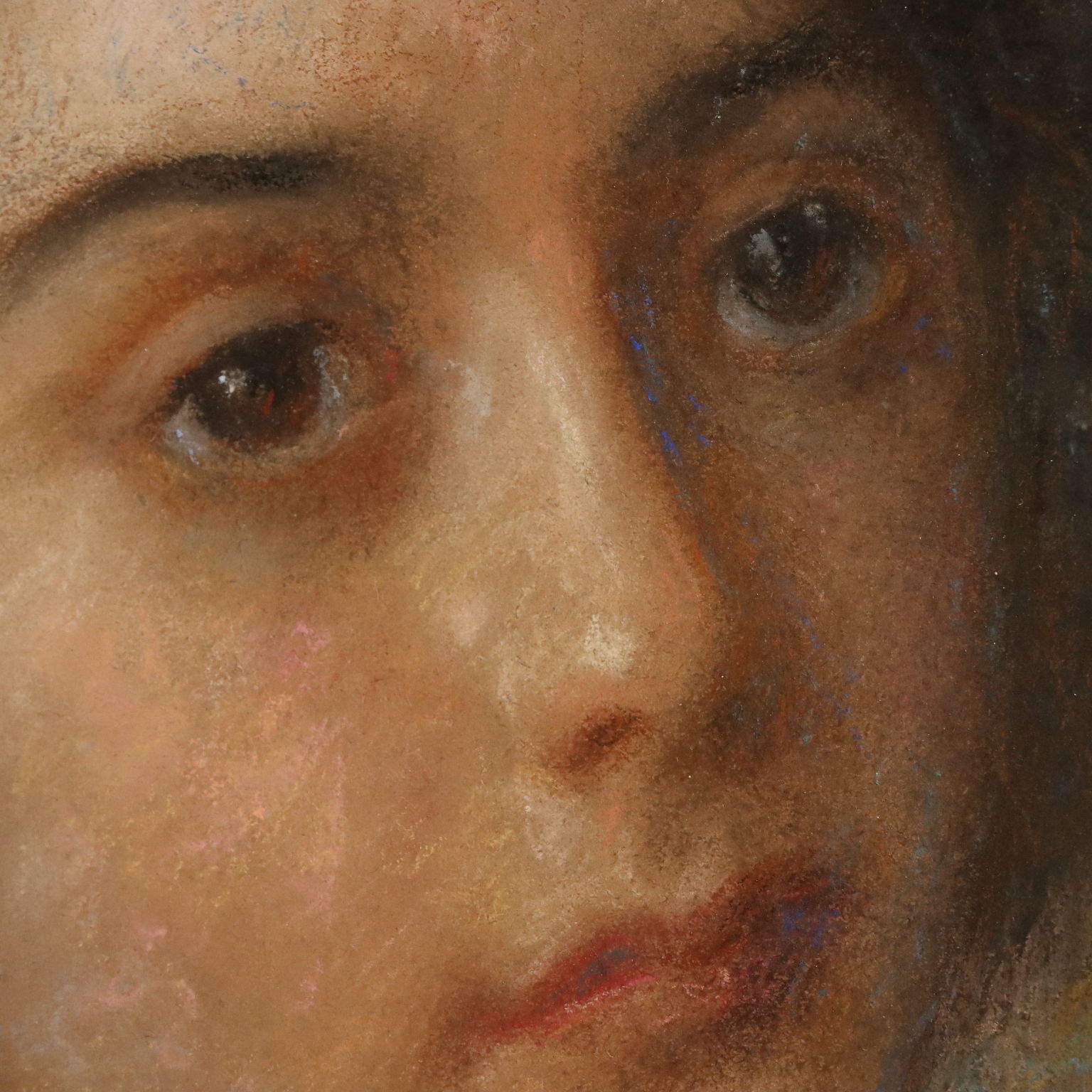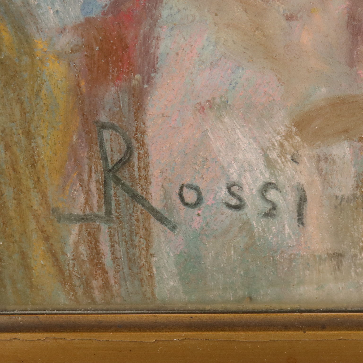 Pastelli su cartoncino. Firmato Rossi in basso a sinistra. Malinconico ed etereo ritratto di una giovane donna, dall' espressione seria e persa nei suoi pensieri, nonostante l'abito elegante e leggiadro, da festa. L'opera è presentata in cornice coeva.