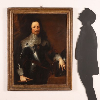 Olio su tela. E' il ritratto del principe Tommaso Francesco di Savoia (1596 -1656), capostipite del ramo Savoia-Carignano. Nel 1620 divenne infatti, per disposizione del padre, Principe di Carignano dando origine alla linea dei Savoia-Carignano, dalla quale discenderanno i futuri Re d'Italia di Casa Savoia. Questo ritratto deriva dall'originale del 1634 realizzato da Antoon Van Dick, oggi conservato alla Gemaldegallerie di Berlino, e successivamente riprodotto anche con acquaforte, da cui deriva probabilmente questa versione. Essa è leggermente diversa dall' originale in alcuni particolari:. è di formato più stretto, il bastone impugnato dal principe è più corto, è meno sviluppata la tenda a drappeggio alle spalle dell'uomo.. Il dipinto è stato restaurato e ritelato. E' presentato in cornice antica adattata alla tela.
