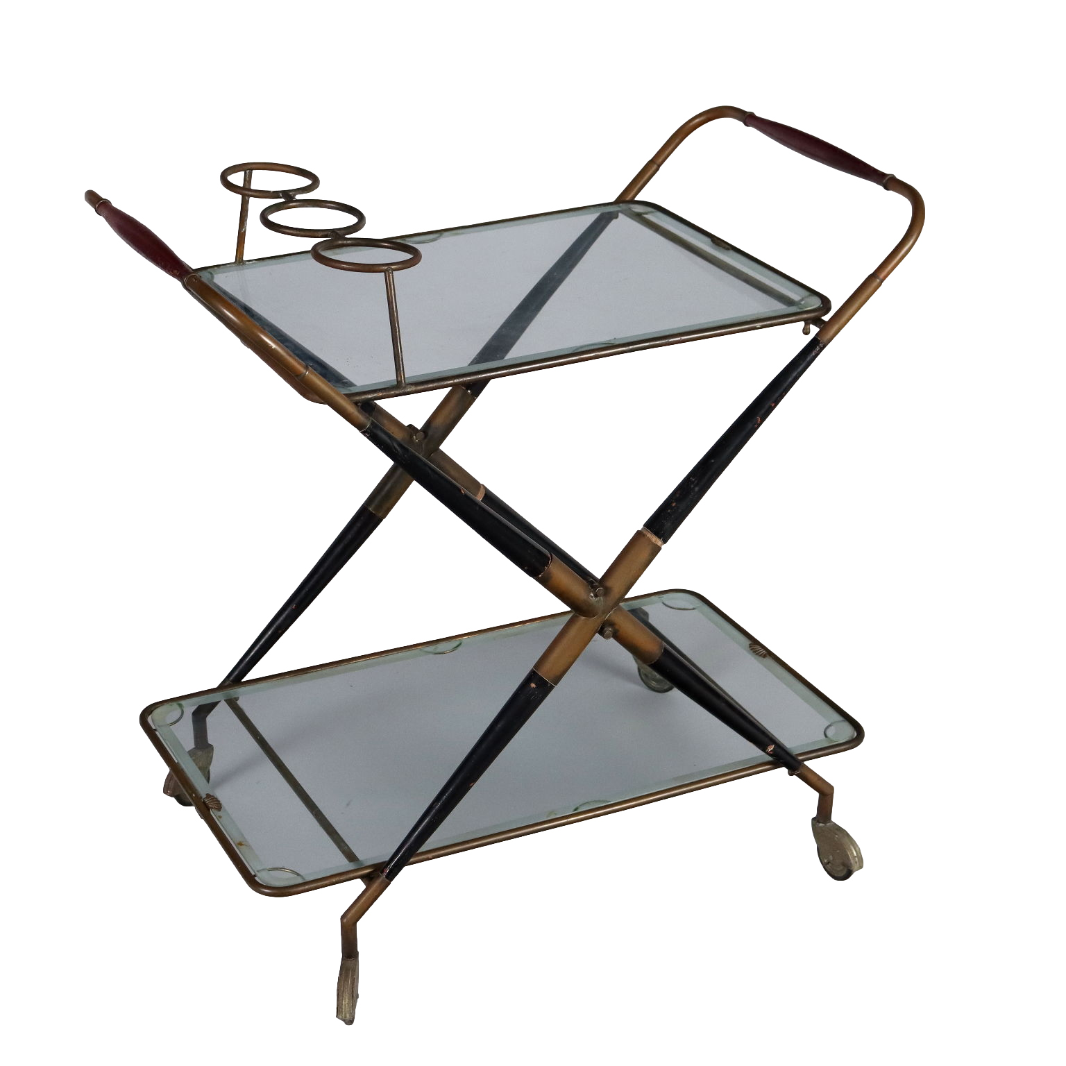 Carrello con doppio piano e vano porta bottiglie. Ottone, vetro e legno laccato.