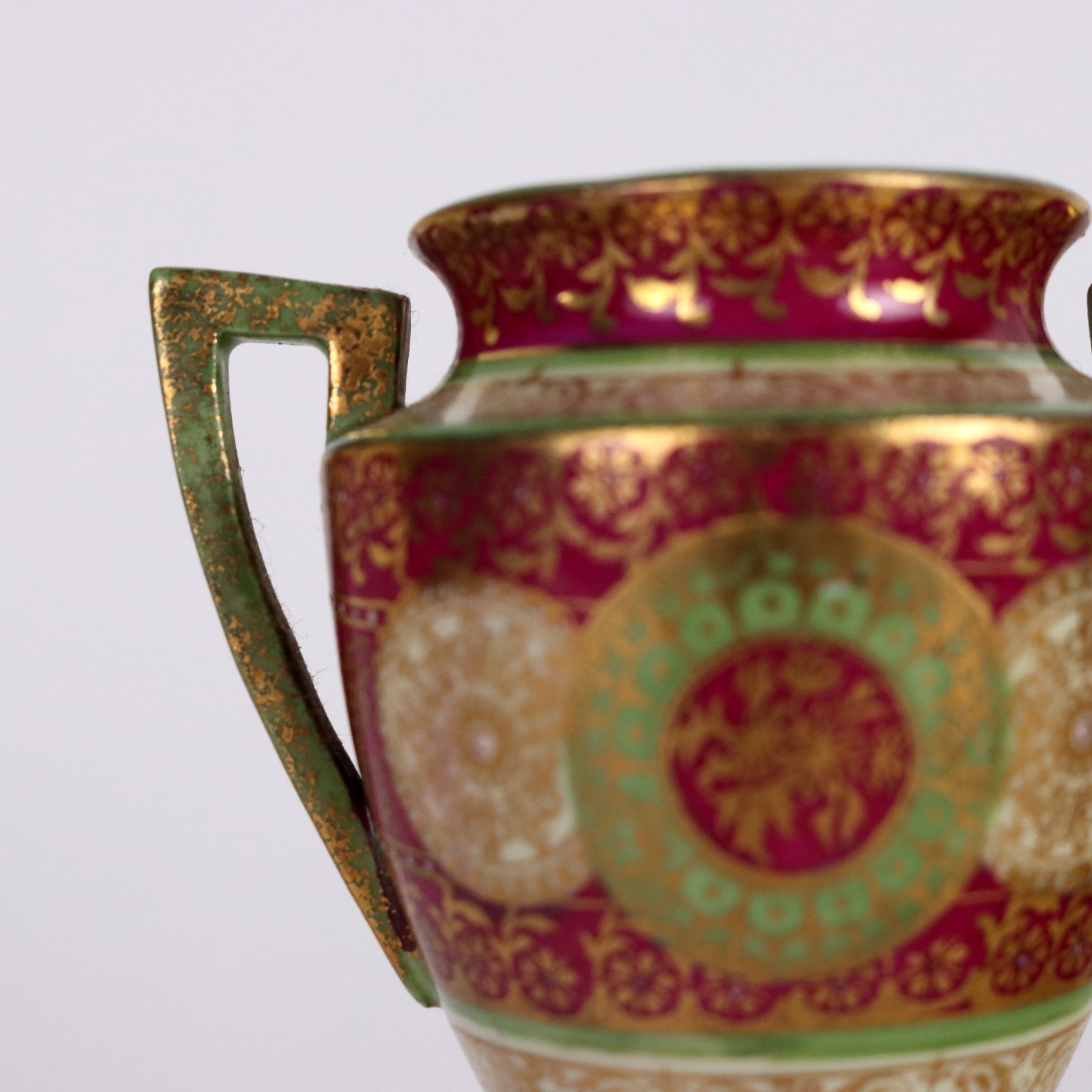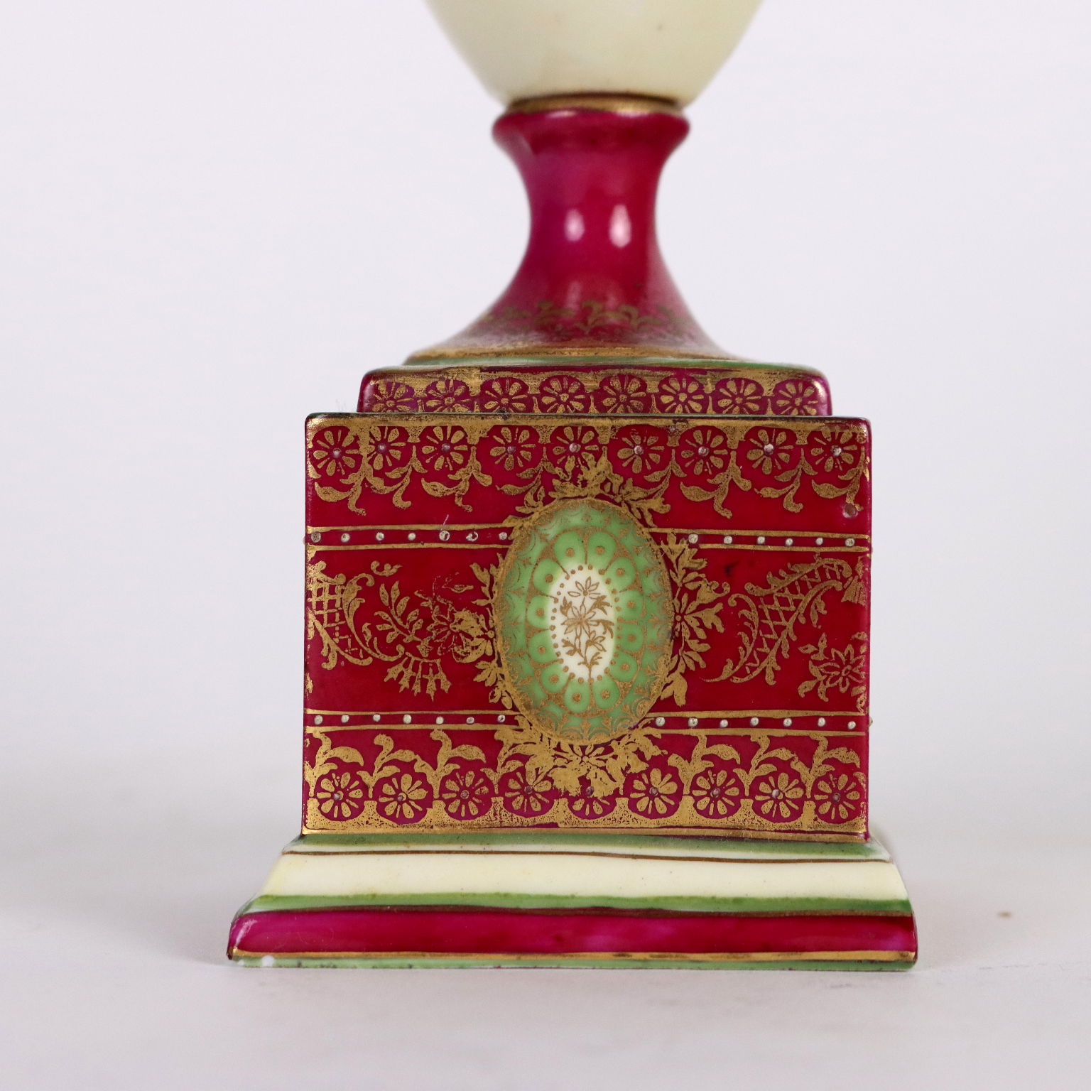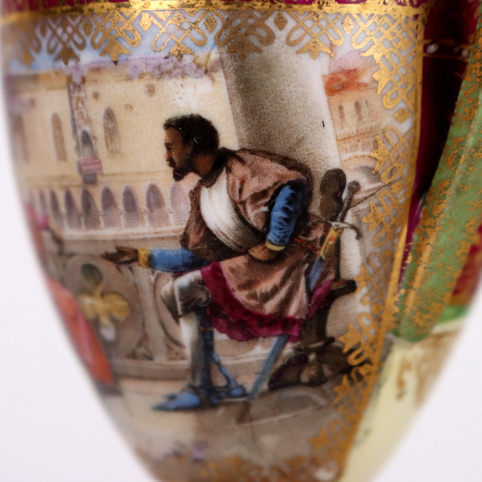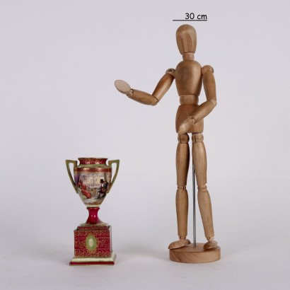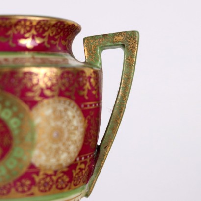 Piccolo vaso in porcellana policroma con ricchi decori in oro. Sulla pancia del vaso, in riserva, una scena raffigurante doge veneziano con un moro a decalcomania ritoccata. Sotto la base marchio della manifattura.