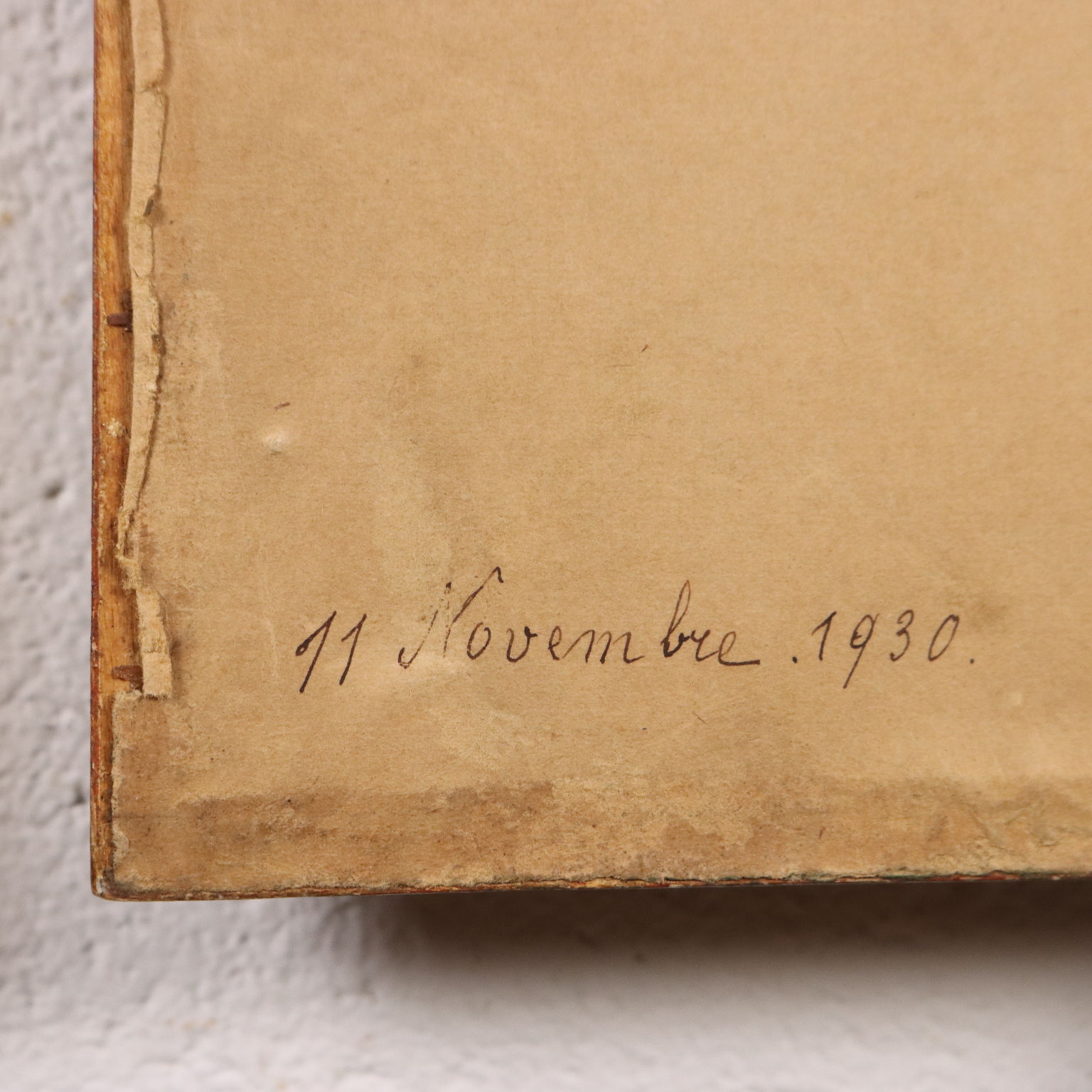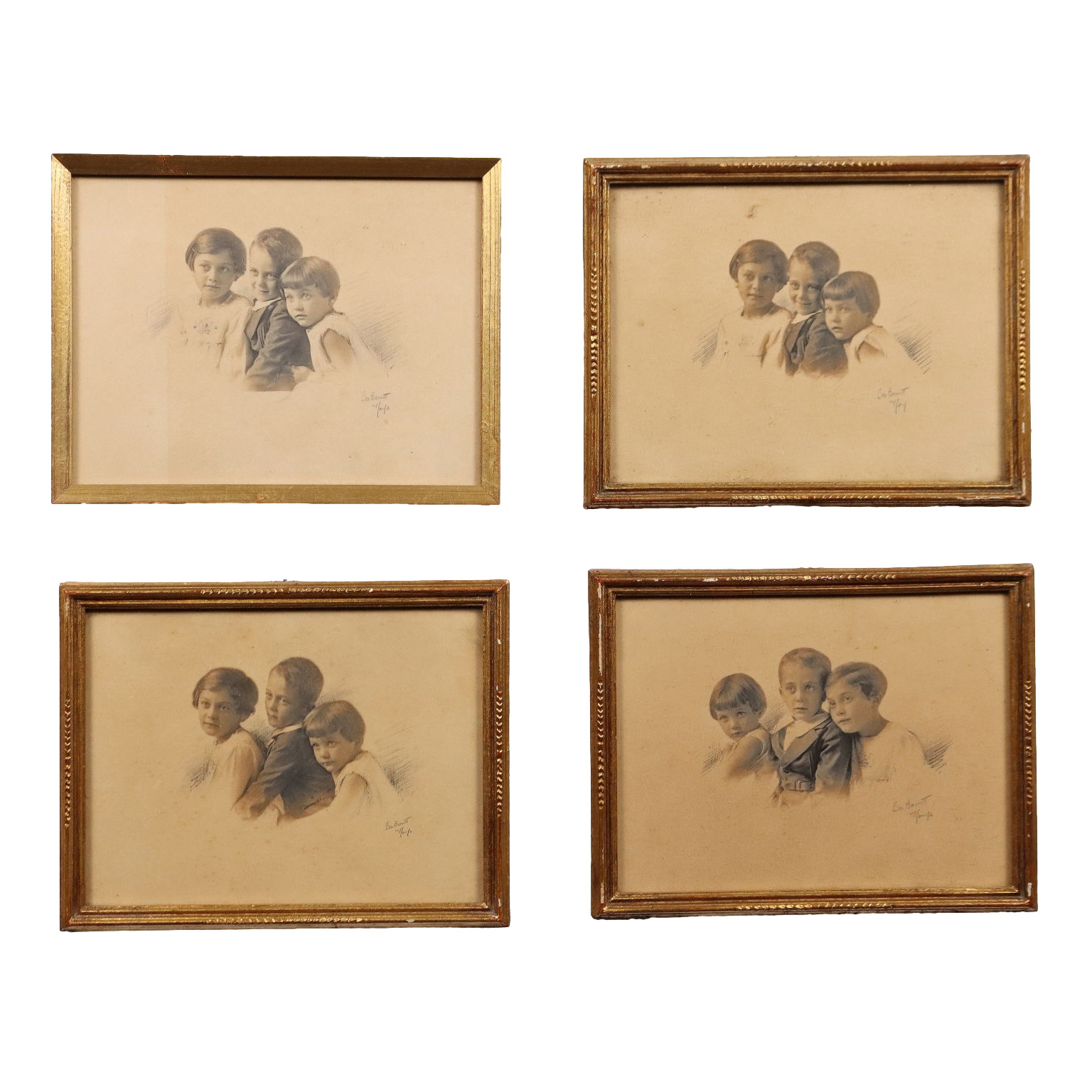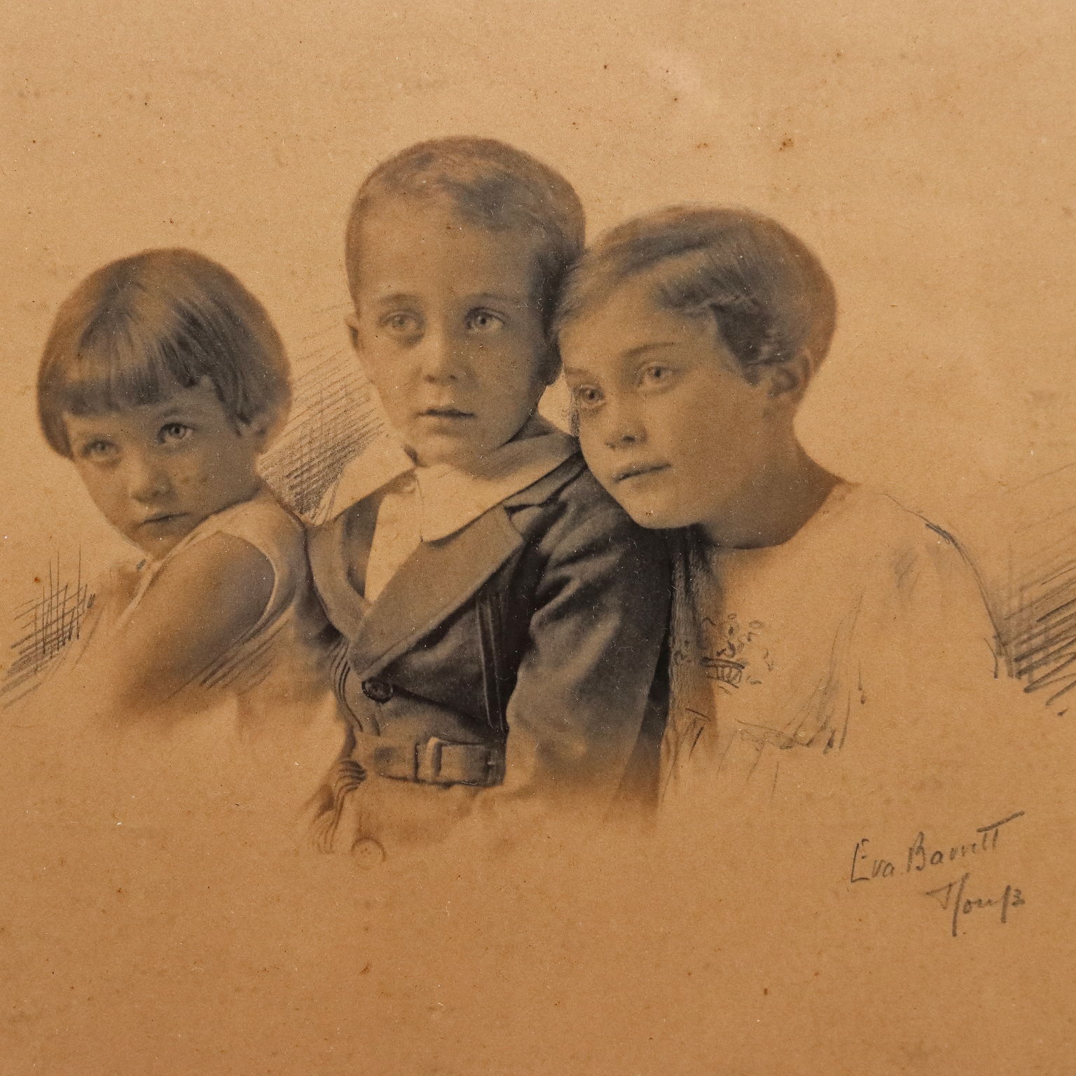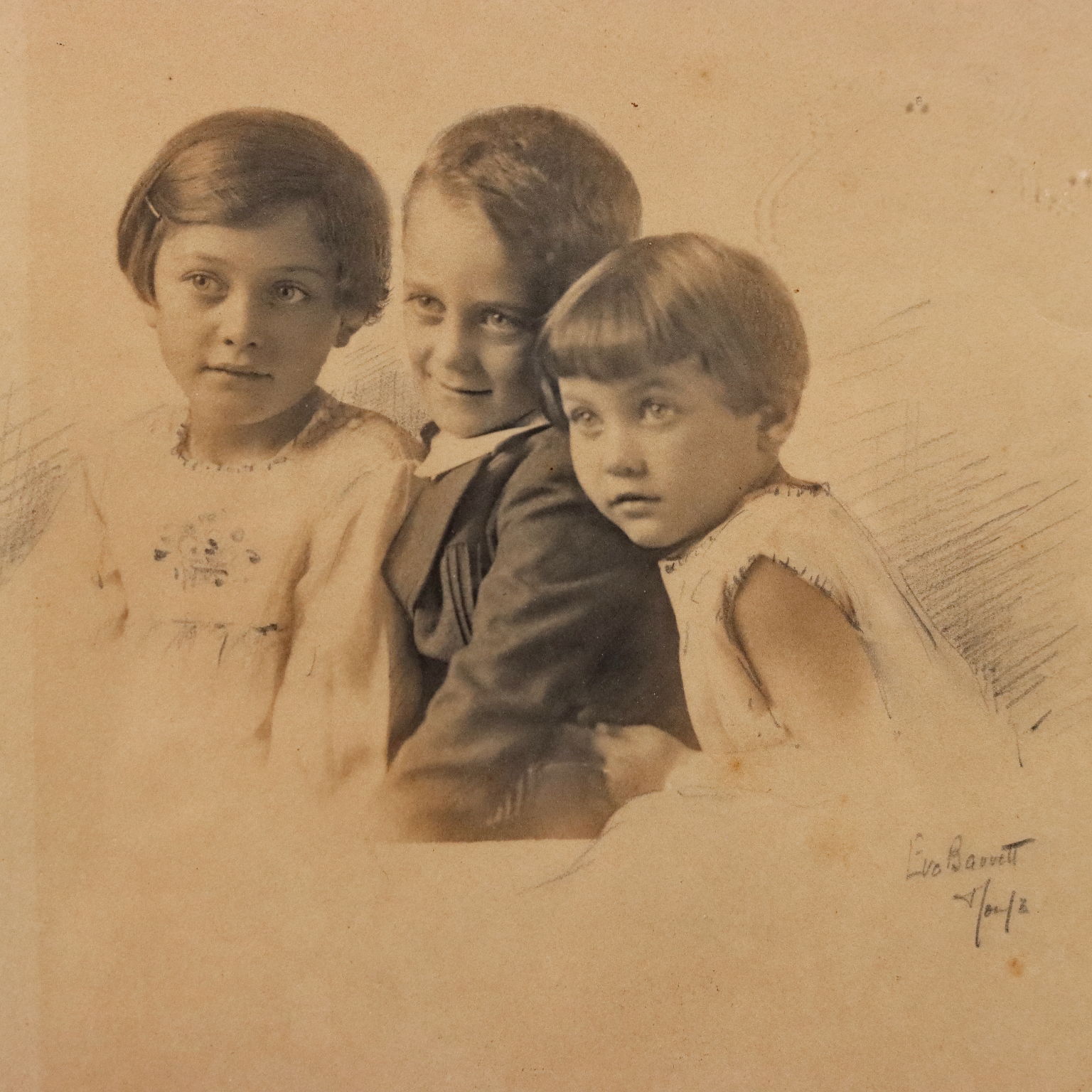 Fotografie ritoccate a pastelli. Firmate in basso a destra. Al retro di tre di esse la data 11 novembre 1930. E' proposta una sequenza fotografica del ritratto di tre bambini, che cambiano leggermente la posa o l'espressione. Sono opera della fotografa britannica Eva Barrett che, dopo una prima esperienza come pittrice, decise di dedicarsi alla fotografia, pensando che "fosse meglio essere una fotografa di prim'ordine che una [pittrice] di seconda qualità". Trasferitasi a Roma nel 1913, stabilì qui il suo laboratorio. Pittorialista, con una macchina di piccole dimensioni, Eva Barrett creò un proprio metodo fotografico che ricordava gli schizzi dei disegni: applicava pochi leggerissimi tratti di matita riuscendo a realizzare immagini sottotono ma dai neri particolarmente densi, mantenendo così le caratteristiche della fotografia e del ritratto. In questo modo ebbe notevole successo e la sua carriera decollò. Eva Barrett fotografò la famiglia reale italiana, le mogli e i figli di ambasciatori stranieri, nonché ricevette numerose commissioni dai reali europei in Belgio, Svezia, Grecia. I quattro ritratti sono presentati in cornici in stile.