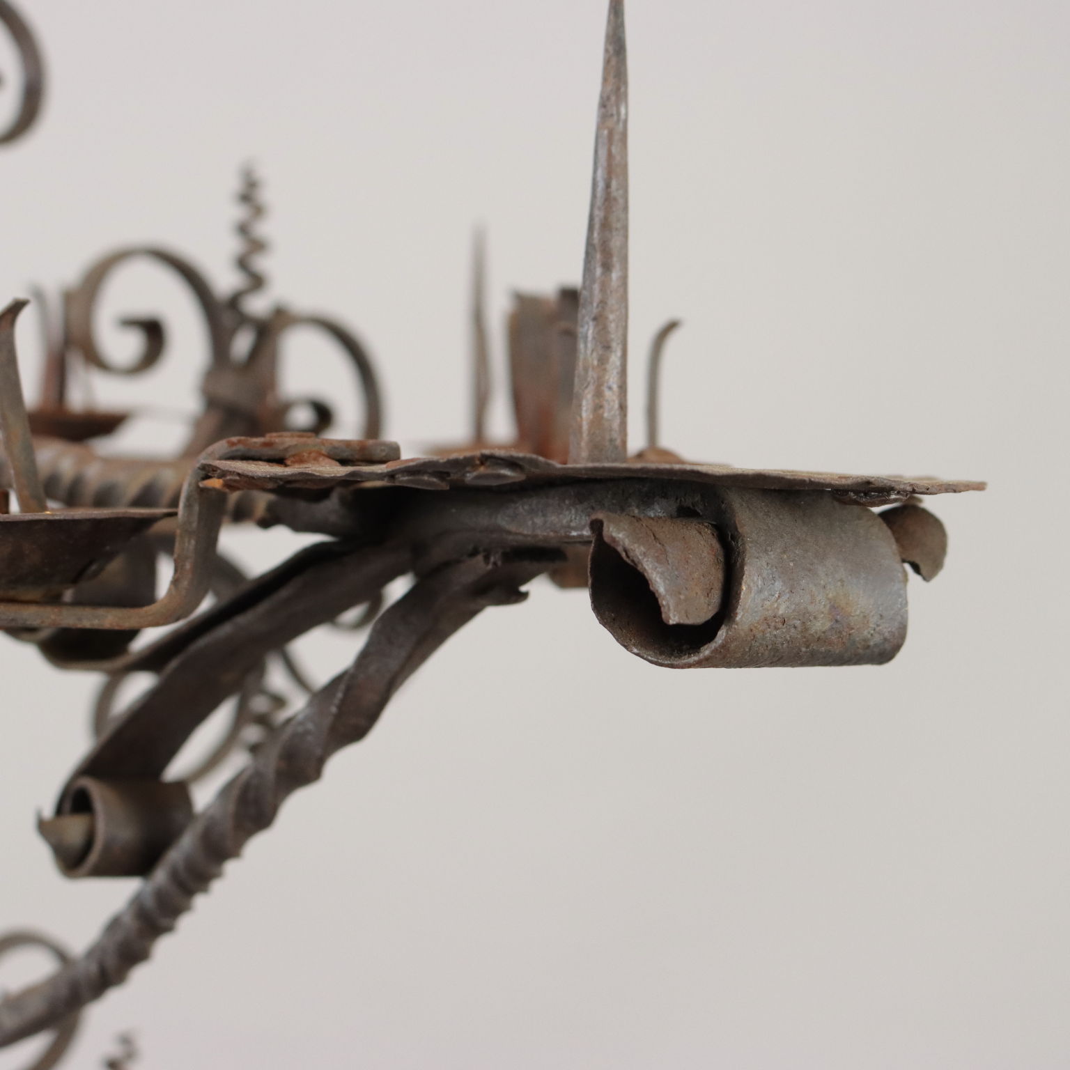 Torciere neorinascimento in ferro battuto lavorato con motivo a ricciolo, presenta alloggi per 16 candele e 4 angolari, più uno centrale per ceri.