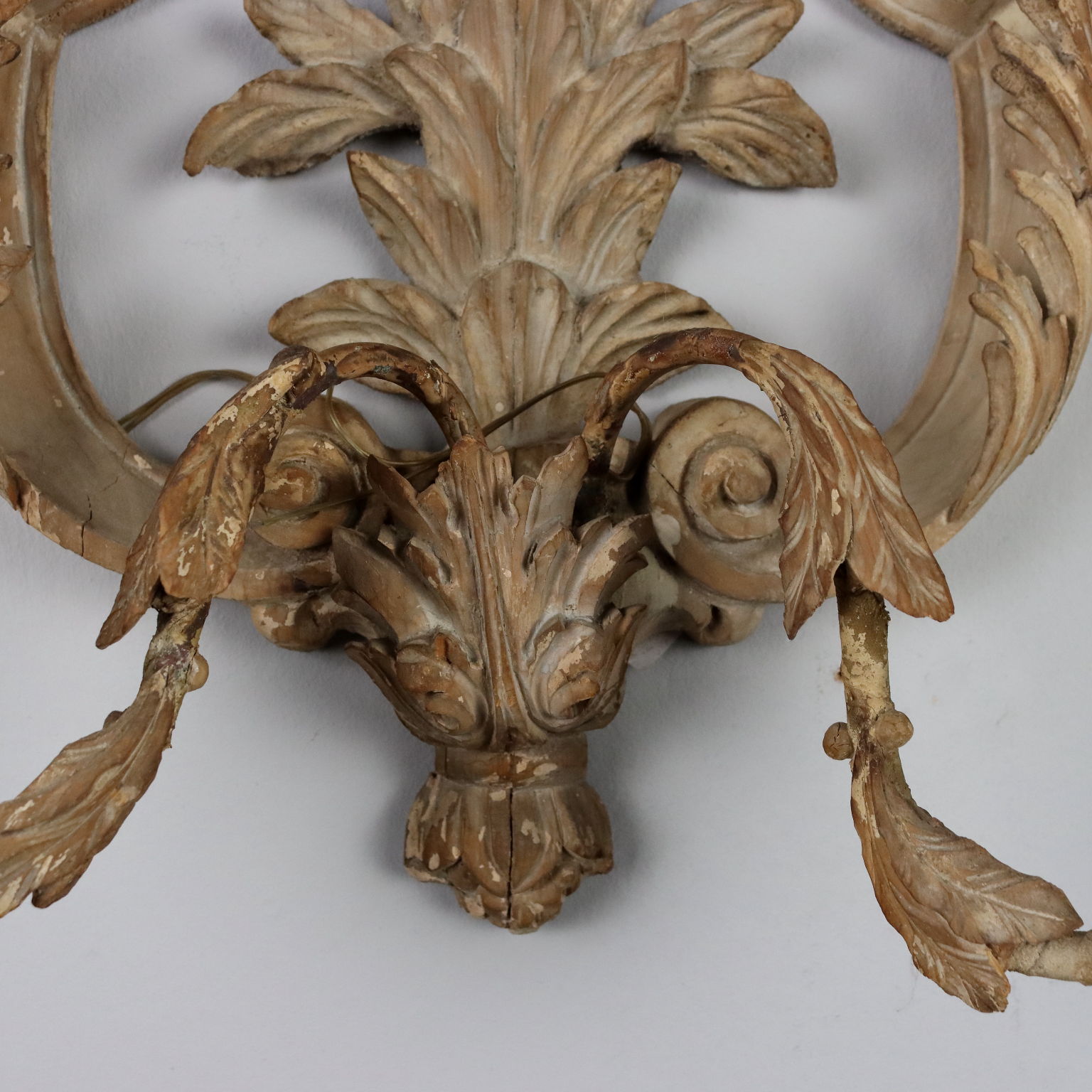 Applique in stile impero a due luci in legno intagliato e parti in pastiglia, Italia XX secolo. Struttura a lira con decorazioni intagliate ad elementi fogliacei e sulla sommità volto in stucco. "Corde" in metallo dorato.