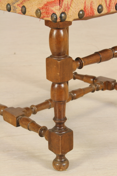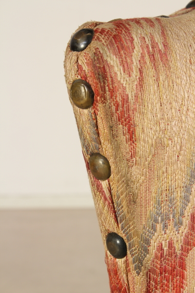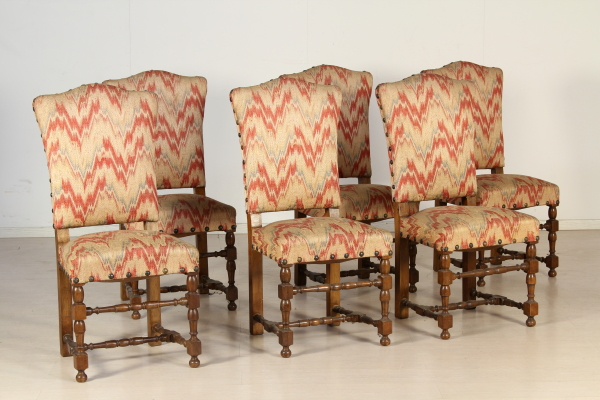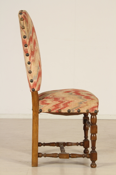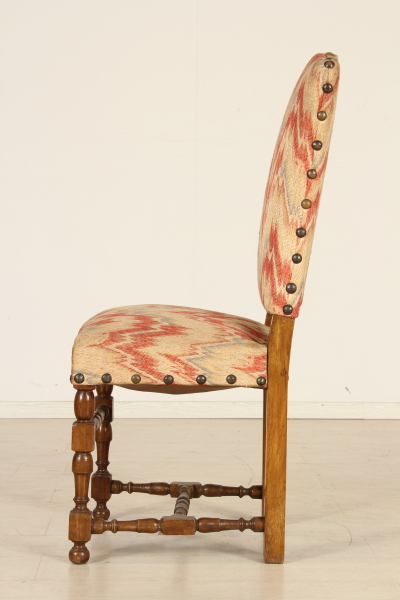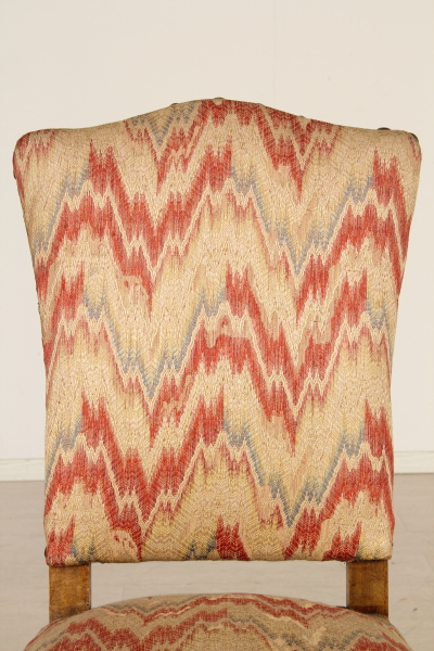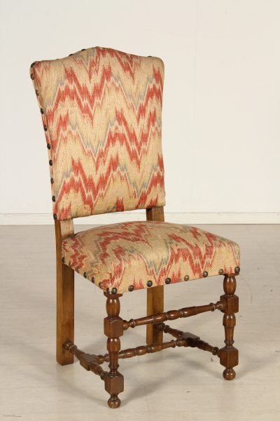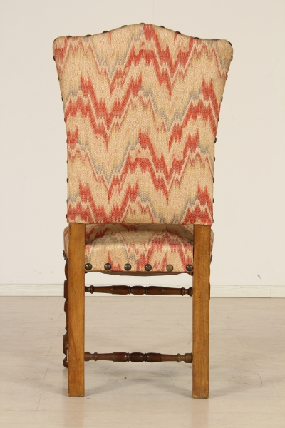 Sedie a gambe anteriori tornite raccordate da traverse, schienale e sedute imbottite.