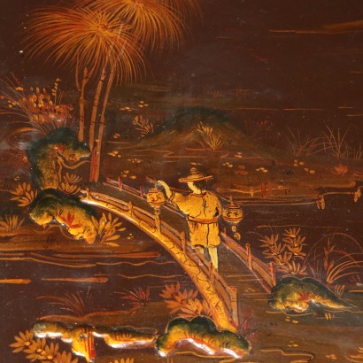 Tavolino in stile chinoiserie. sorretto da gambe mosse terminanti a ricciolo, è laccato e dipinto con motivi di gusto chinoiserie. Il piano è decorato a rilievo e dipinto con paesaggi e personaggi orientali; è protetto da un ripiano in vetro.