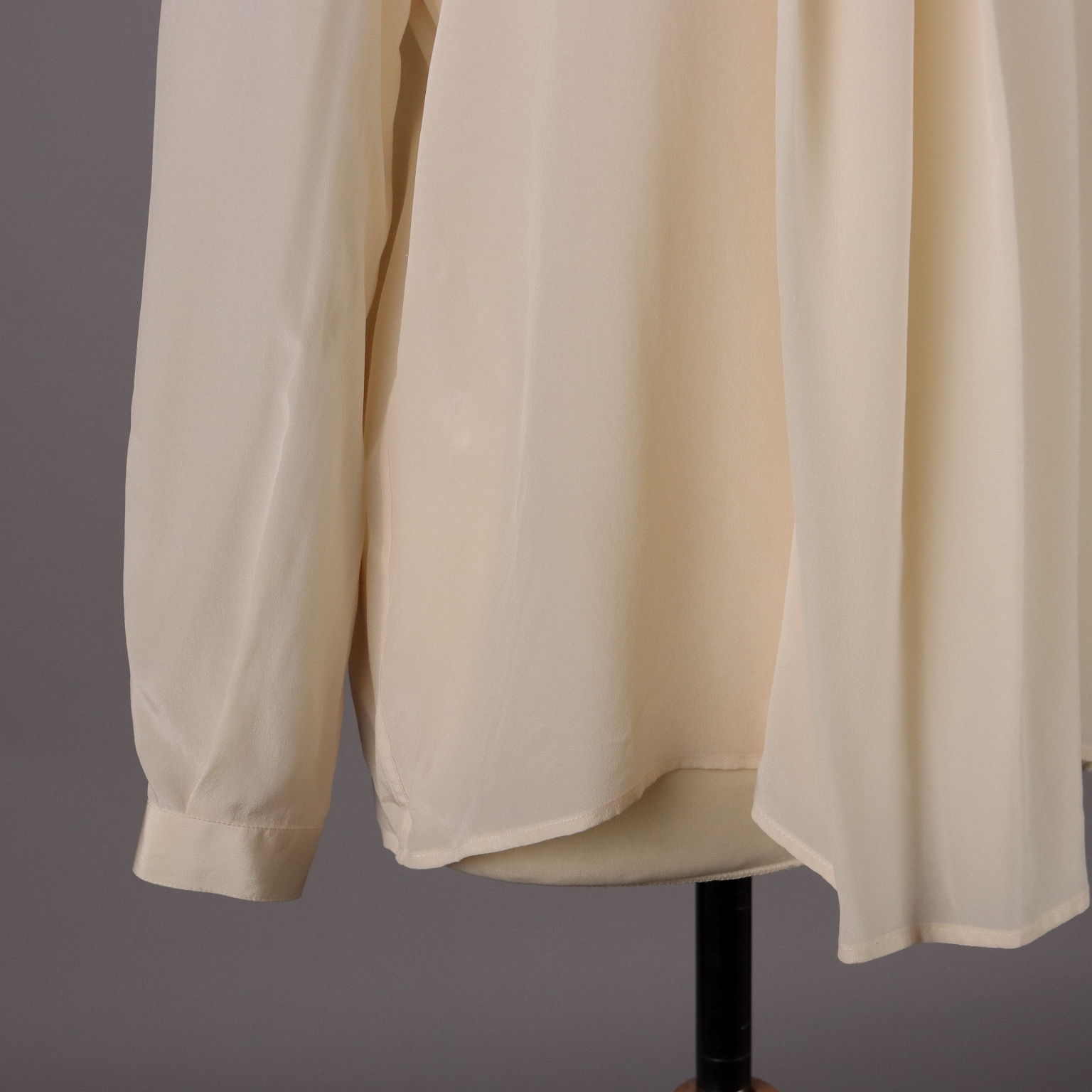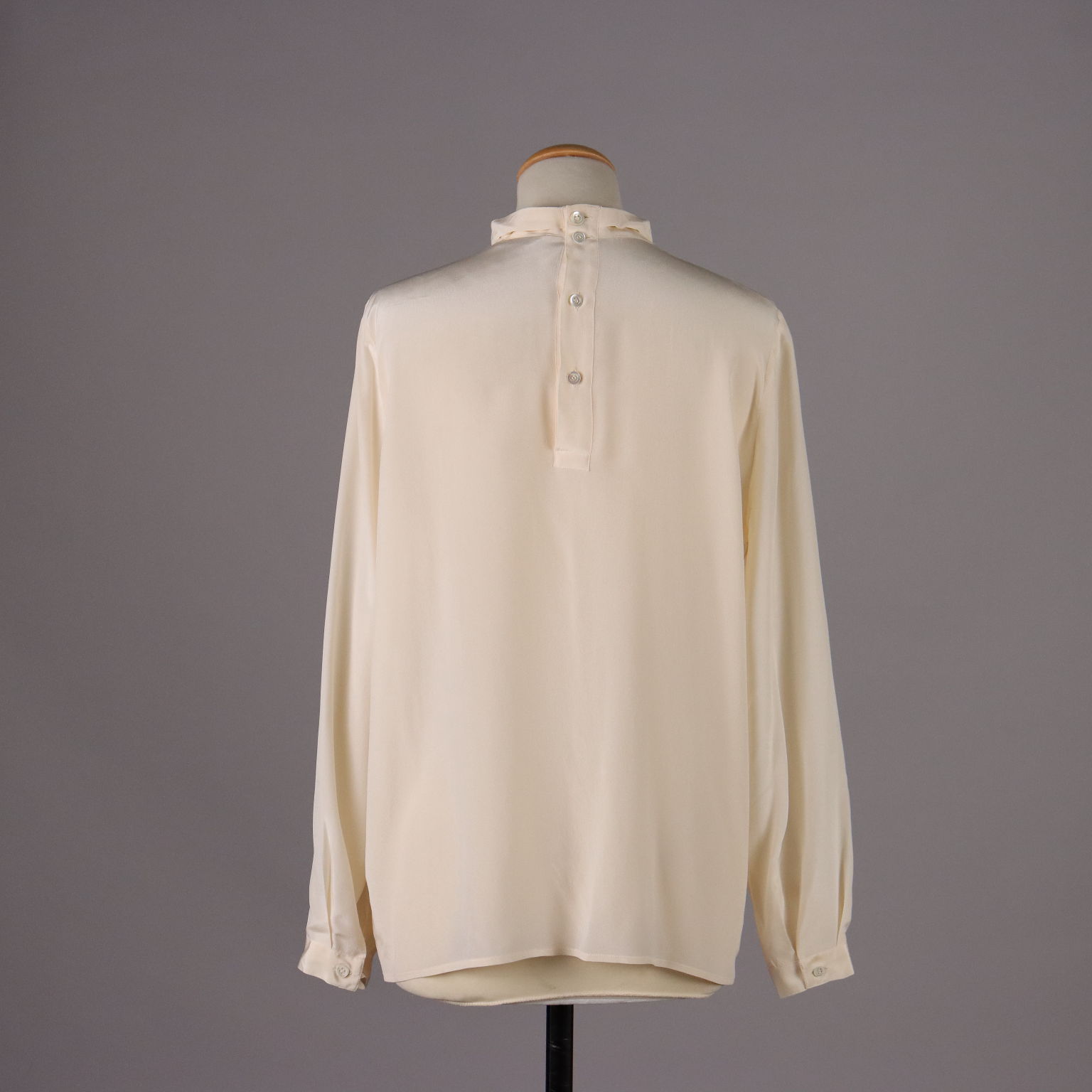 Elegante e raffinata blusa in pura seta color avorio a girocollo, con un bellissimo drappo che casca lungo il tessuto, come a imitare un foulard annodato al collo. Mani è una linea di Armani nata nella fine degli anni '70, prodotta fino alla fine degli anni '90.