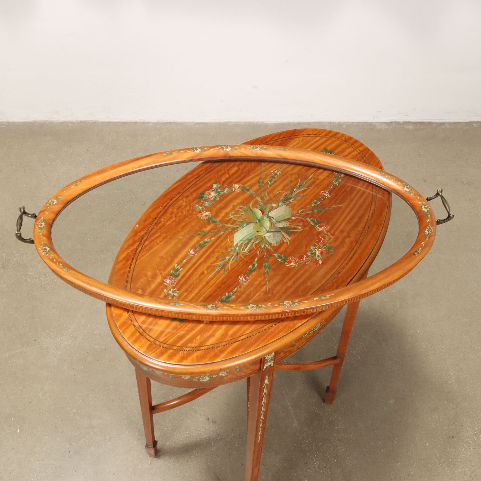 Tavolino da servizio in mogano biondo in stile Giorgio IV, Inghilterra inizio XX secolo. Piano a vassoio amovibile in vetro con maniglie in ottone. Sorretto da quattro gambe troncopiramidali raccordate da traverse. La struttura è decorata da elementi dipinti, tra cui ghirlande floreali e da trofeo musicale posto al centro del piano. Ulteriormente abbellito da filettature intarsiate.