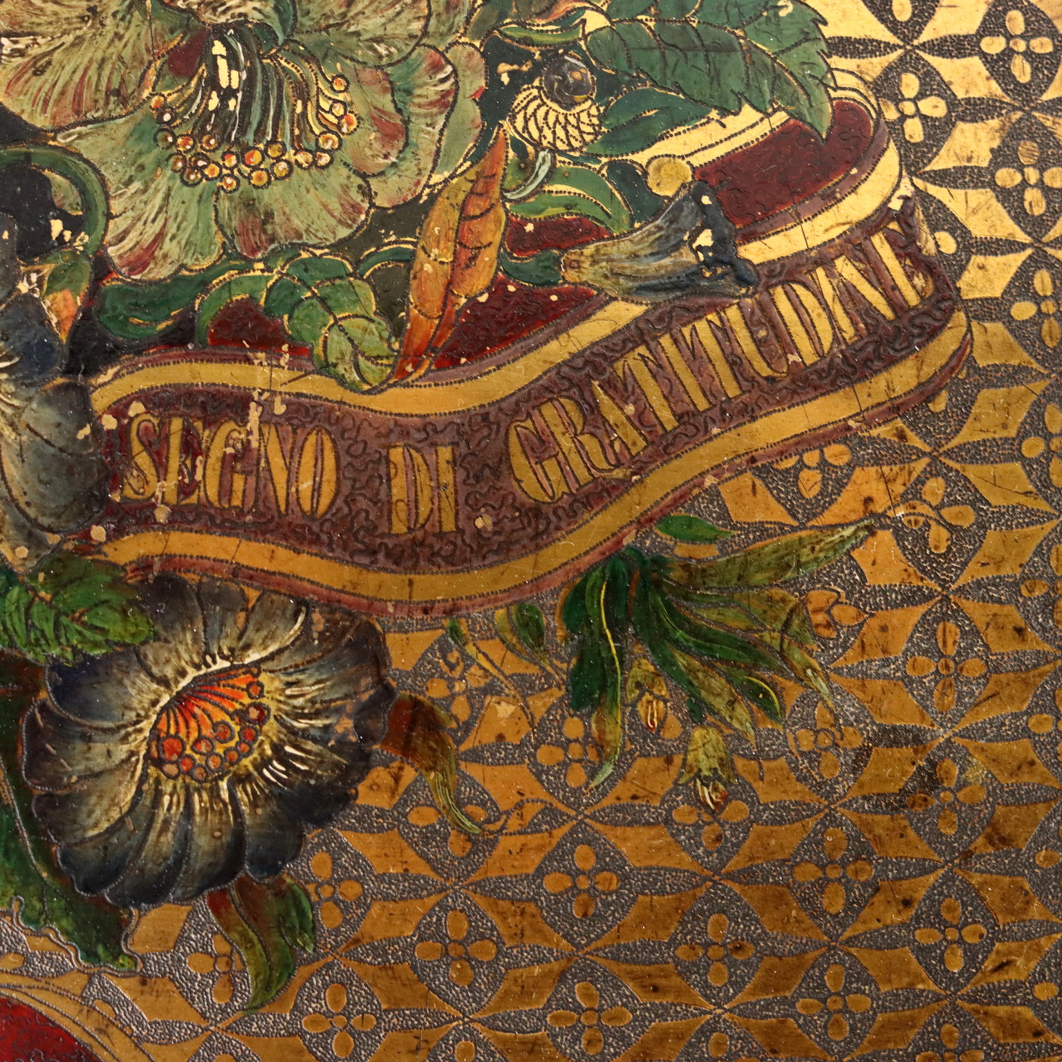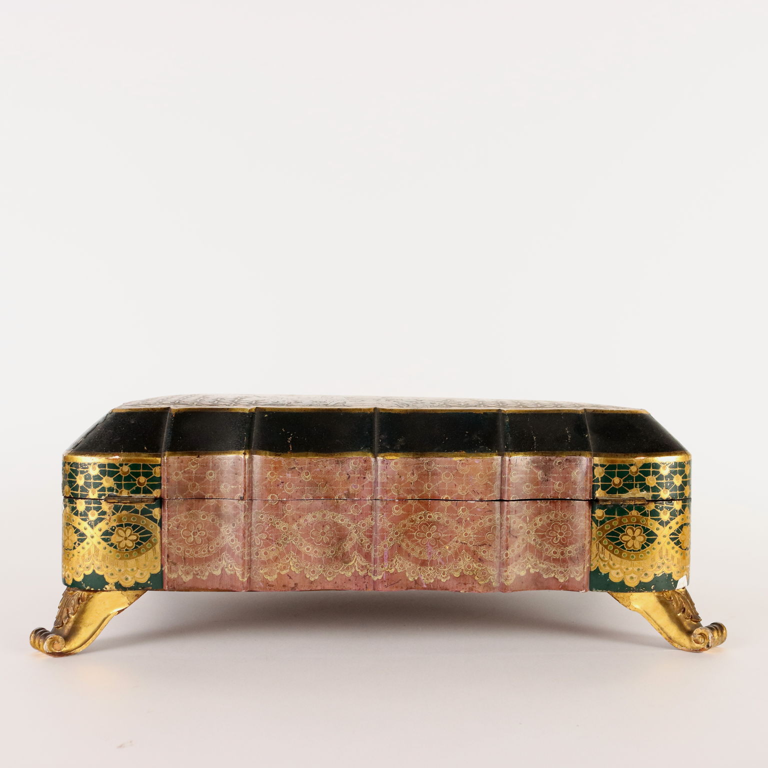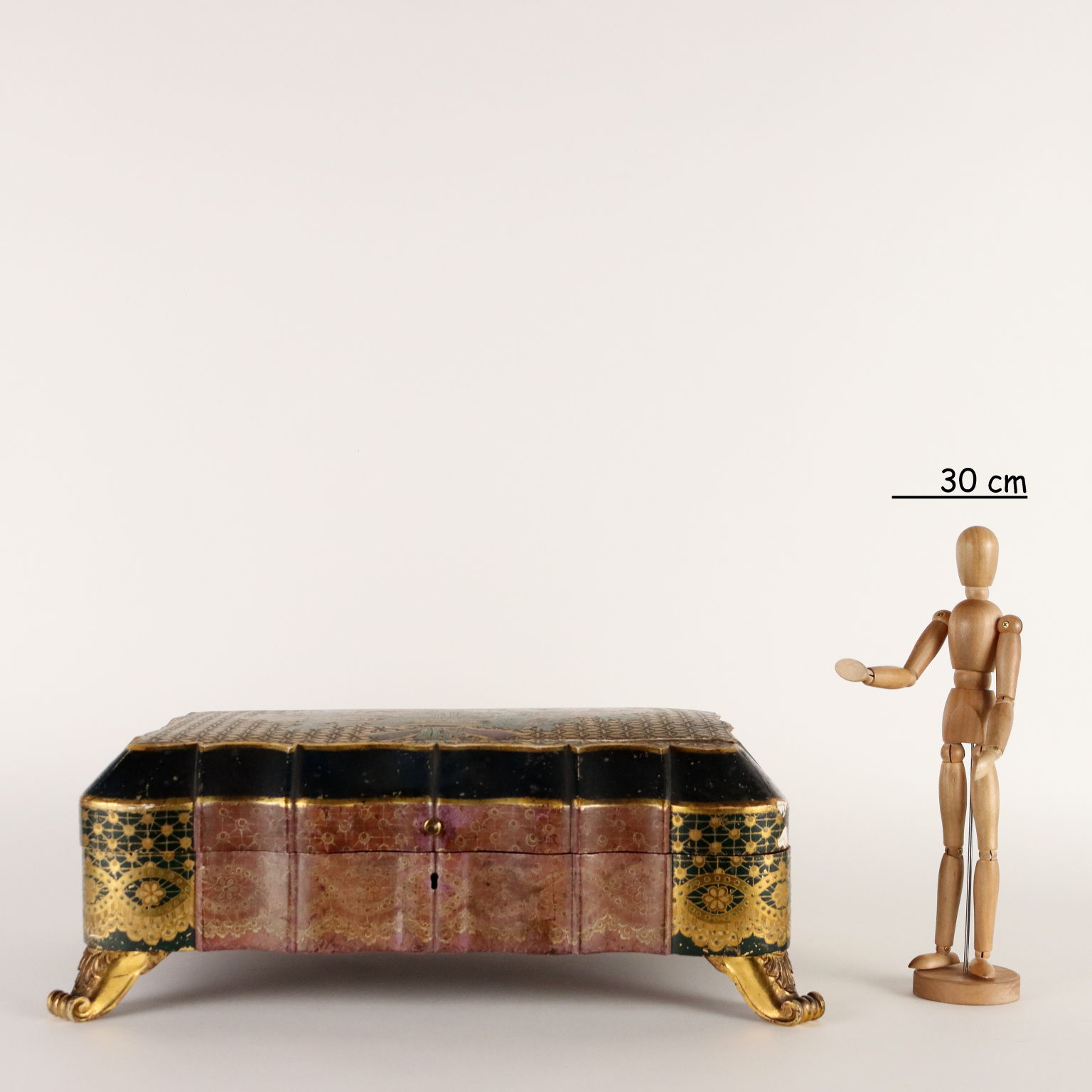 Scatola a Chinoiserie in legno laccato e dorato a forma rettangolare retta da quattro piedini chiusi a ricciolo. Fasce laterali sagomate con ricchi decori in oro a greche e motivi ripetuti. Sul coperchio mazzo di fiori dipinto a policromia con dedica su fondo dorato e inciso a motivi ripetuti. Interno rivestito in velluto. Maniglie in bronzo dorato con mascherone.
