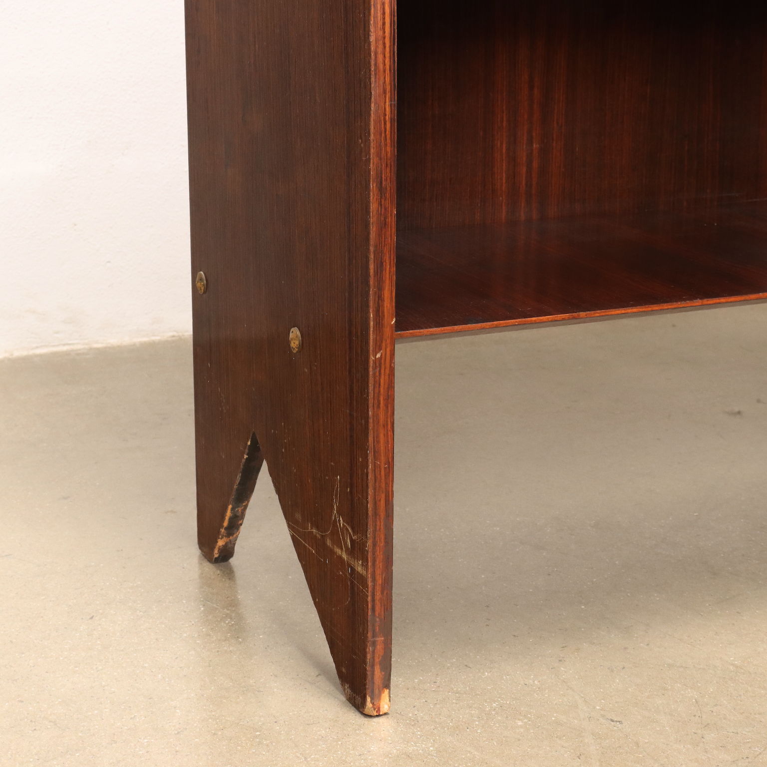Piccola libreria con ripiani a giorno, contenitore a ribalta e a cassetti. Legno impiallacciato legno esotico.
