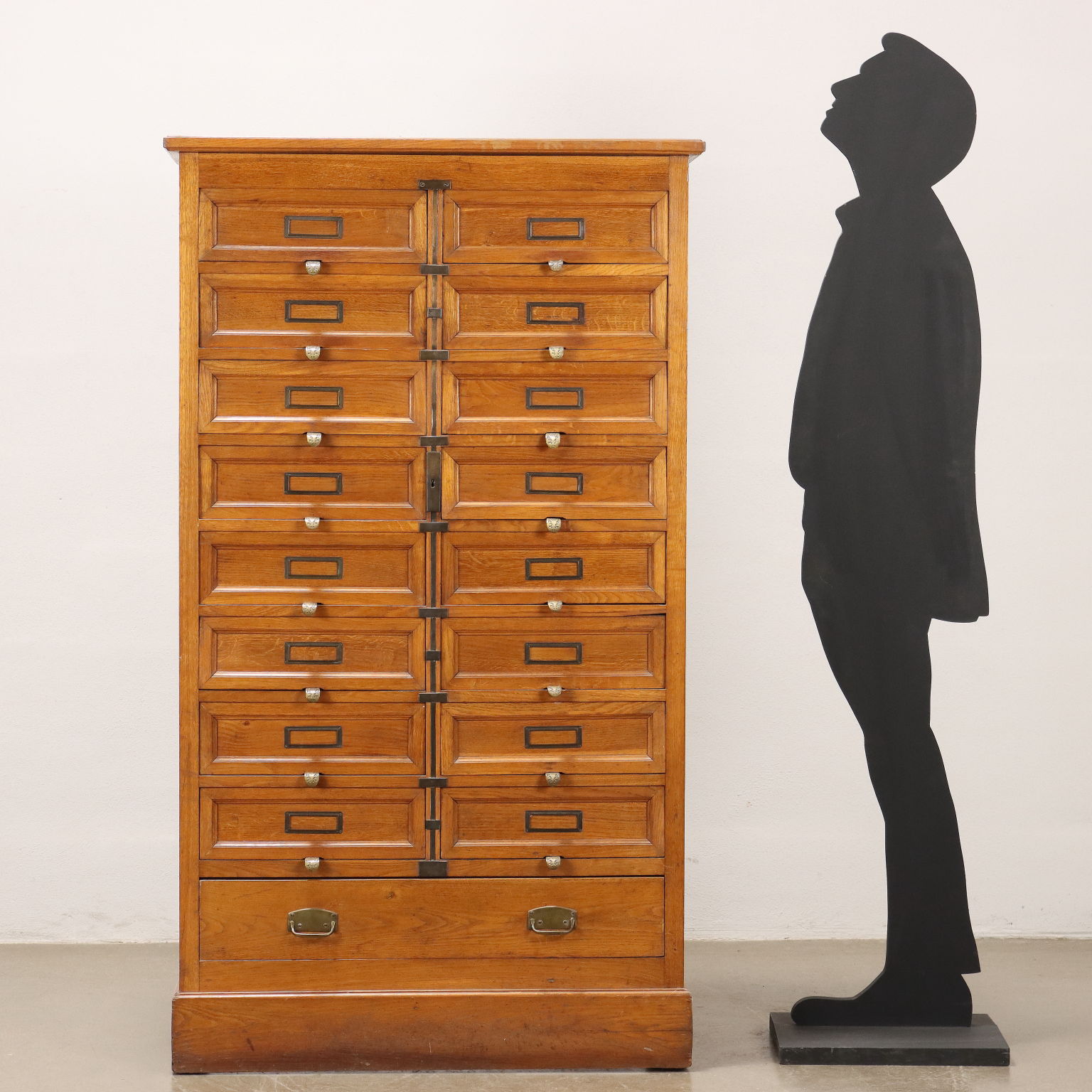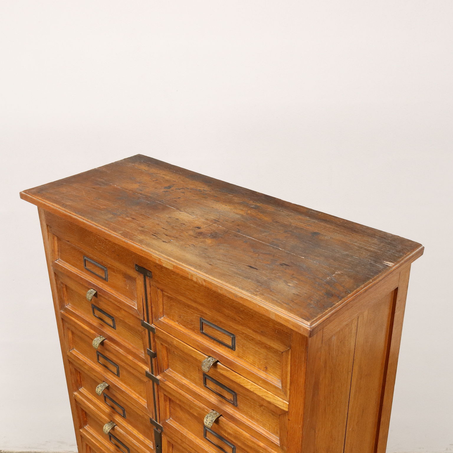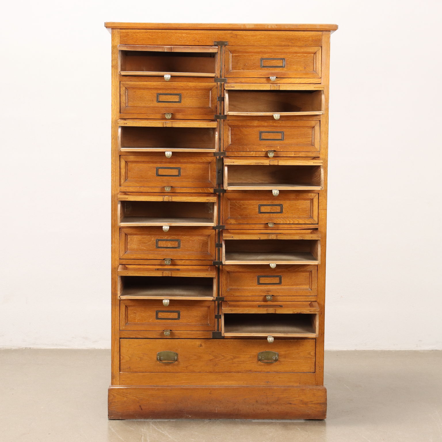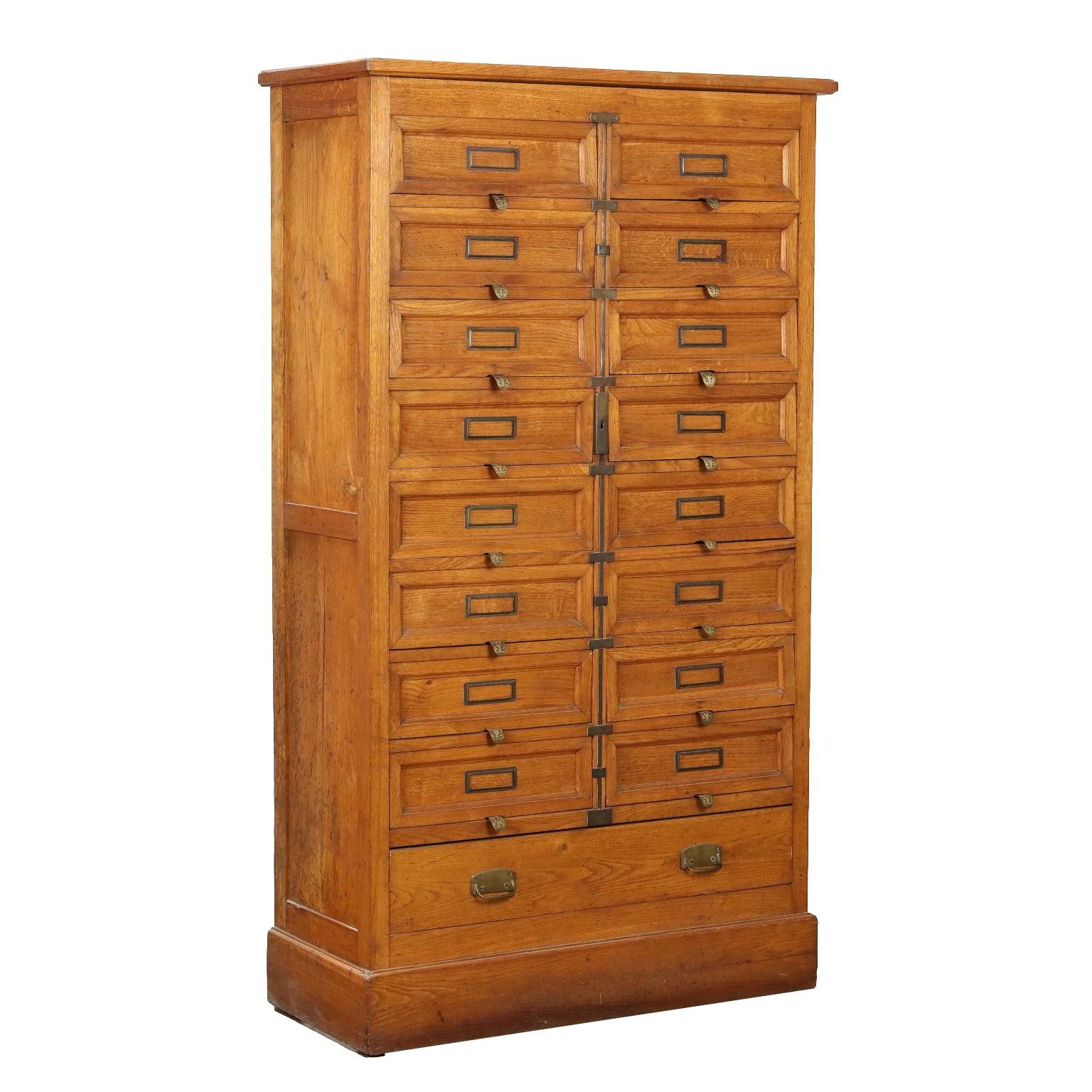 Schedario in rovere con cassetto nella fascia inferiore e due file da 8 cassetti con fronte apribile estraendo la presa in bronzo; serratura centrale che consente il blocco di tutta la cassettiera. In rovere.