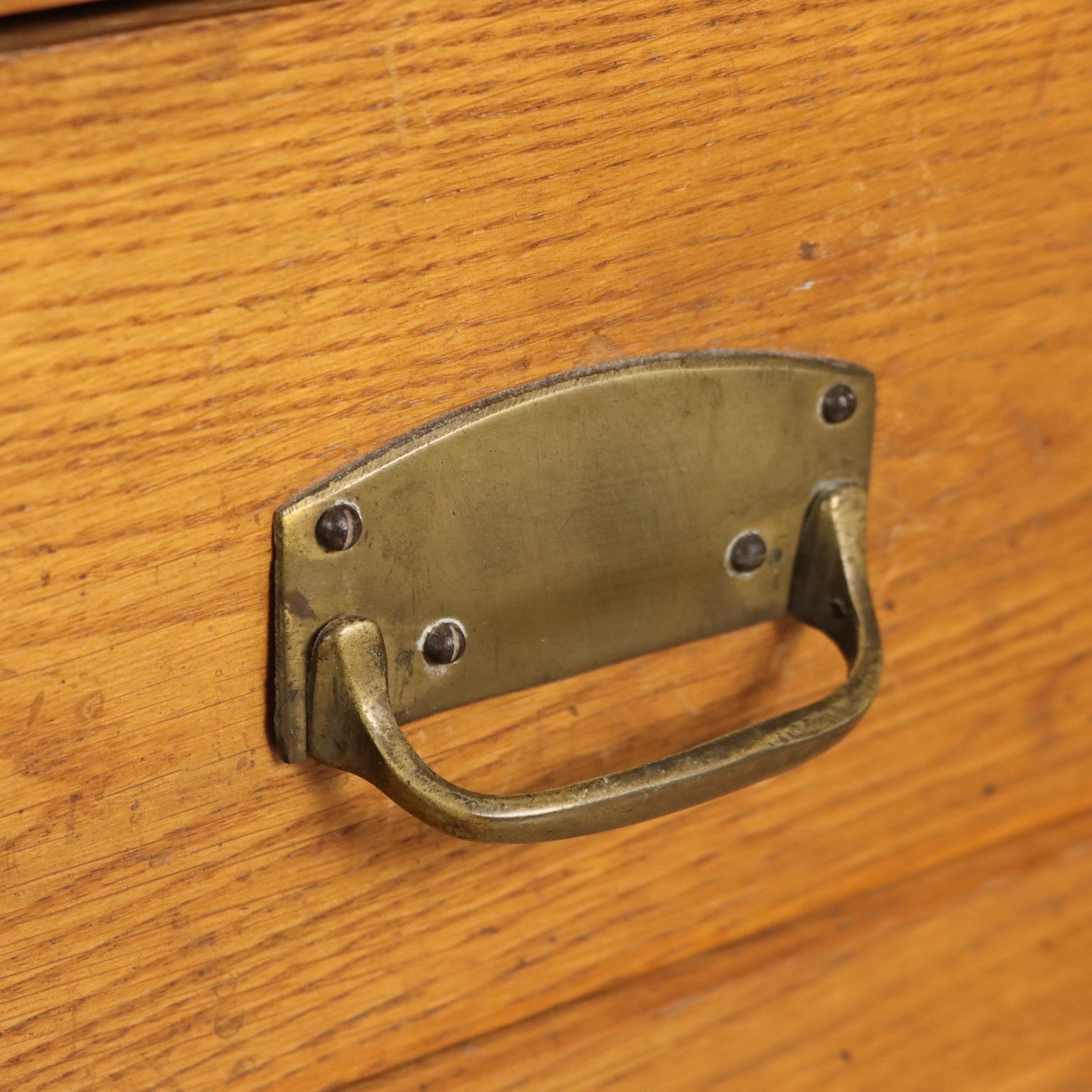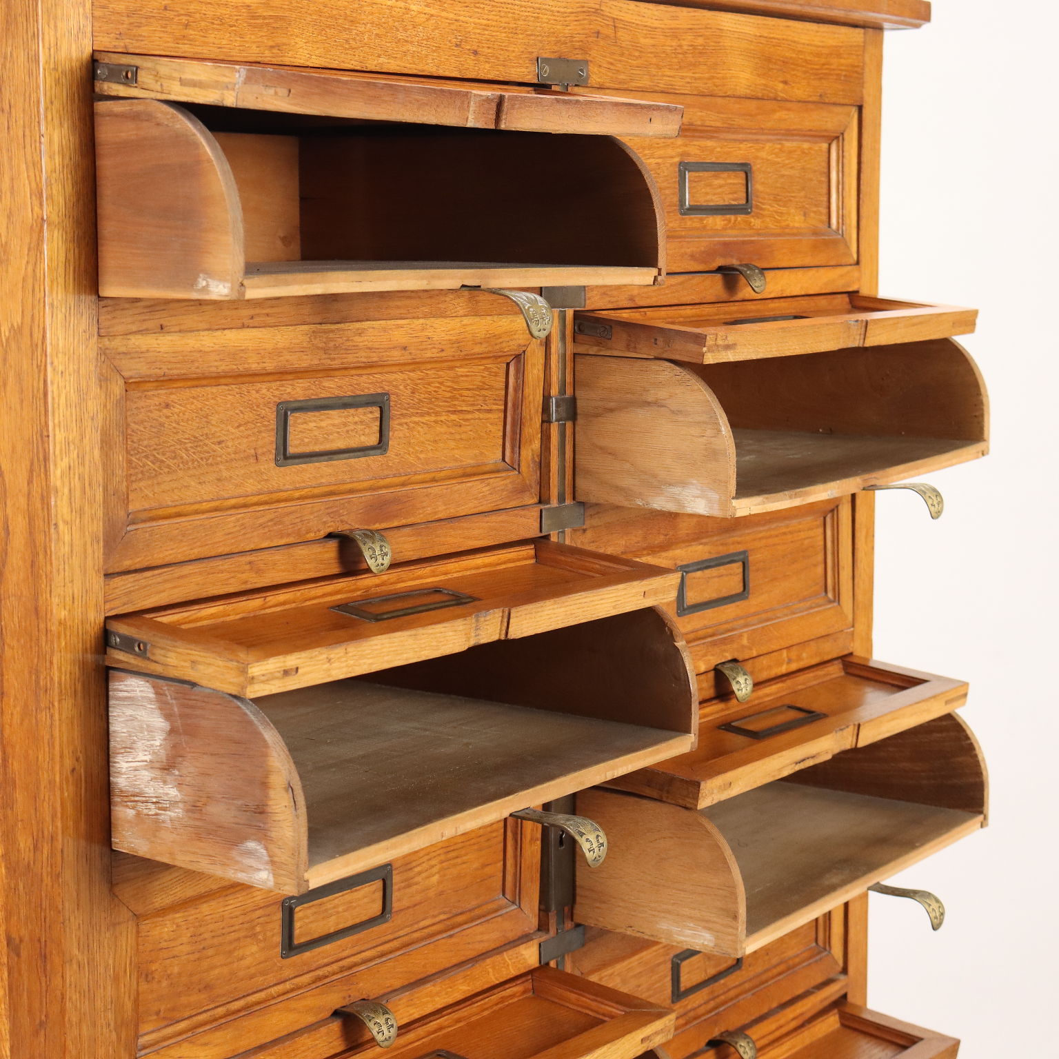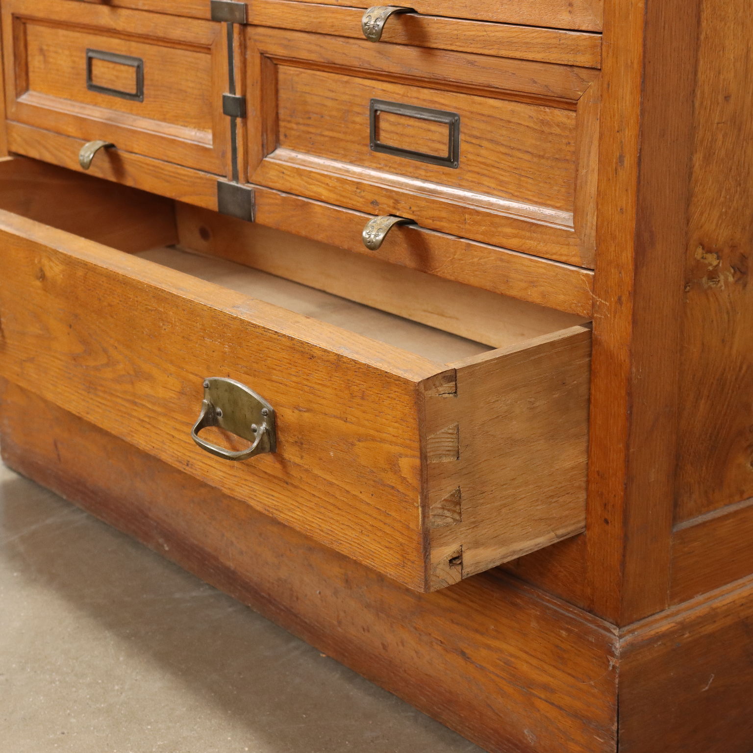 Schedario in rovere con cassetto nella fascia inferiore e due file da 8 cassetti con fronte apribile estraendo la presa in bronzo; serratura centrale che consente il blocco di tutta la cassettiera. In rovere.