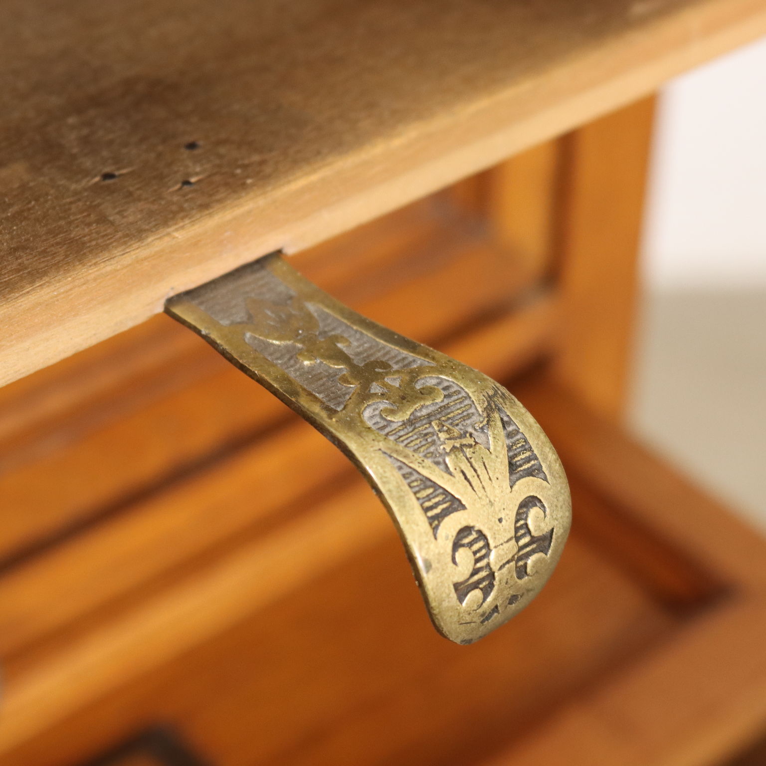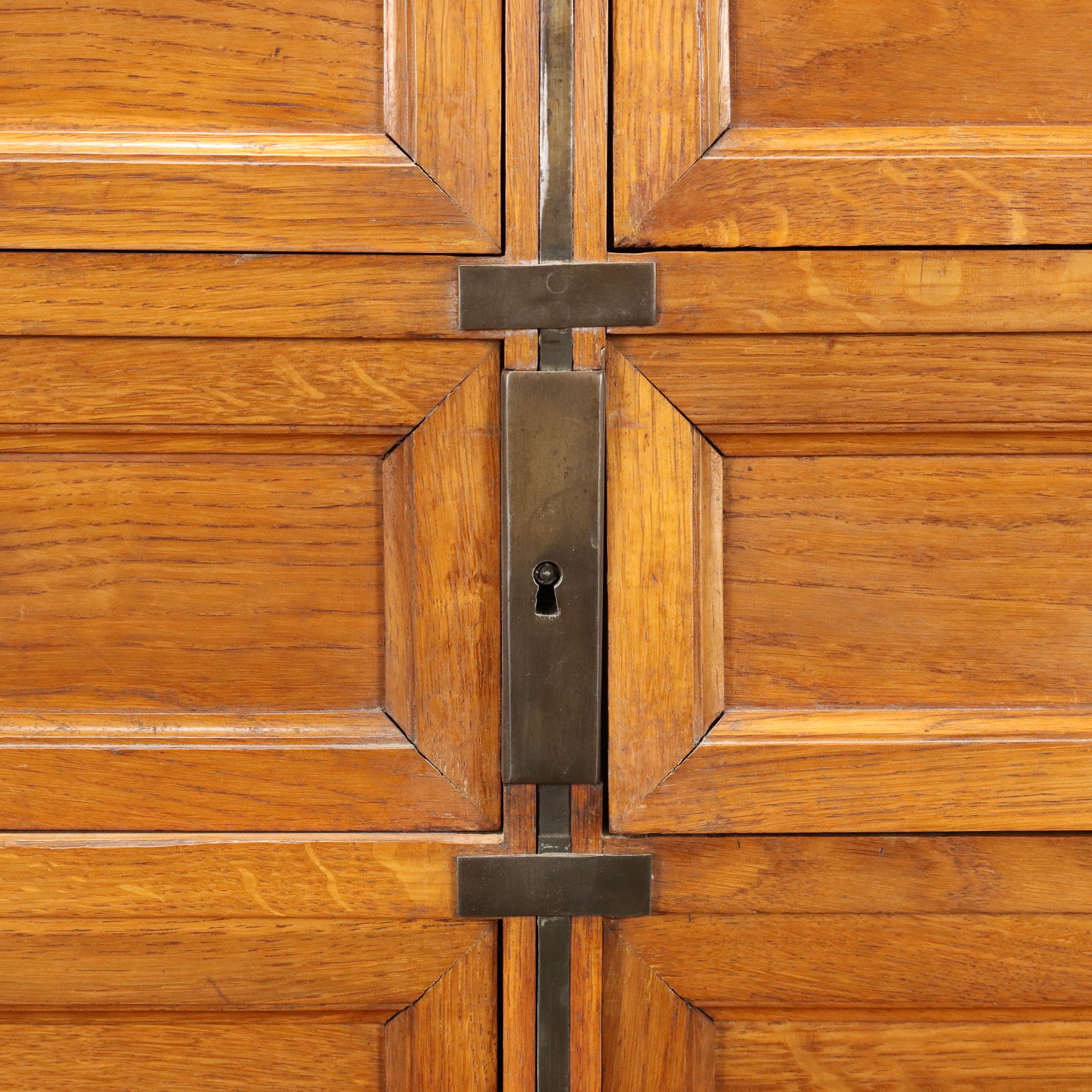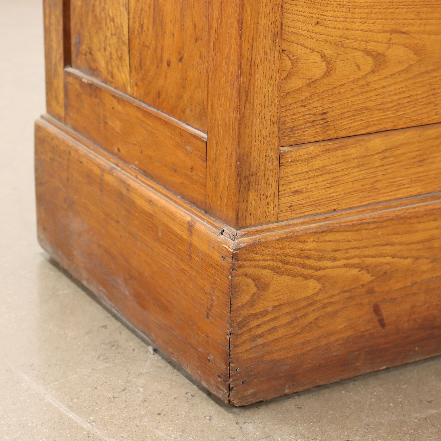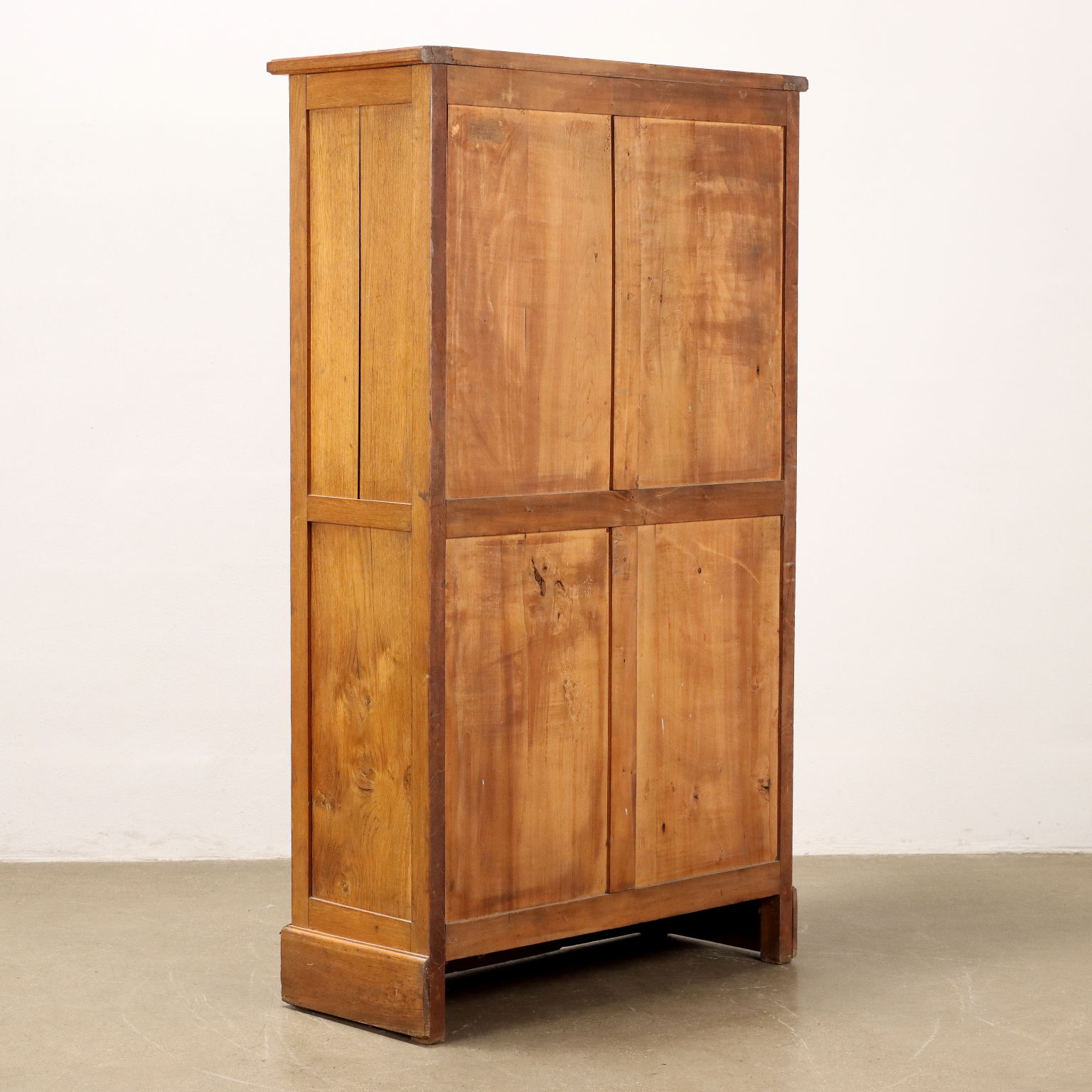 Schedario in rovere con cassetto nella fascia inferiore e due file da 8 cassetti con fronte apribile estraendo la presa in bronzo; serratura centrale che consente il blocco di tutta la cassettiera. In rovere.