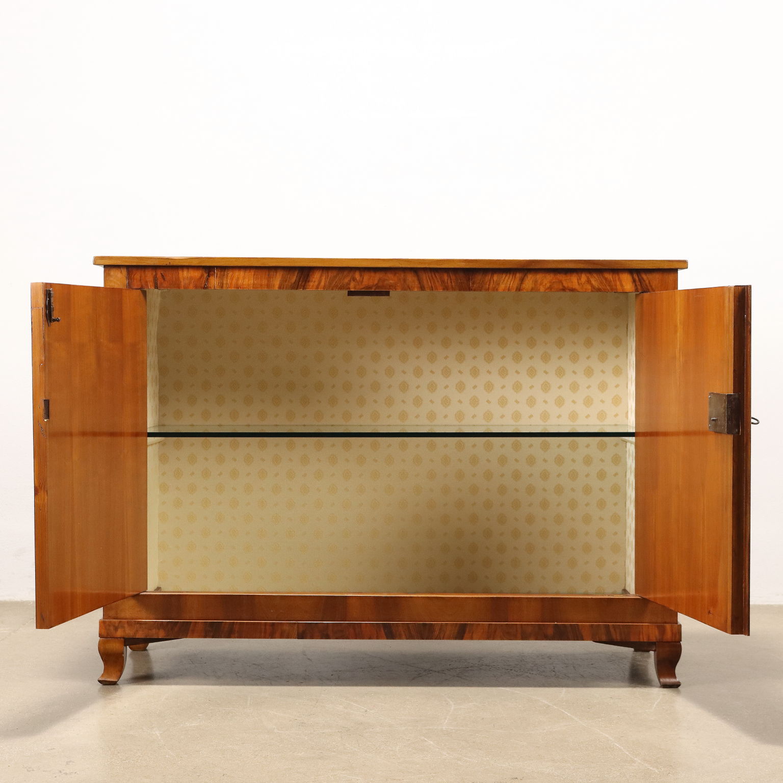 Credenza in stile neoclassico sorretta da piedini mosse, sul fronte presenta coppia di ante; impiallacciata in noce rigatino, è ornata con filettature in acero.