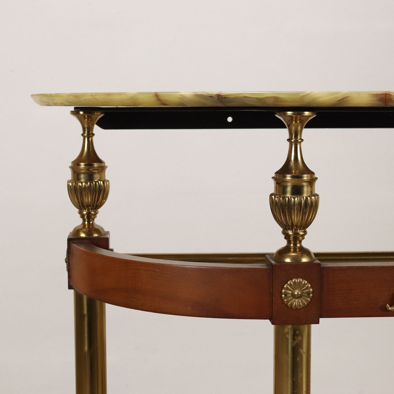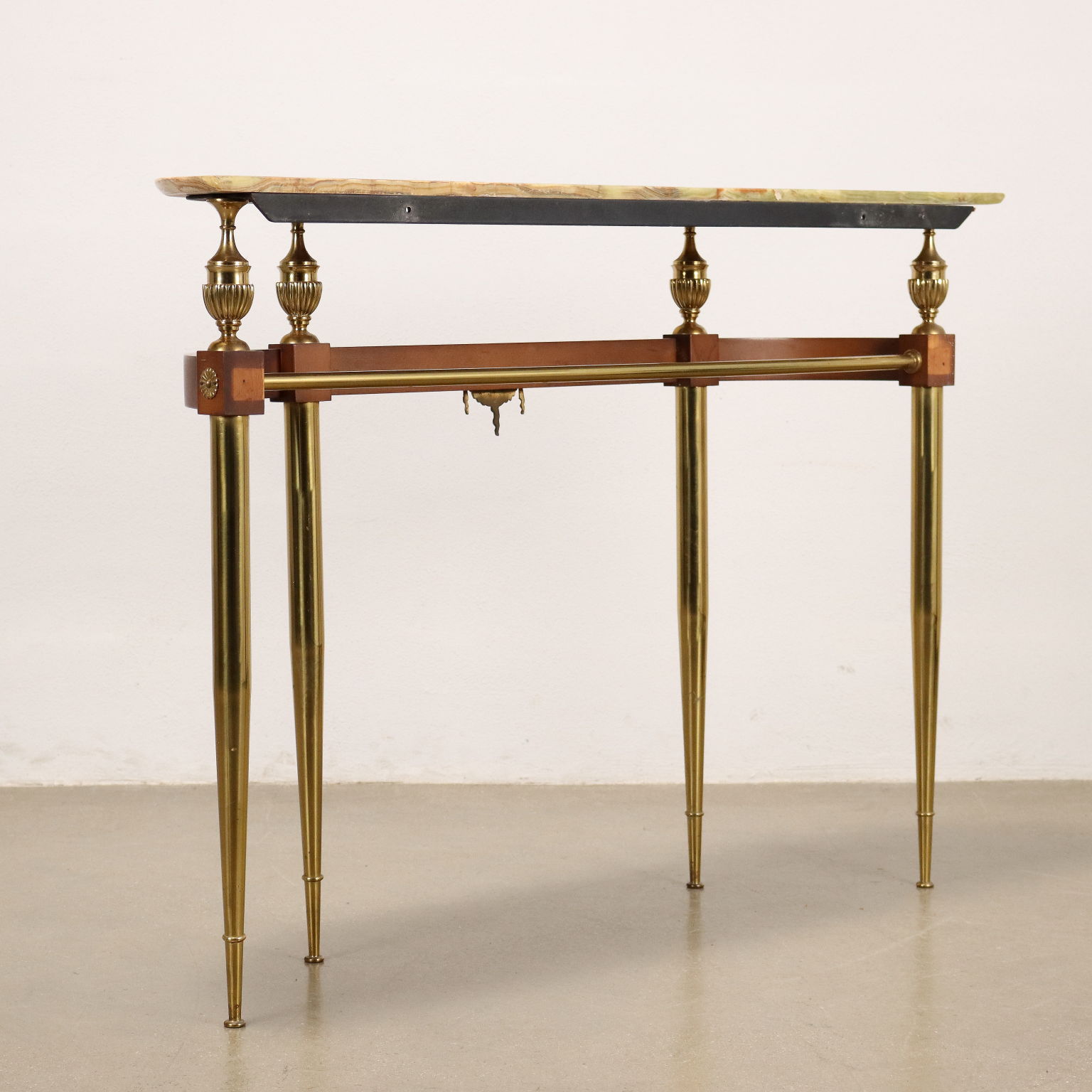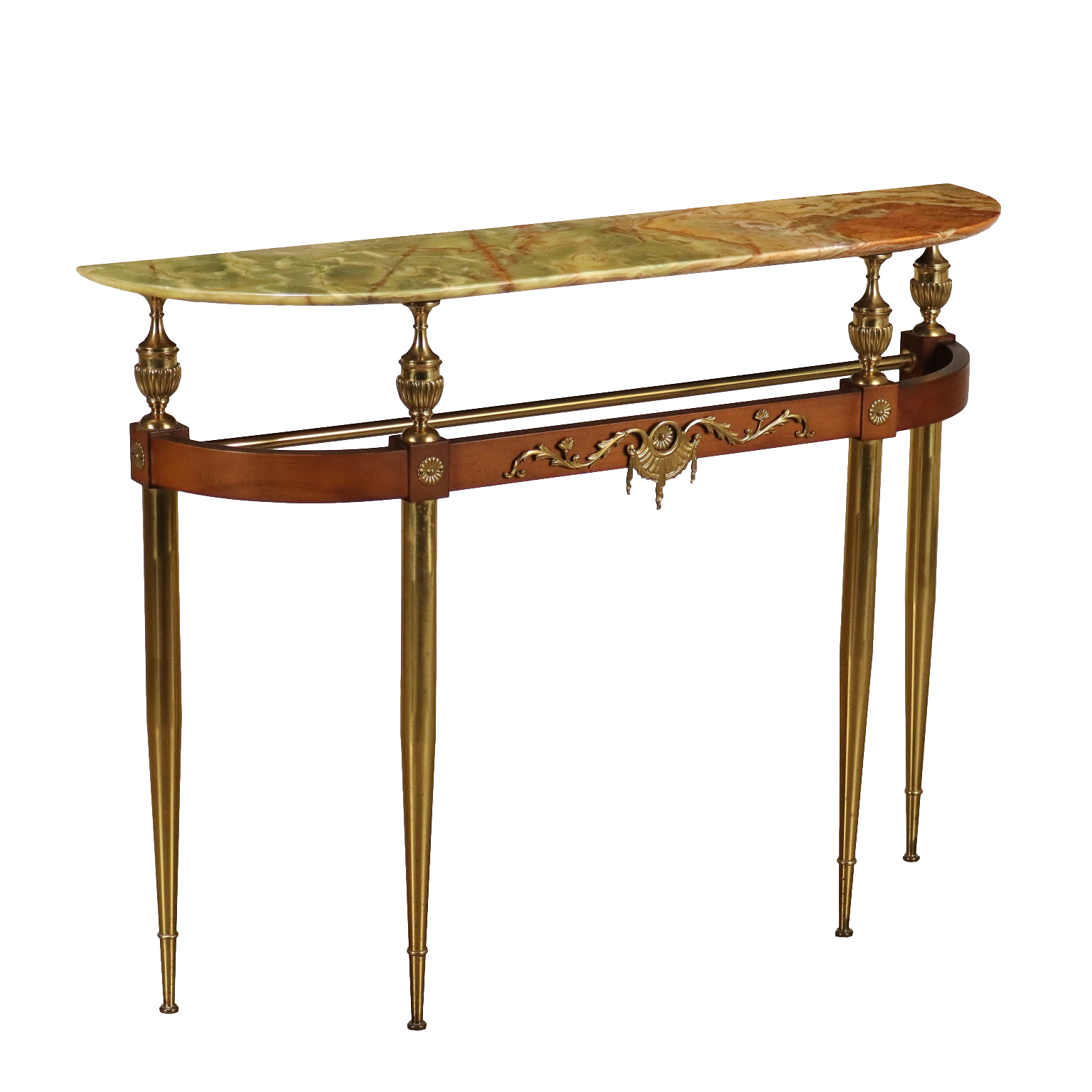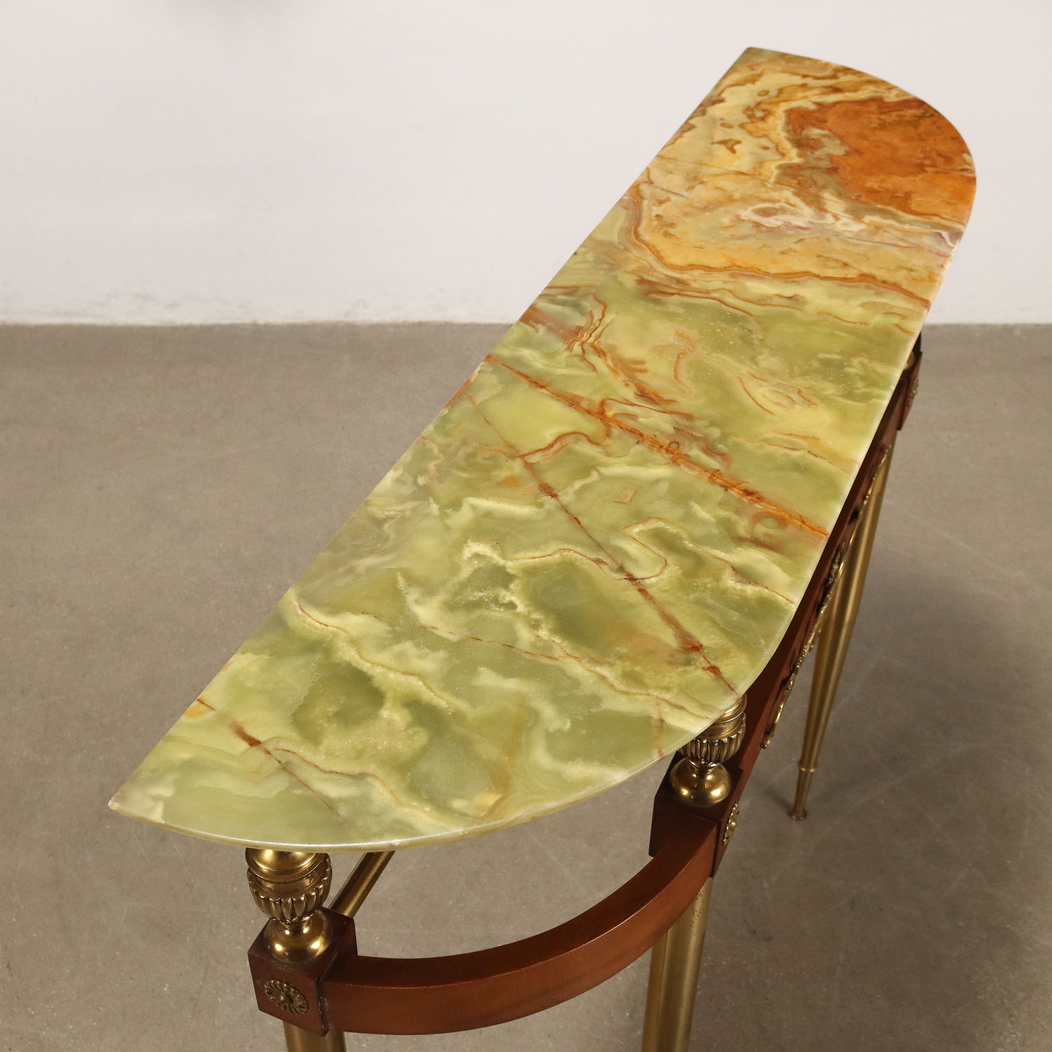 Consolle a parete con struttura in ottone e legno, piano in marmo nei toni del verde.