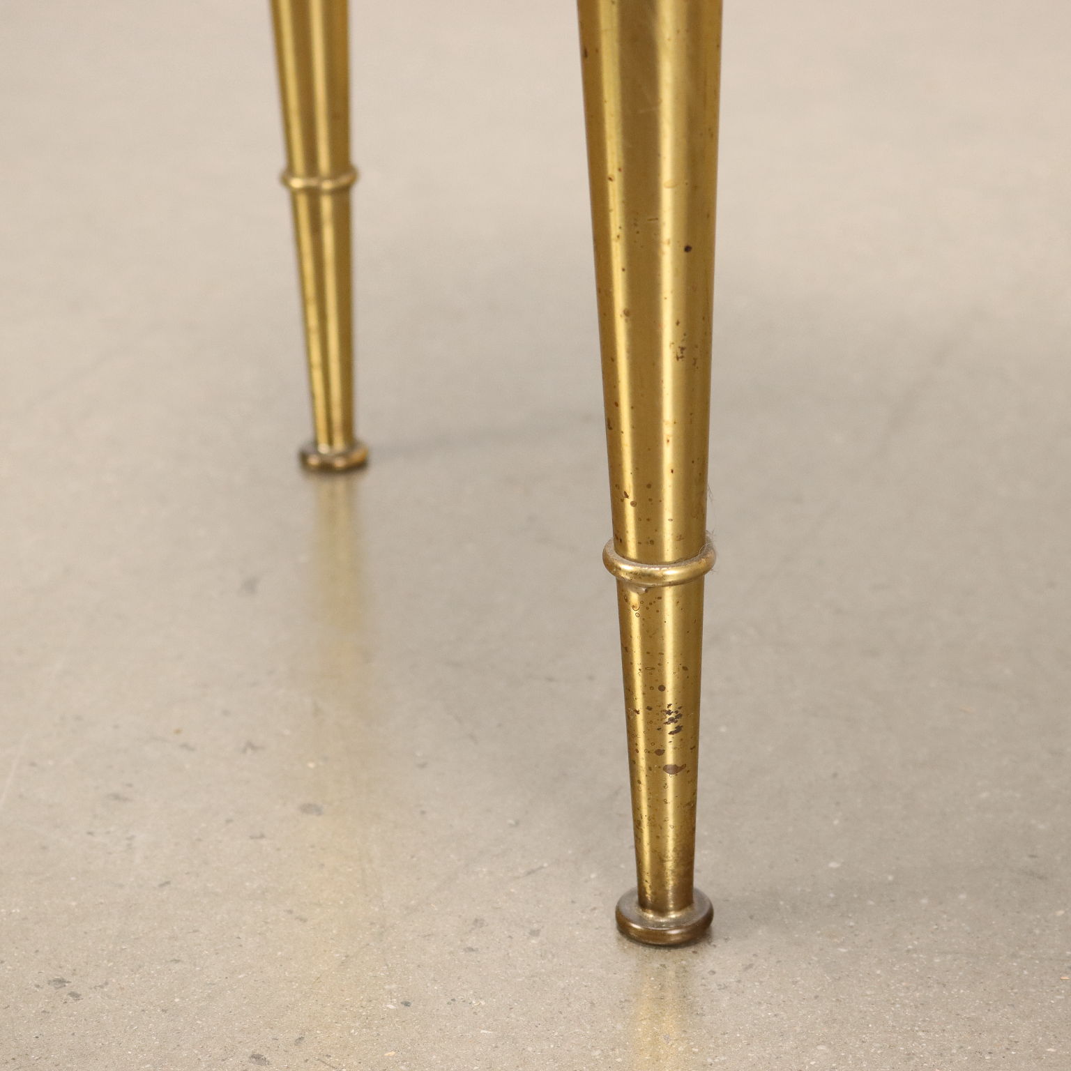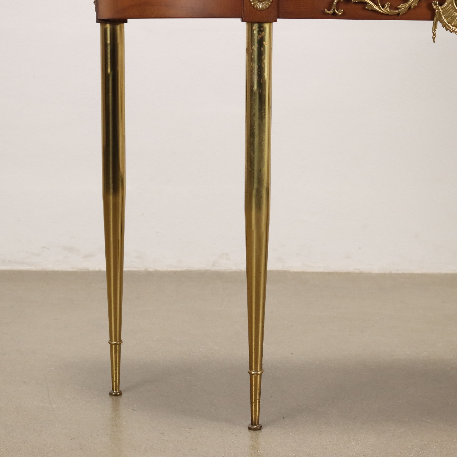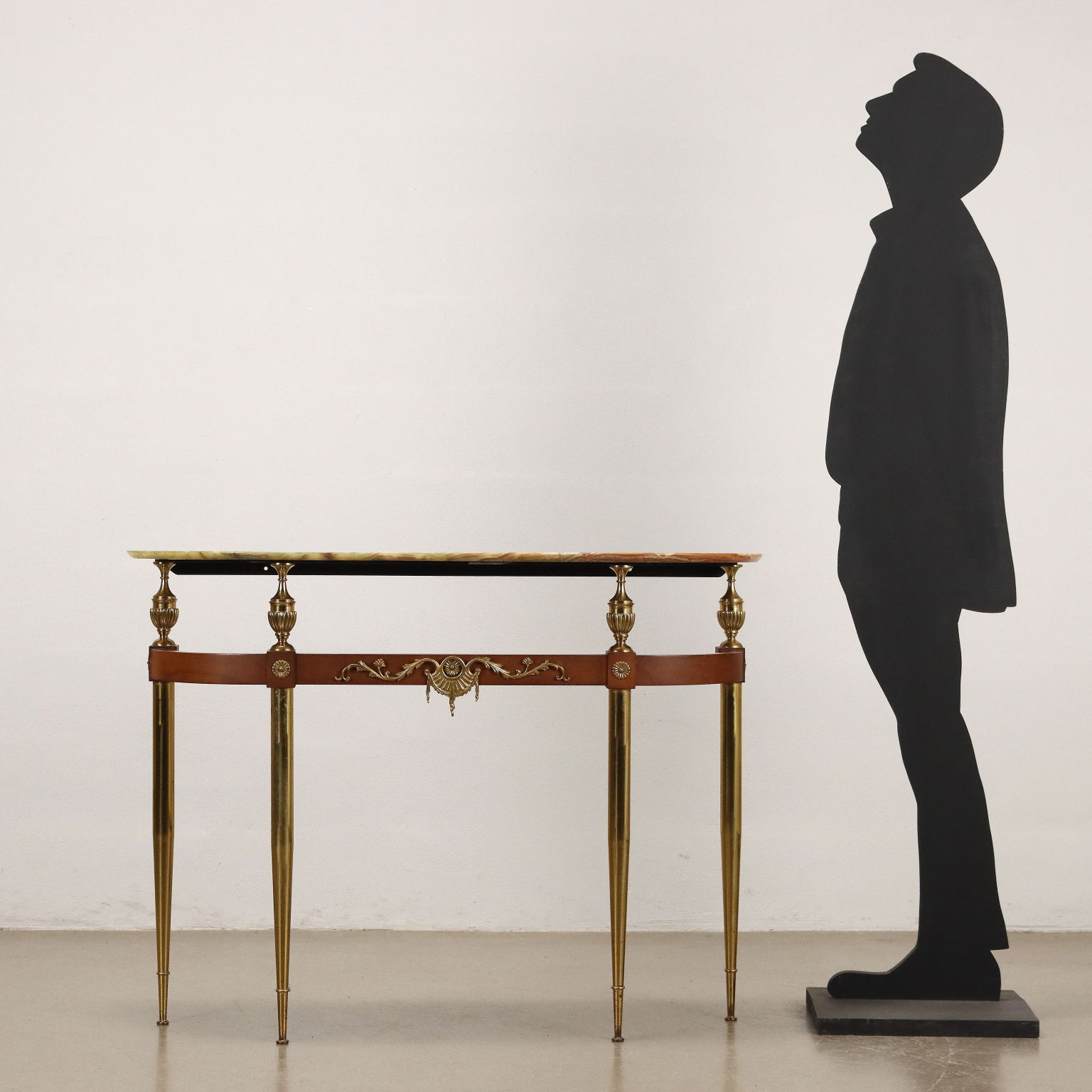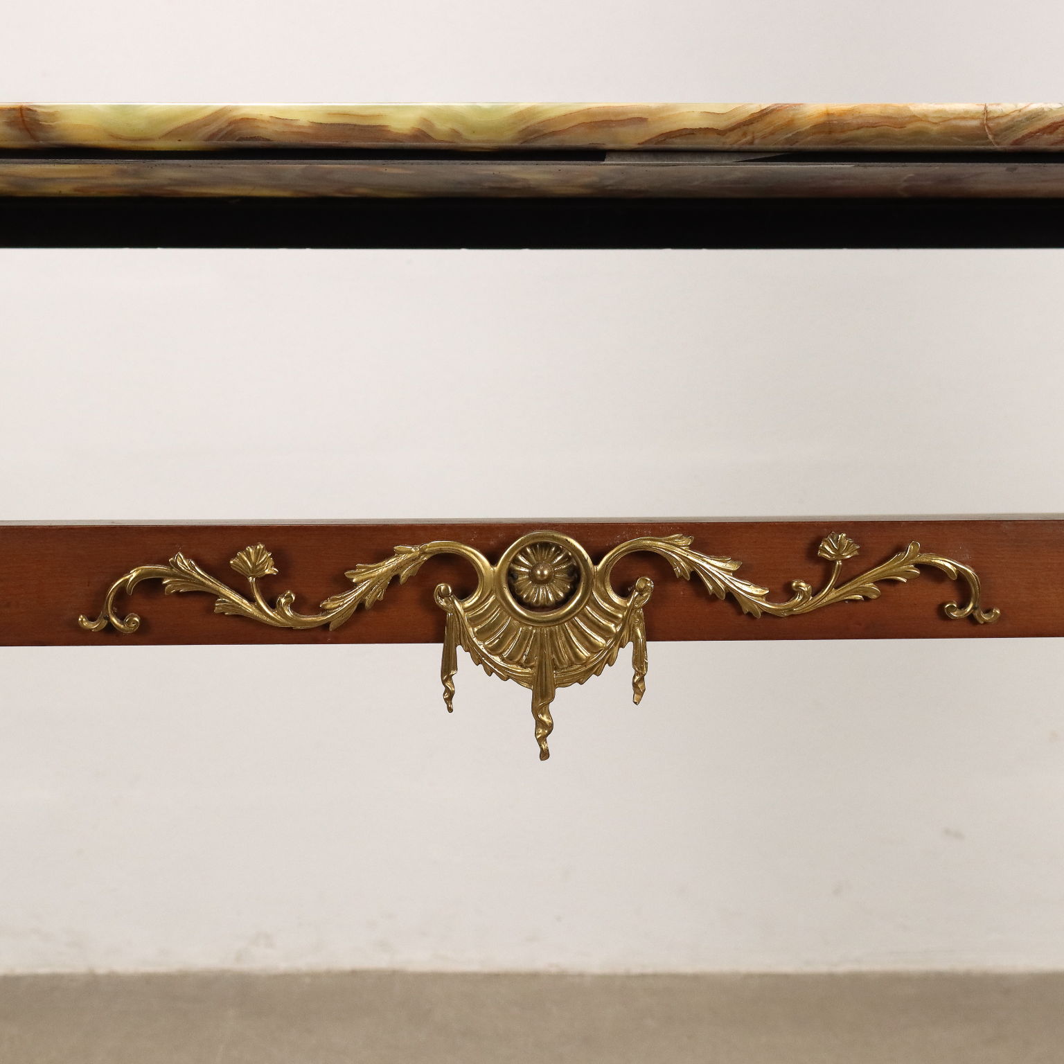 Consolle a parete con struttura in ottone e legno, piano in marmo nei toni del verde.