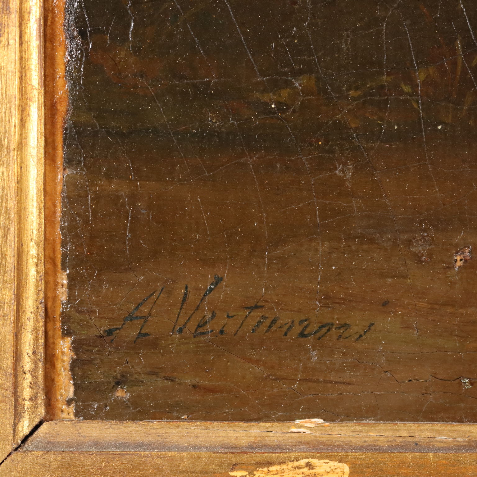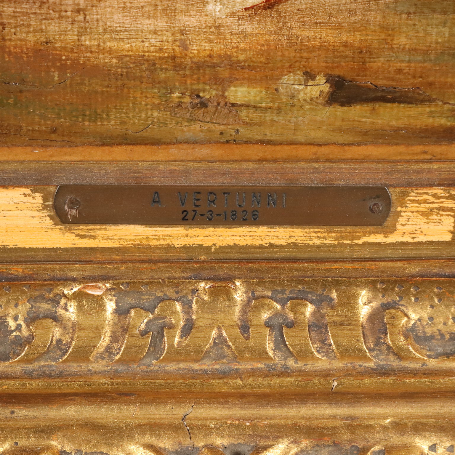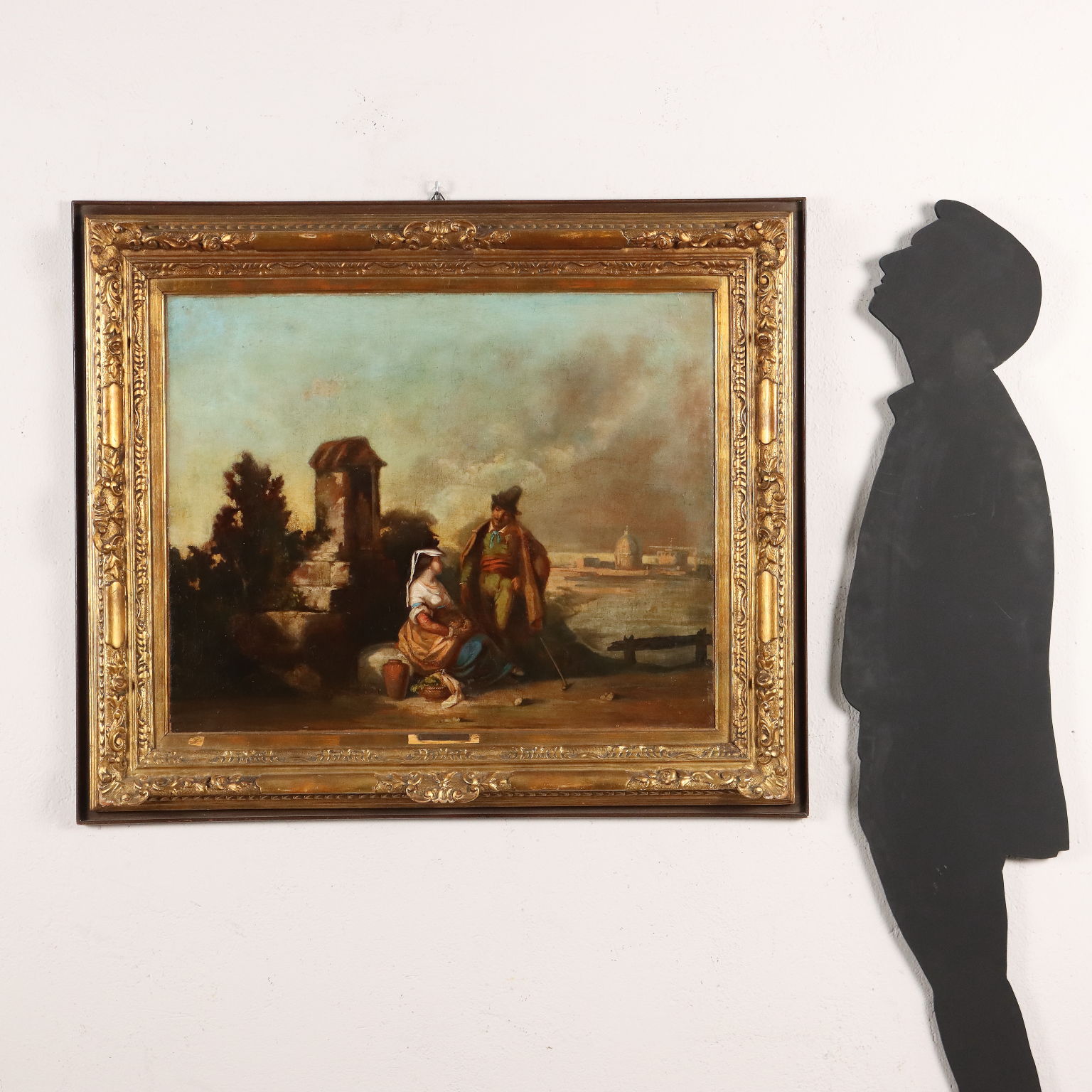 Olio su tela. Firmato in basso a sinistra. Achille Vertunni, nacque e si formò artisticamente a Napoli, ma si trasferì poi a Roma dove, in età matura, il suo studio di via Margutta fu punto di riferimento per molti critici e artisti italiani e stranieri (il D'Annunzio, il De Sanctis, Franz Listz, per citarne alcuni) e fu frequentato dalla nobiltà e da politici dell'epoca , personaggi del Risorgimento e visitatori del "Gran Tour". I suoi primi temi furono ispirati ad eventi storici, ma si dedicò poi al paesaggio che, dagli anni settanta, divenne il soggetto quasi esclusivo dei suoi dipinti. Caratteristici sono i suoi tramonti nell'Agro romano e nelle Paludi Pontine, a volte animati da butteri e da mandrie di bufali. In questo dipinto sono presentate due figure in abiti tradizionali laziali, una coppia di contadini che si riposano presso una cappelletta votiva lungo la strada; a destra si apre il paesaggio costiero lungo il Tevere, in fondo al quale si staglia il profilo di Roma, con il Cupolone di San Pietro e Castel Sant' Angelo. Su tutto, l'atmosfera tipicamente romantica di un tramonto, con i suoi giochi di luci soffuse e rosate. Il dipinto, ritelato, è presentato in cornice in stile.