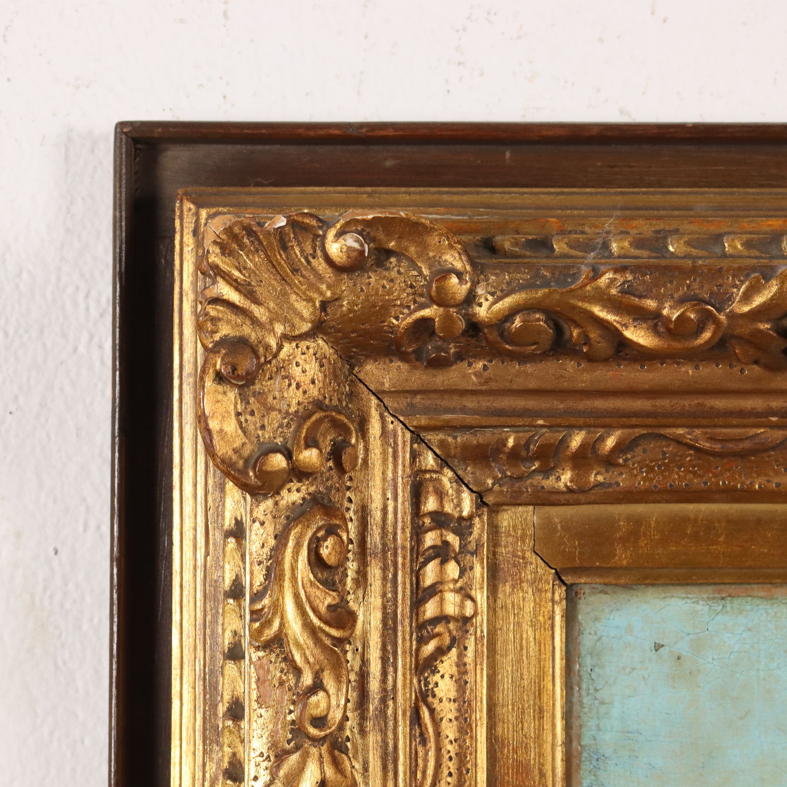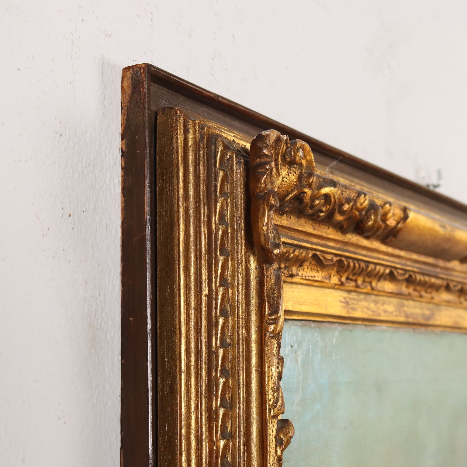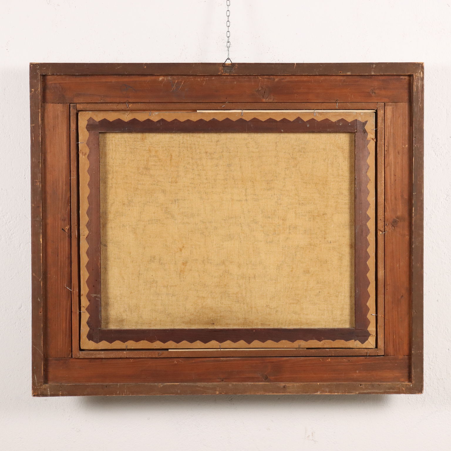 Olio su tela. Firmato in basso a sinistra. Achille Vertunni, nacque e si formò artisticamente a Napoli, ma si trasferì poi a Roma dove, in età matura, il suo studio di via Margutta fu punto di riferimento per molti critici e artisti italiani e stranieri (il D'Annunzio, il De Sanctis, Franz Listz, per citarne alcuni) e fu frequentato dalla nobiltà e da politici dell'epoca , personaggi del Risorgimento e visitatori del "Gran Tour". I suoi primi temi furono ispirati ad eventi storici, ma si dedicò poi al paesaggio che, dagli anni settanta, divenne il soggetto quasi esclusivo dei suoi dipinti. Caratteristici sono i suoi tramonti nell'Agro romano e nelle Paludi Pontine, a volte animati da butteri e da mandrie di bufali. In questo dipinto sono presentate due figure in abiti tradizionali laziali, una coppia di contadini che si riposano presso una cappelletta votiva lungo la strada; a destra si apre il paesaggio costiero lungo il Tevere, in fondo al quale si staglia il profilo di Roma, con il Cupolone di San Pietro e Castel Sant' Angelo. Su tutto, l'atmosfera tipicamente romantica di un tramonto, con i suoi giochi di luci soffuse e rosate. Il dipinto, ritelato, è presentato in cornice in stile.