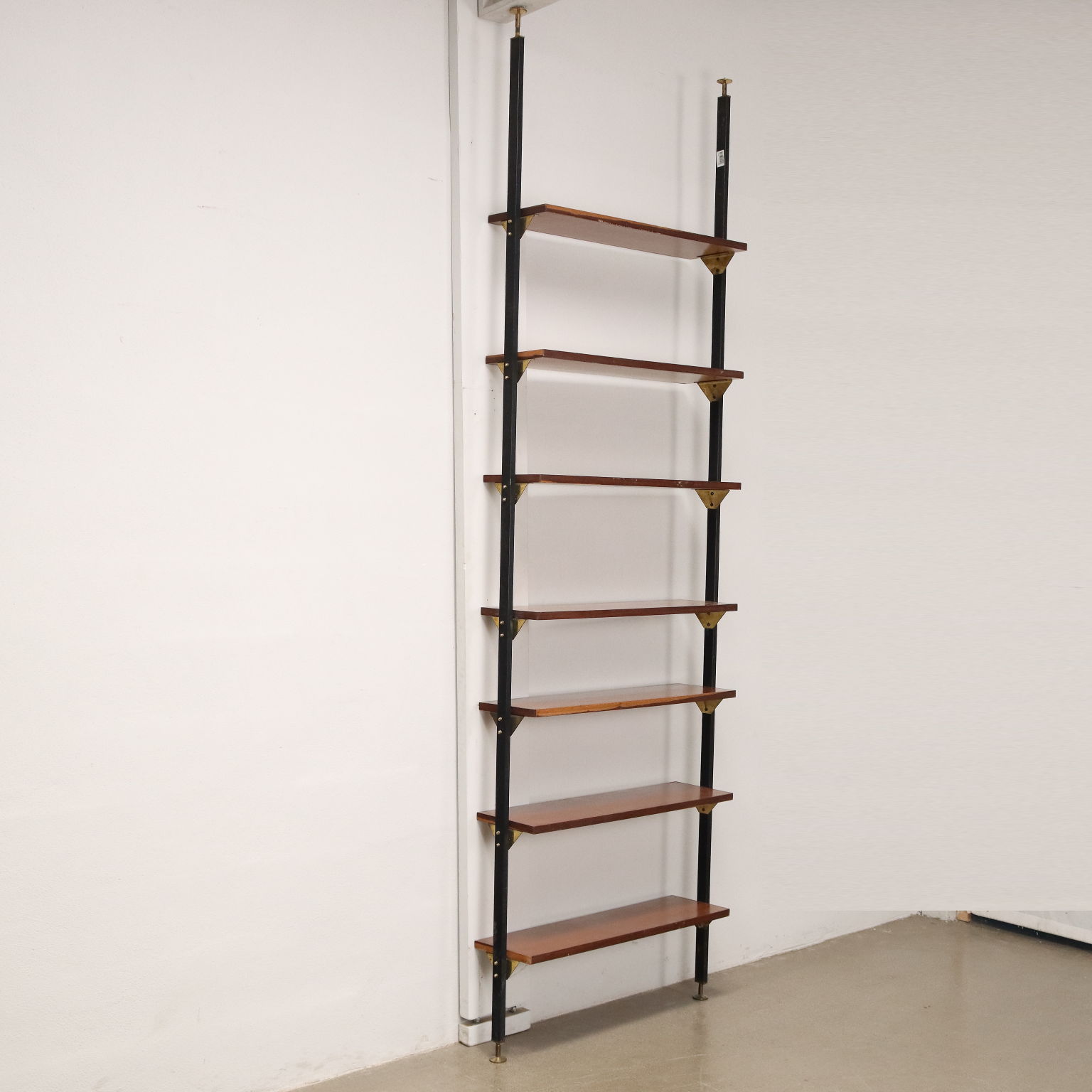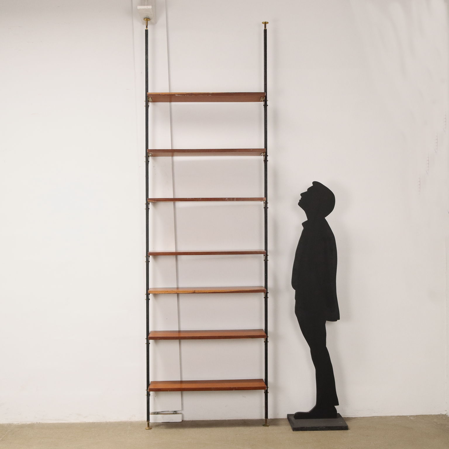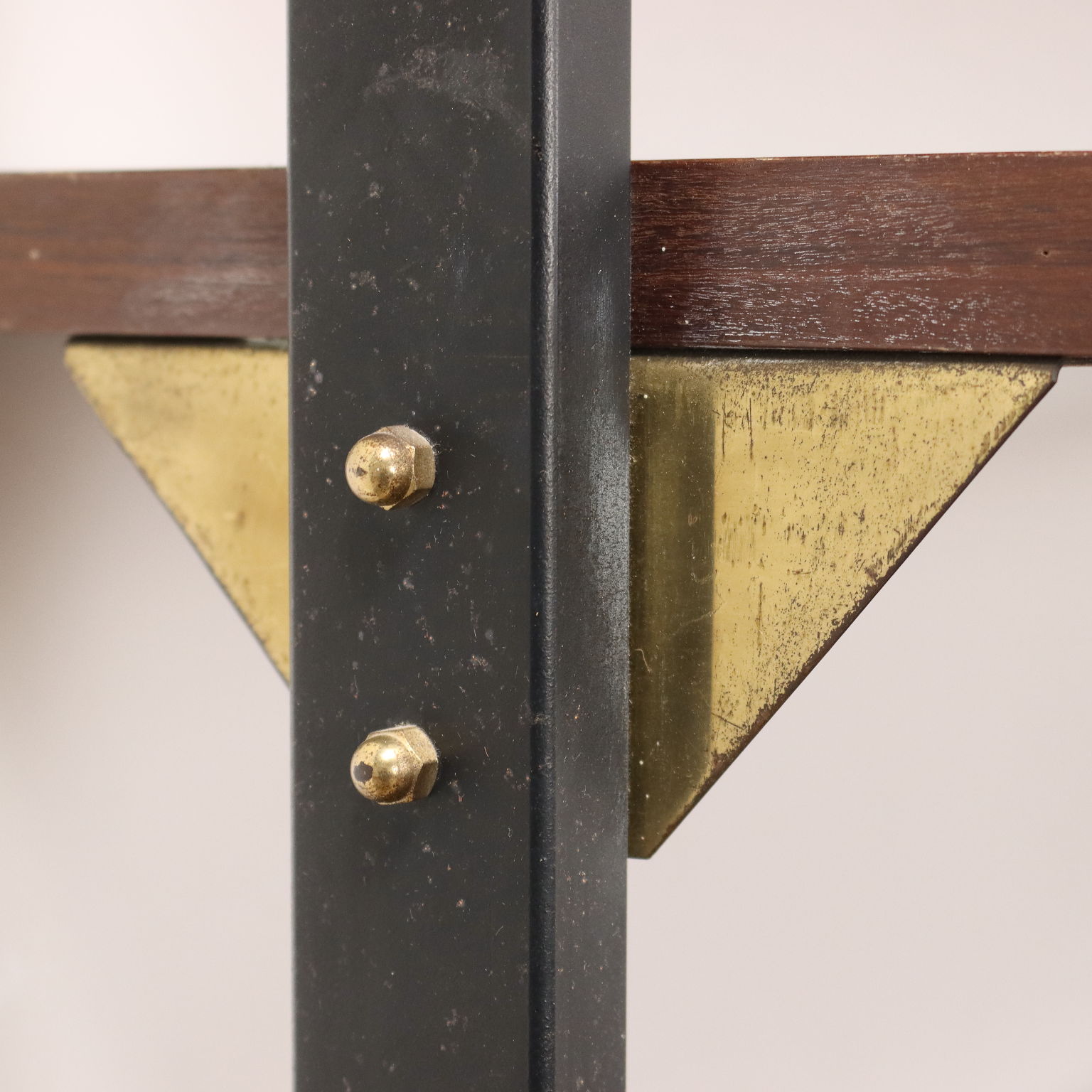Libreria a soffitto con ripiani a posizione regolabile, in legno impiallacciato mogano, supporti in ottone e montanti in metallo smaltato.