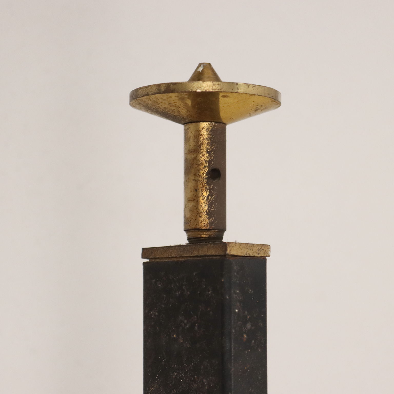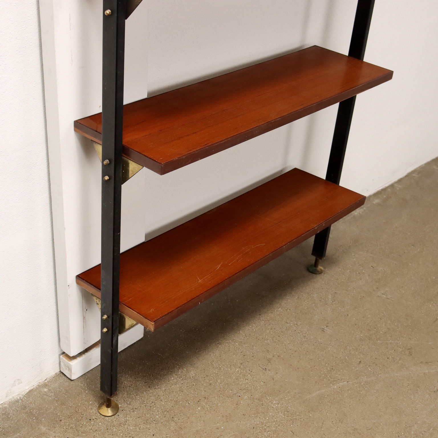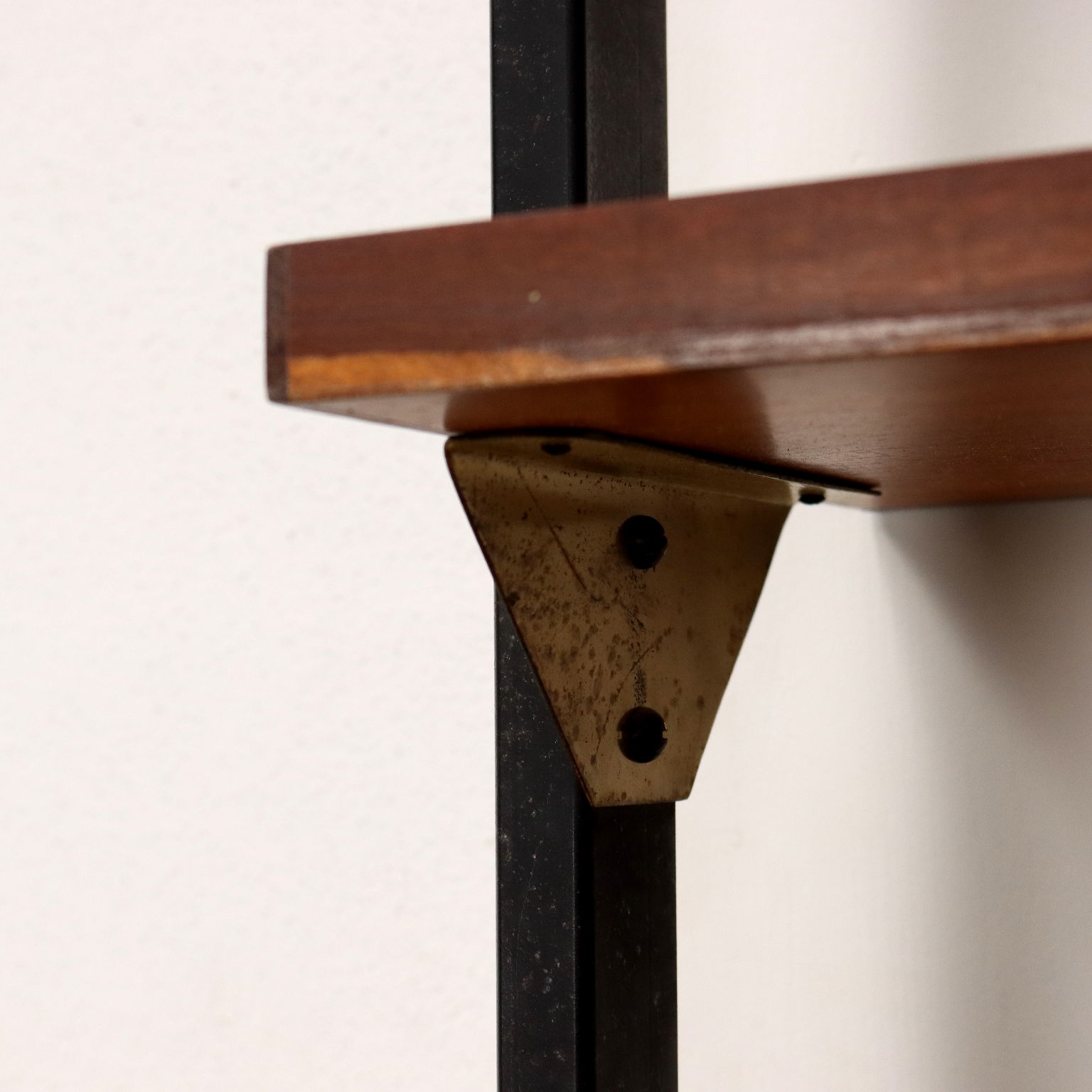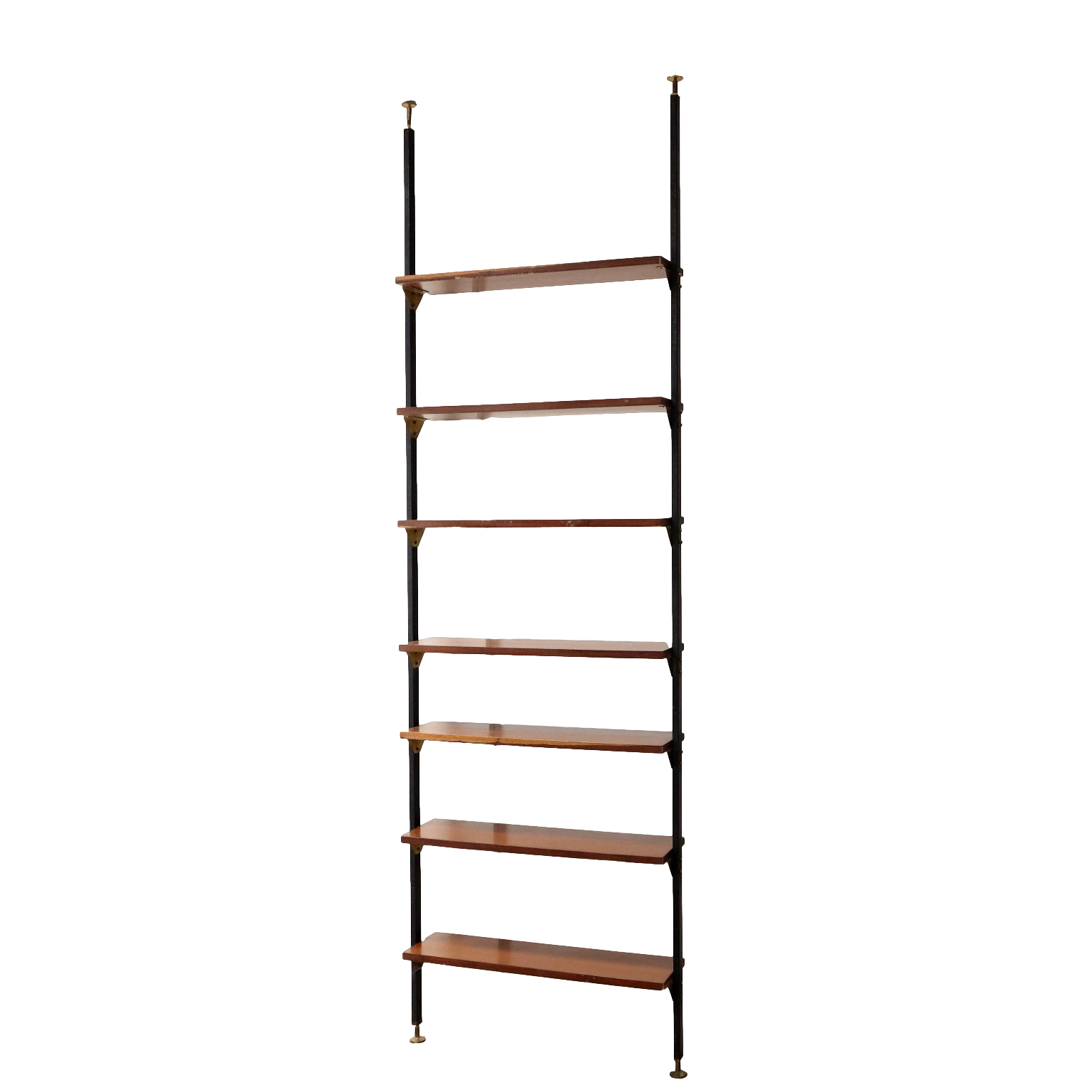 Libreria a soffitto con ripiani a posizione regolabile, in legno impiallacciato mogano, supporti in ottone e montanti in metallo smaltato.