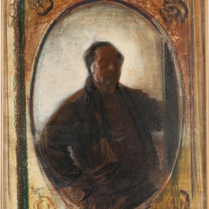 Tecnica mista su carta, applicata a tavola. Firmato in basso a destra. A sinistra la localizzazione ("Londra South Edwardes Square") e la data. Al retro sono presenti timbri della Galleria d'Arte Cortina di Milano. Presso tale Galleria l'Annigoni espose nel 1968, in una mostra che ebbe grande successo. Rinamato ritrattista, definito "il pittore delle regine", per i ritratti di reali e di altri importanti personaggi della scena politica internazionale, Pietro Annigoni ritrasse anche persone comuni, delle quali cercava di trasporre nell'opera non solo l'aspetto esteriore ma anche l'interiorità. Il tema dell'autoritratto fu per Annigoni un punto cardine della sua carriera, un ottimo esercizio di tecnica nella rappresentazione del volto ma anche una ricerca psicologica introspettiva. Realizzò diversi autoritratti in periodi differenti, molto differenti tra loro, ad esprimere il diverso sguardo che l'artista ebbe su di sè. In quello qui proposto, Annigoni si raffigura in ombra, con i tratti del volto poco definiti, ma davanti al cavalletto, con il braccio che diventa un tutt'uno con la tela che sta dipingendo; la sua figura è inscritta in un ovale dipinto a guisa di cornice marmorea poggiante su una mensola, quasi fosse un altarino commemorativo. L'opera è presentata in cornice.