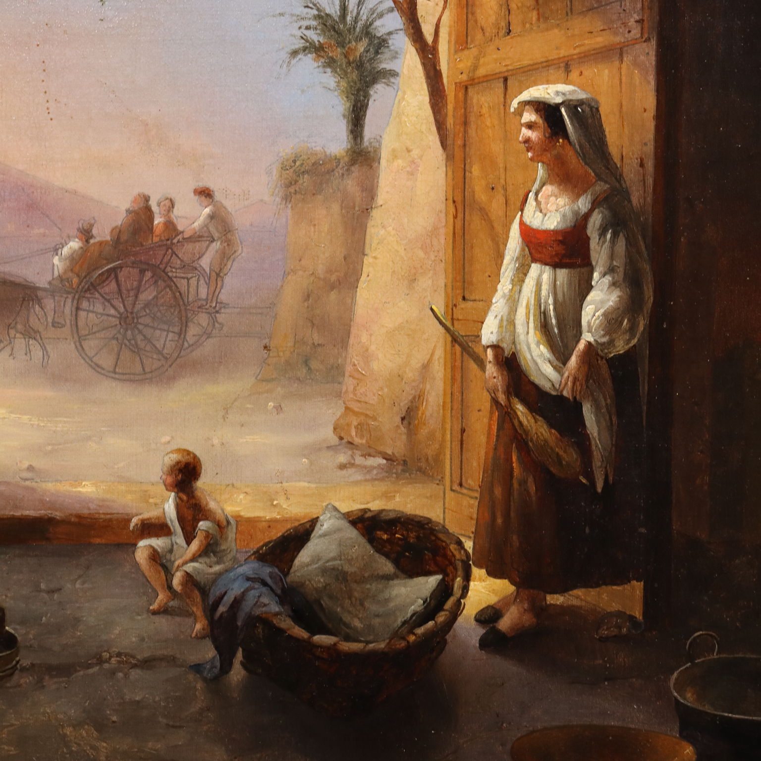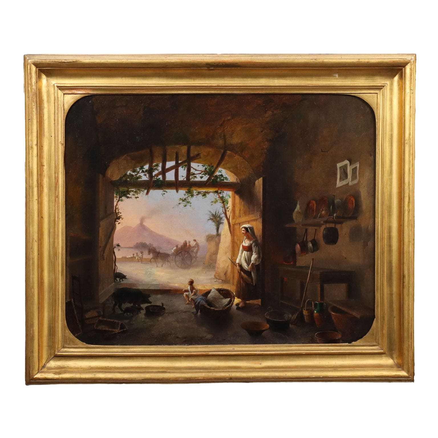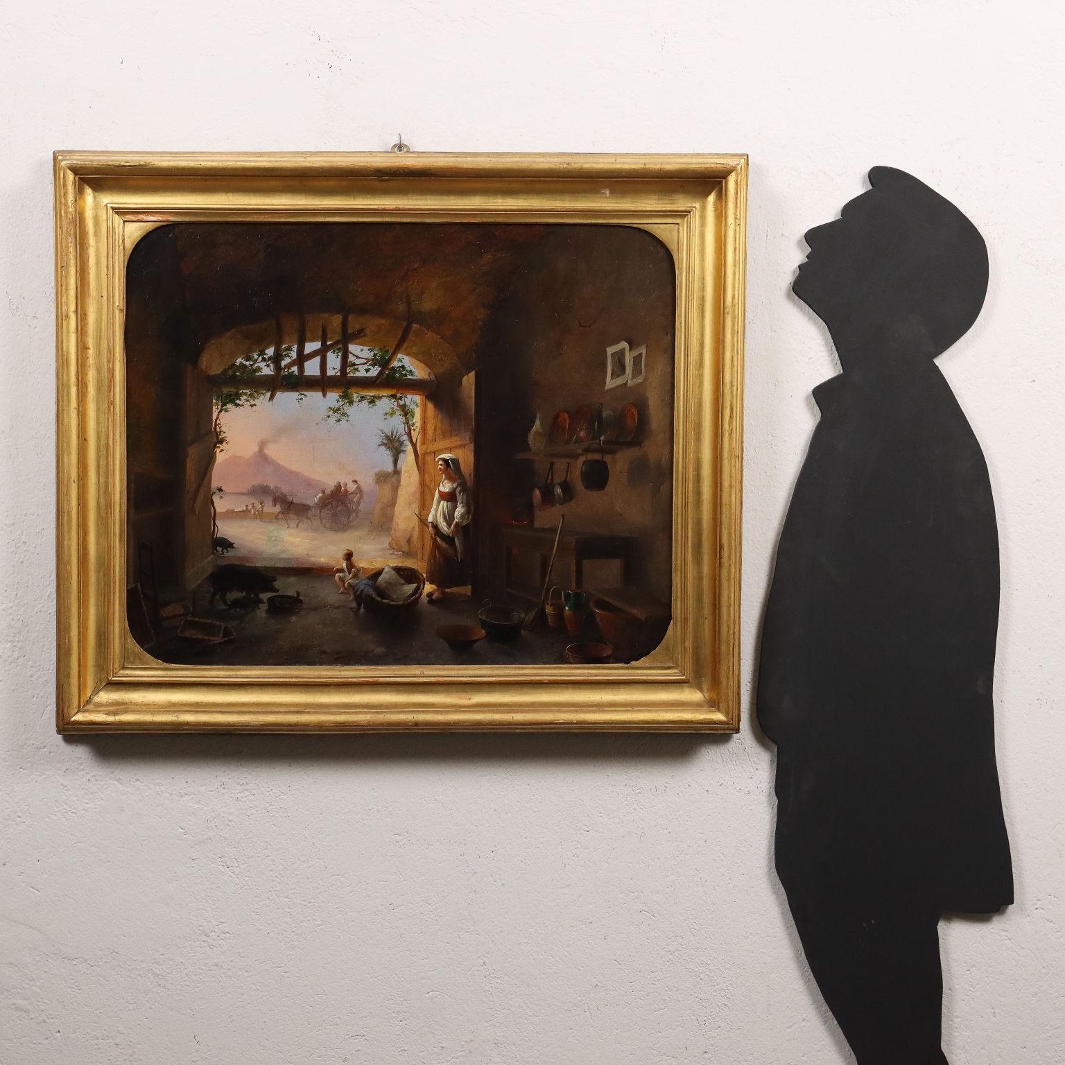 Olio su tela. Franz Ludwig Catel, pittore tedesco stabilitosi a Roma e appassionato dell'Italia meridionale, realizzò spesso scene di vita popolare, spesso ripetute e vendute ai turisti del Grand Tour; in particolare nella sua produzione ricorre questo scorcio di Mergellina, con vista sul Vesuvio, ripreso dall'interno di un'abitazione di pescatori. Il Catel studia gli effetti della luce solare, ricorrendo frequentemente a un accorgimento compositivo che ben si vede anche in quest'opera: inquadra la veduta entro motivi naturali o architettonici (alberi, pergolati, archi, finestre, in questo caso l'uscio della povera abitazione) che limitano un primo piano in oscurità, in modo da creare un effetto di controluce, dal quale viene esaltata la luminosità del paesaggio. Diverse figure animano l'interno e l'esterno dell'abitazione. L'opera qui presentata appare incompleta: è solo abbozzata a matita una figura - quella del pescatore ricorrente in altre tele simili - all'interno della stanza sulla sinistra, così come risulta non completata la pittura della carrozza in esterno, di cui si vede la bozza del disegno a matita sotto la prima stesura di colore. Il dipinto è presentato in cornice dorata di fine '800.