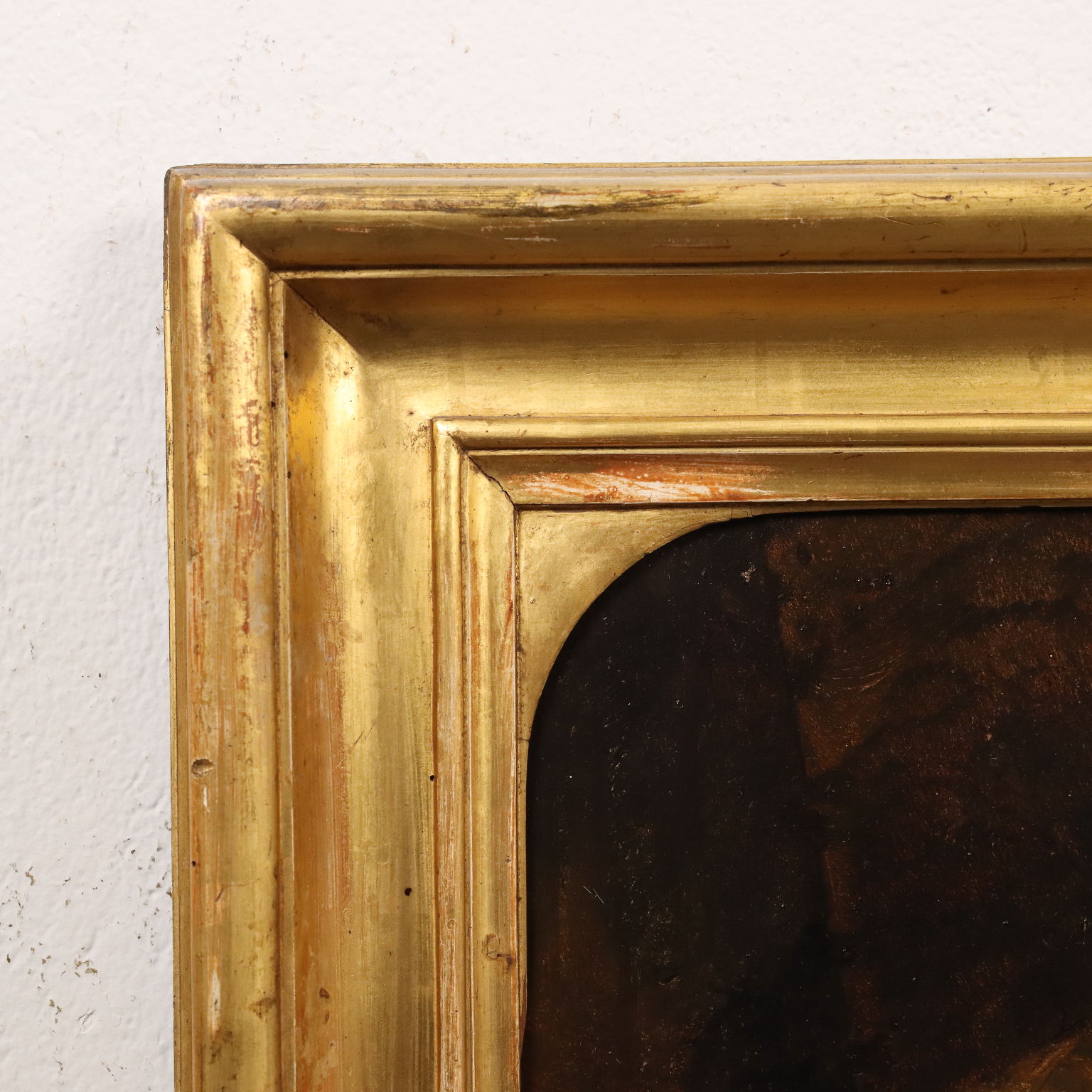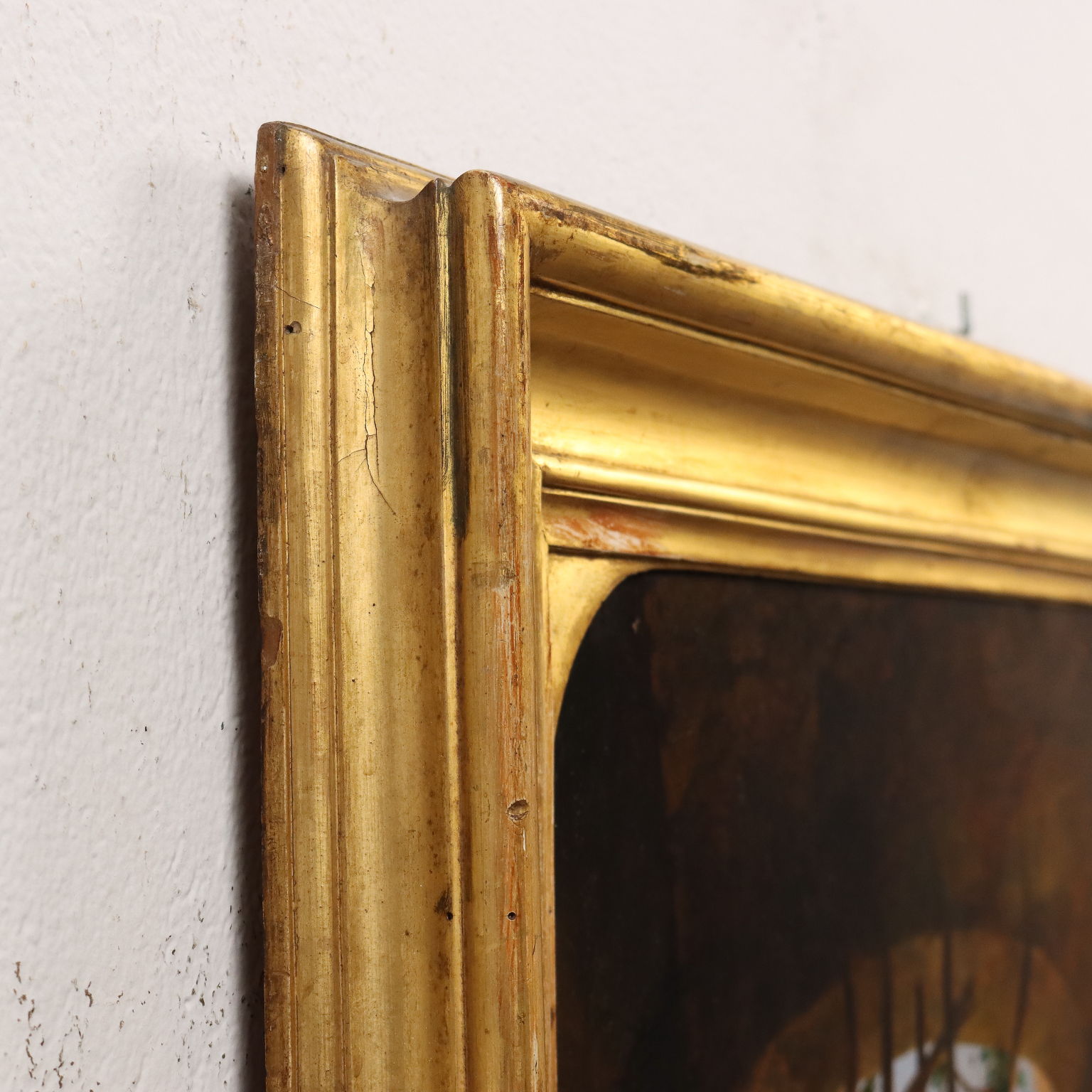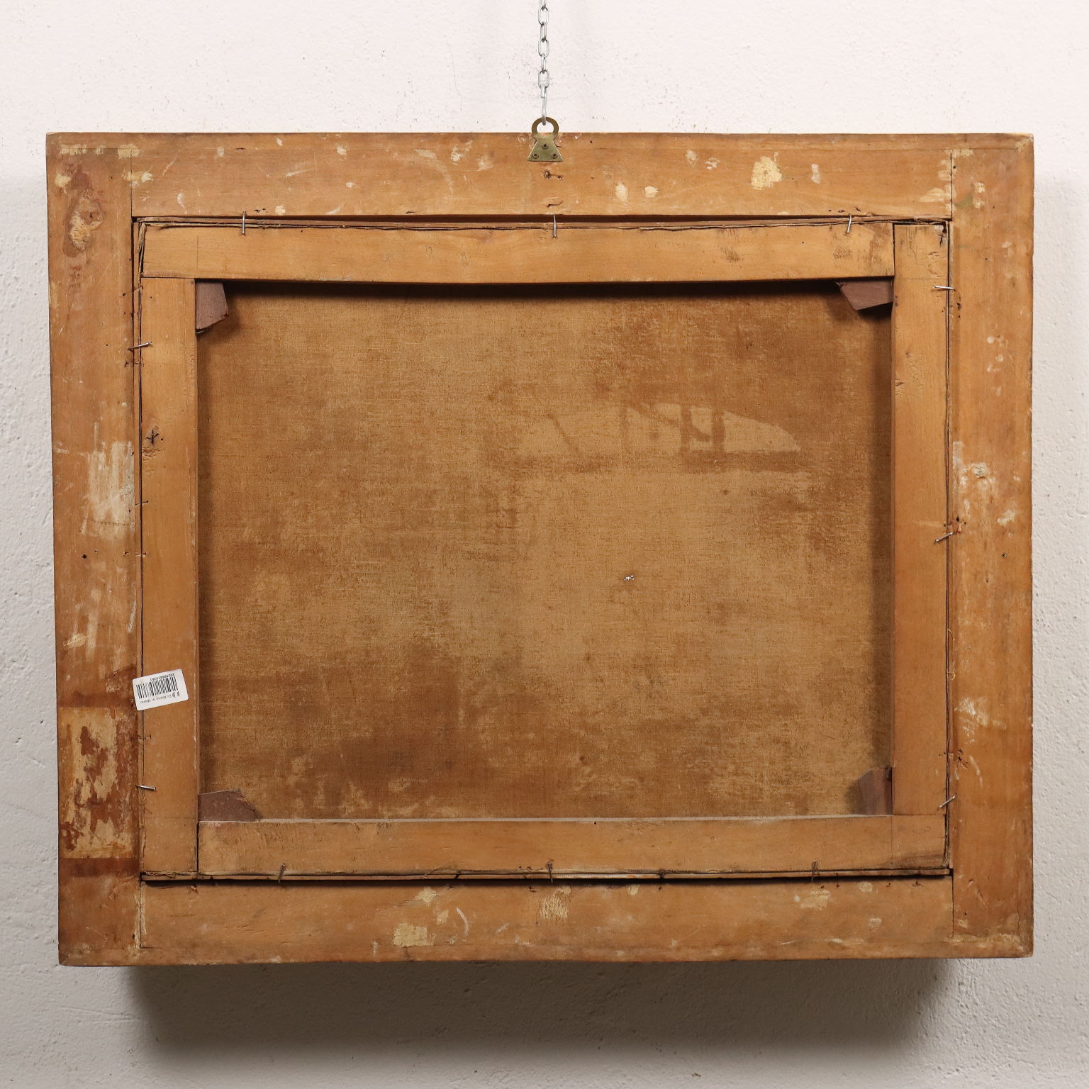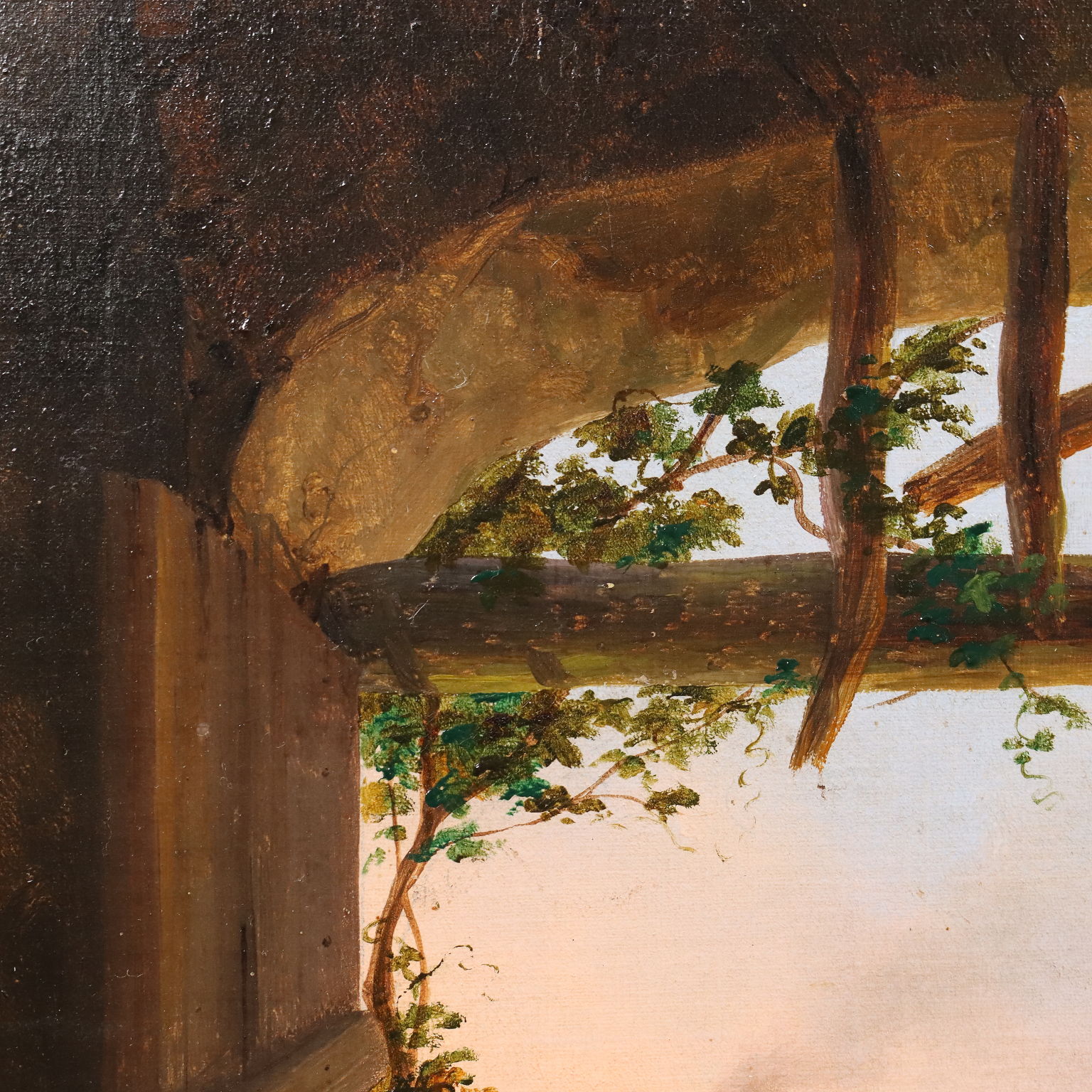 Olio su tela. Franz Ludwig Catel, pittore tedesco stabilitosi a Roma e appassionato dell'Italia meridionale, realizzò spesso scene di vita popolare, spesso ripetute e vendute ai turisti del Grand Tour; in particolare nella sua produzione ricorre questo scorcio di Mergellina, con vista sul Vesuvio, ripreso dall'interno di un'abitazione di pescatori. Il Catel studia gli effetti della luce solare, ricorrendo frequentemente a un accorgimento compositivo che ben si vede anche in quest'opera: inquadra la veduta entro motivi naturali o architettonici (alberi, pergolati, archi, finestre, in questo caso l'uscio della povera abitazione) che limitano un primo piano in oscurità, in modo da creare un effetto di controluce, dal quale viene esaltata la luminosità del paesaggio. Diverse figure animano l'interno e l'esterno dell'abitazione. L'opera qui presentata appare incompleta: è solo abbozzata a matita una figura - quella del pescatore ricorrente in altre tele simili - all'interno della stanza sulla sinistra, così come risulta non completata la pittura della carrozza in esterno, di cui si vede la bozza del disegno a matita sotto la prima stesura di colore. Il dipinto è presentato in cornice dorata di fine '800.