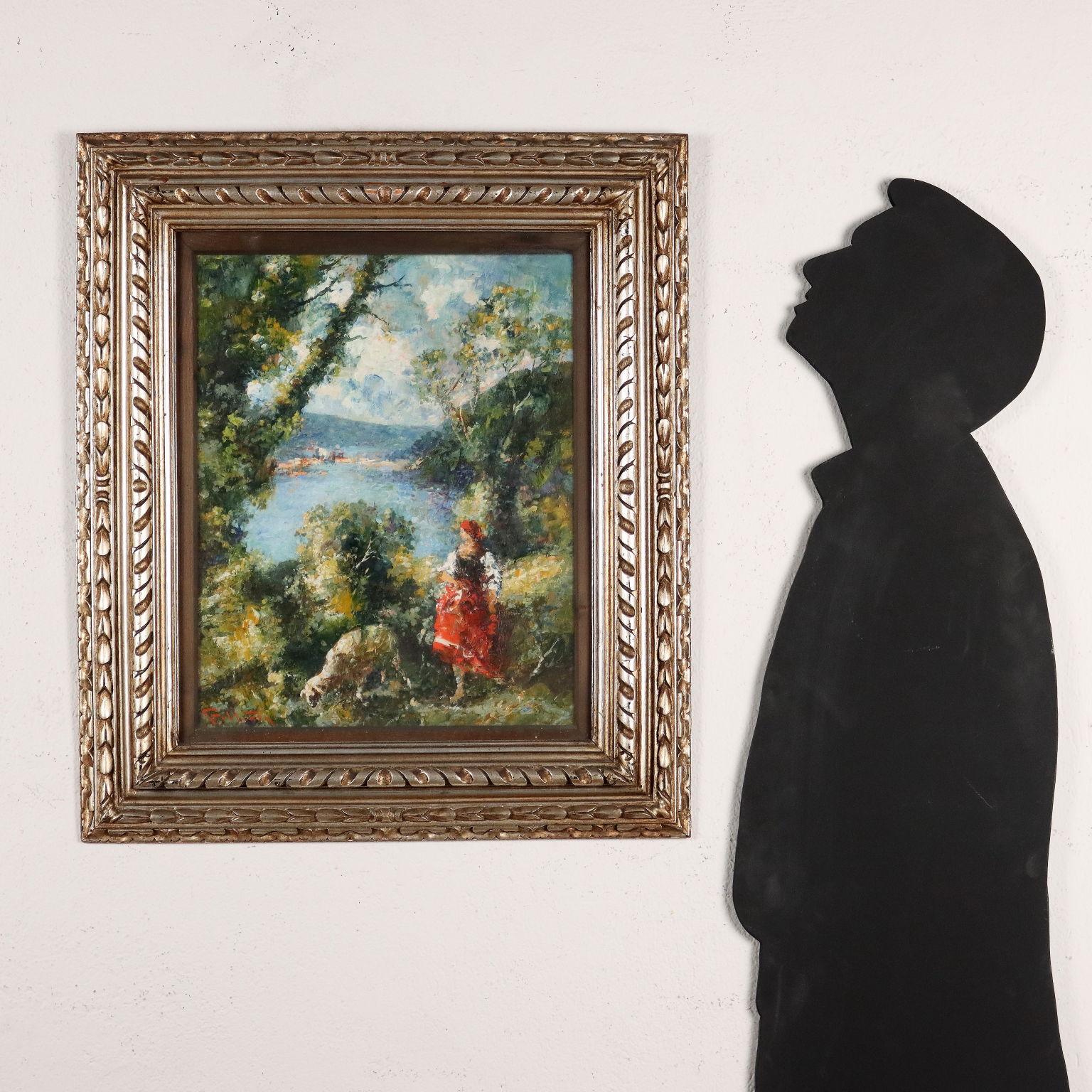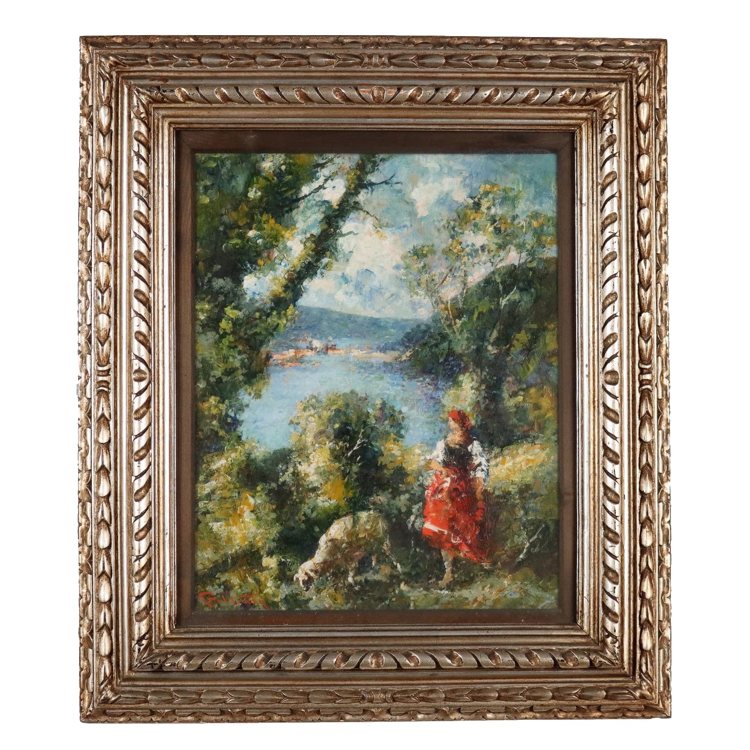 Olio su tavola. Firmato in basso a sinistra. Mario Pobbiati, artista milanese formatosi all'Accademia di Brera con Cesare Tallone, si cimentò prevalentemente nei paesaggi e nei ritratti. Qui è proposto un scorcio paesaggistico con vista u un lago, e animato da una figura di pastorella con la sua pecora: la pittura verista del Pobbiati è caratterizzata da pennellate corpose, veloci e dall'uso di colori luminosi, spesso sgargianti. L'opera è presentata in cornice in stile.