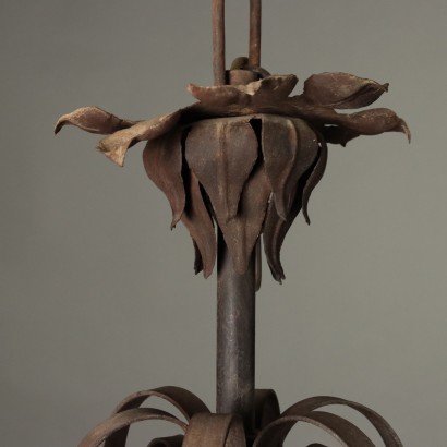 Lampadario in ferro battuto e lamierino lavorati a motivi fitomorfi di gusto neorinasimento, a sei luci, le bobeche sono a corolle floreali.