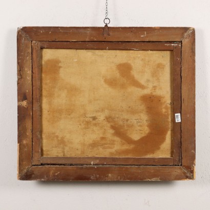 Olio su tela. Dipinto in stile antico, in particolare ad imitazione di Francesco Guardi (1712-1793), propone una veduta della città lagunare con vista della Basilica di Santa Maria della Salute, con numerose figure e gondole che animano l'ingresso del Canal Grande.. Il dipinto è presentato in cornice antica del XVIII secolo, ridorata con piccole mancanze.