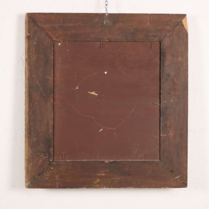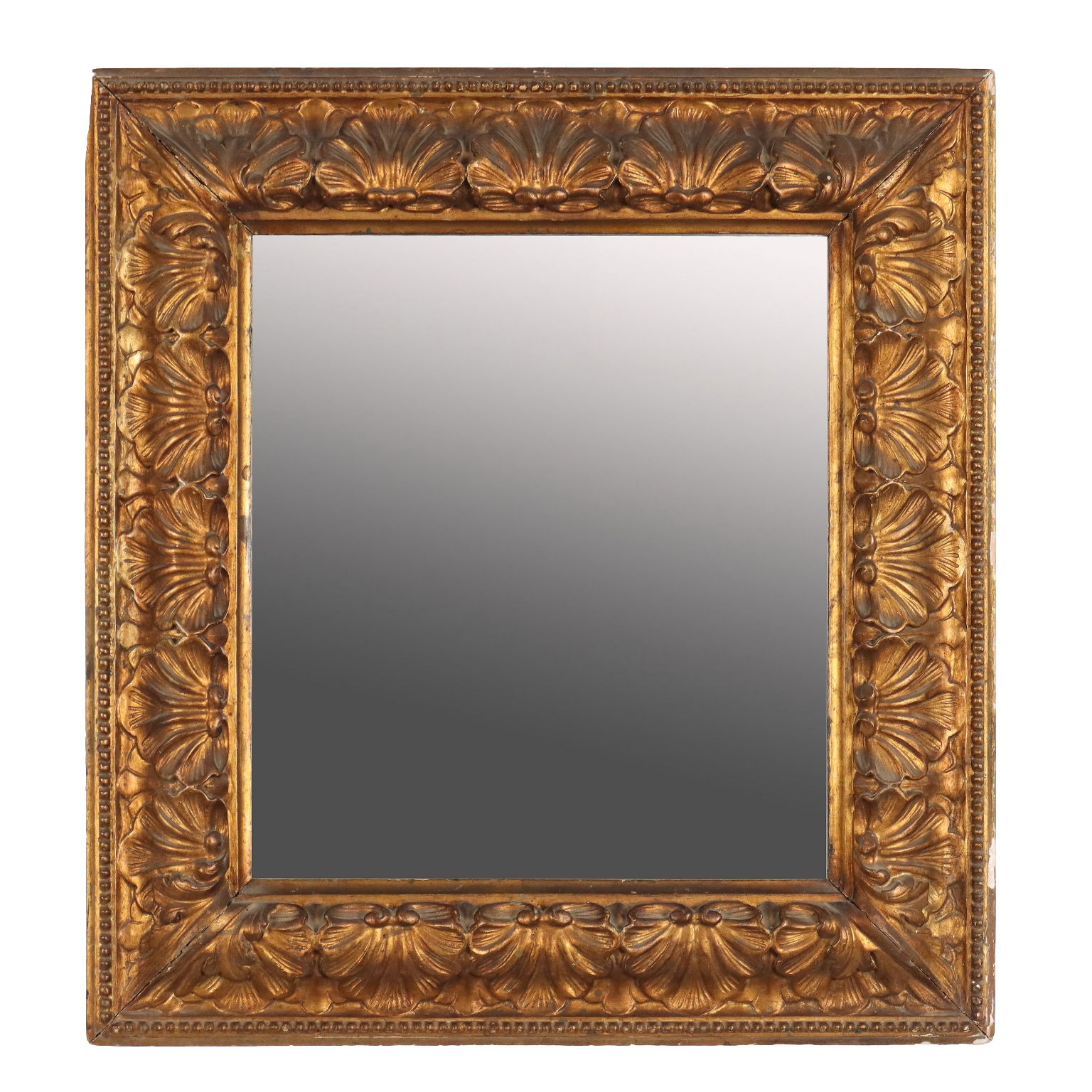 Specchiera in stile con cornice intagliata con motivi fogliacei e dorata.