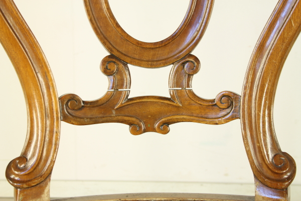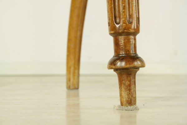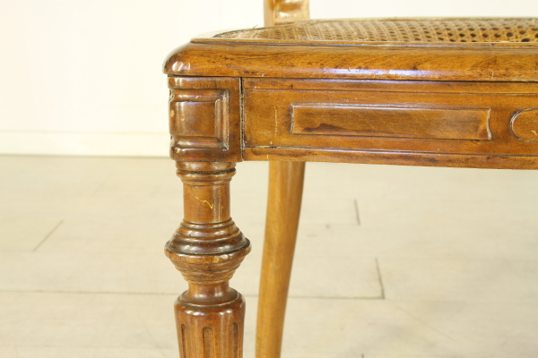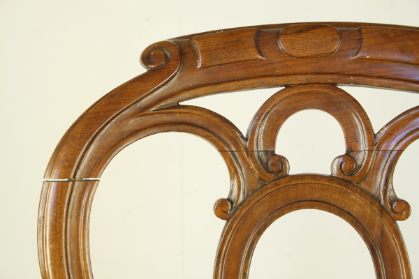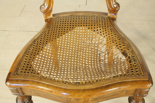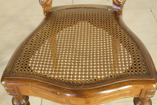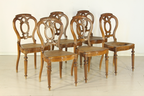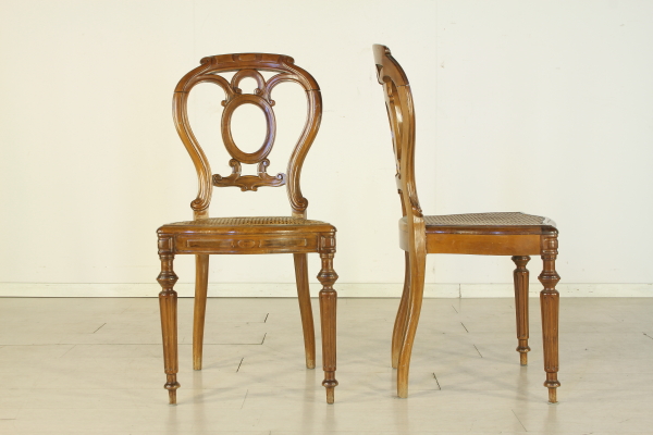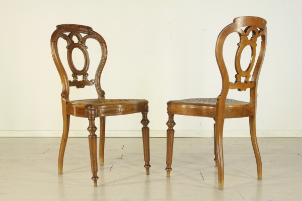 Sedie con gambe anteriori tornite e intagliate. Presenta fascia frontale mossa. Schienale a giorno riccamente lavorato e intagliato. Seduta in paglia di Vienna.