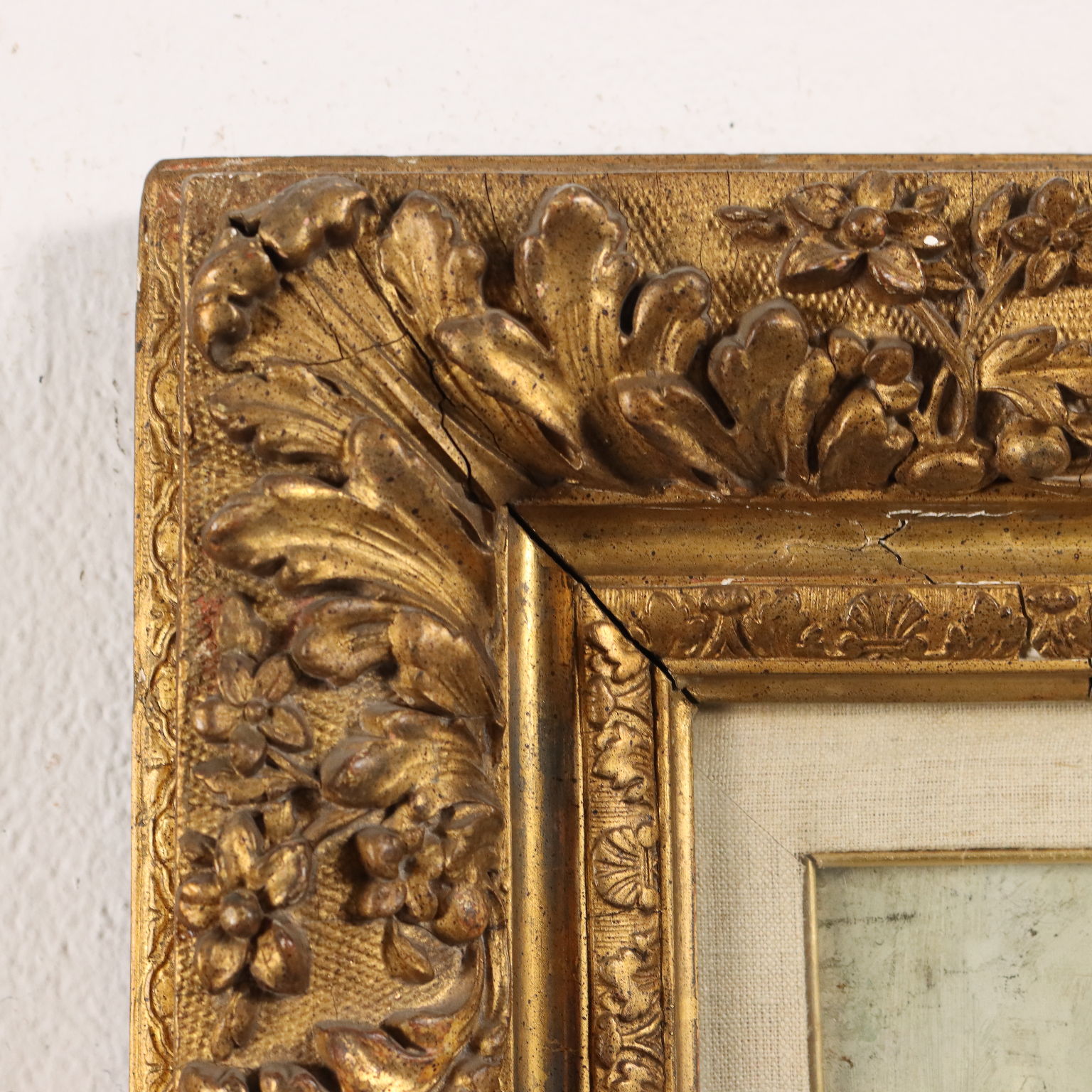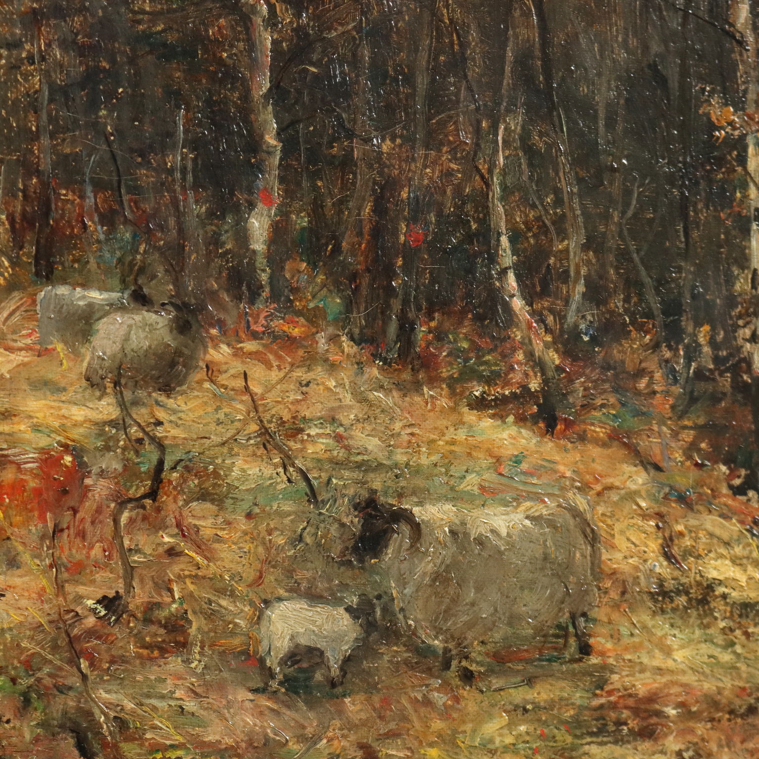Olio su tela. Firmato in basso a sinistra. Il paesaggio, uno scorcio di un bosco lungo la riva di un fiume, ove pascolano alcune pecore, rimanda alla produzione paesaggistica en plein air di cui il Daubigny fu uno dei principali rappresentanti: l'artista per diversi anni navigò lungo i fiumi del nord della Francia sul suo battello allestito a studio nel 1857, vivendo a contatto diretto con la natura e dipingendola. Considerto uno dei precursori dell' impressionismo, seppe mettere nei suoi paesaggi "una freschezza d'atmosfera, un lirismo pacato e agreste, una verità di sensazioni, uno splendore di tinte assolutamente nuovi nella pittura francese". Il dipinto è presntato in cornice della prima metà del '900.