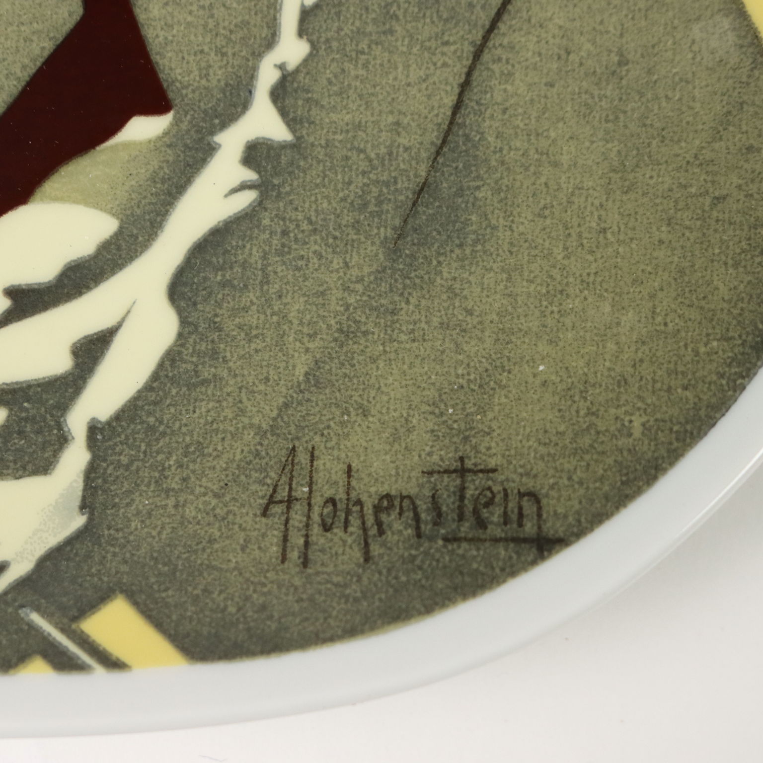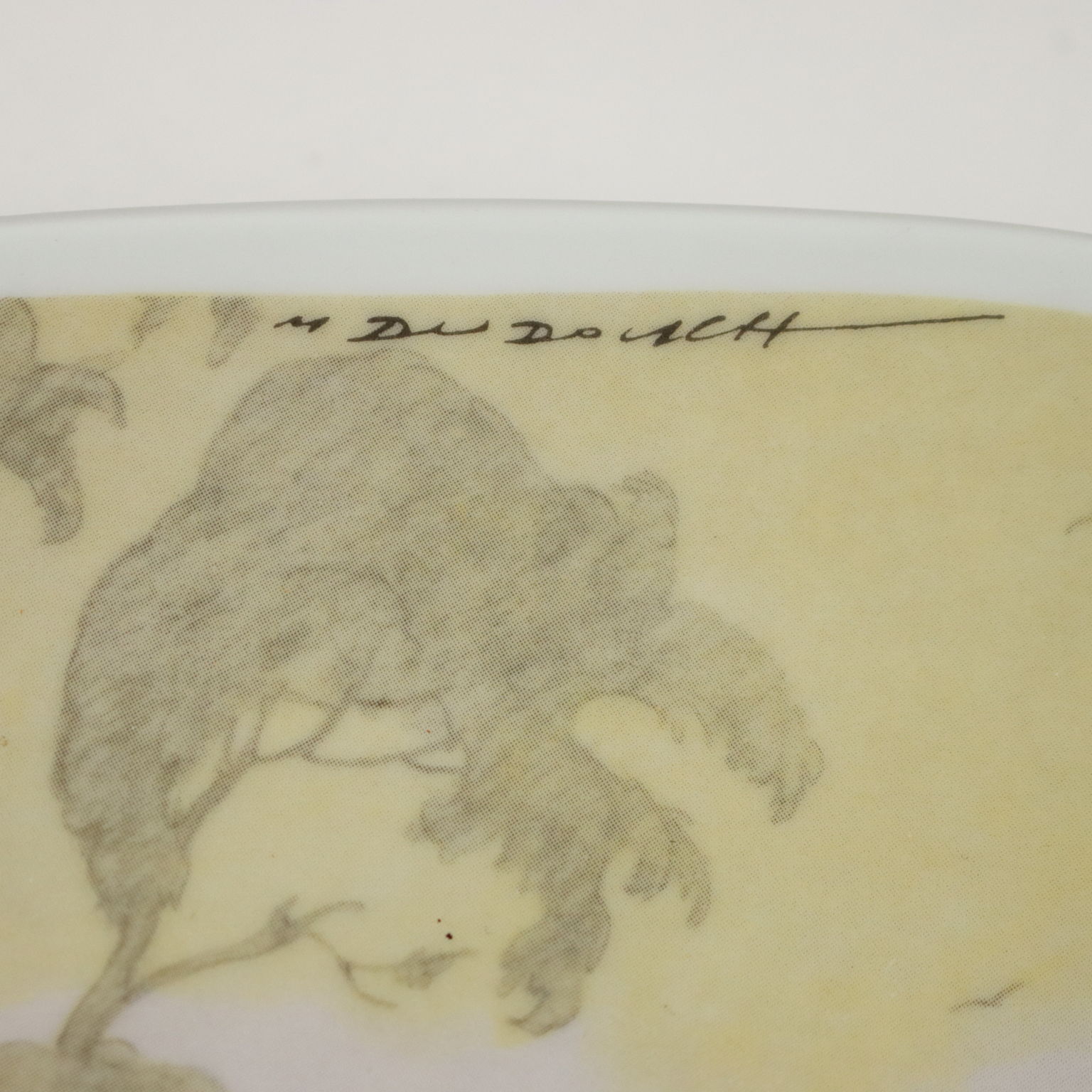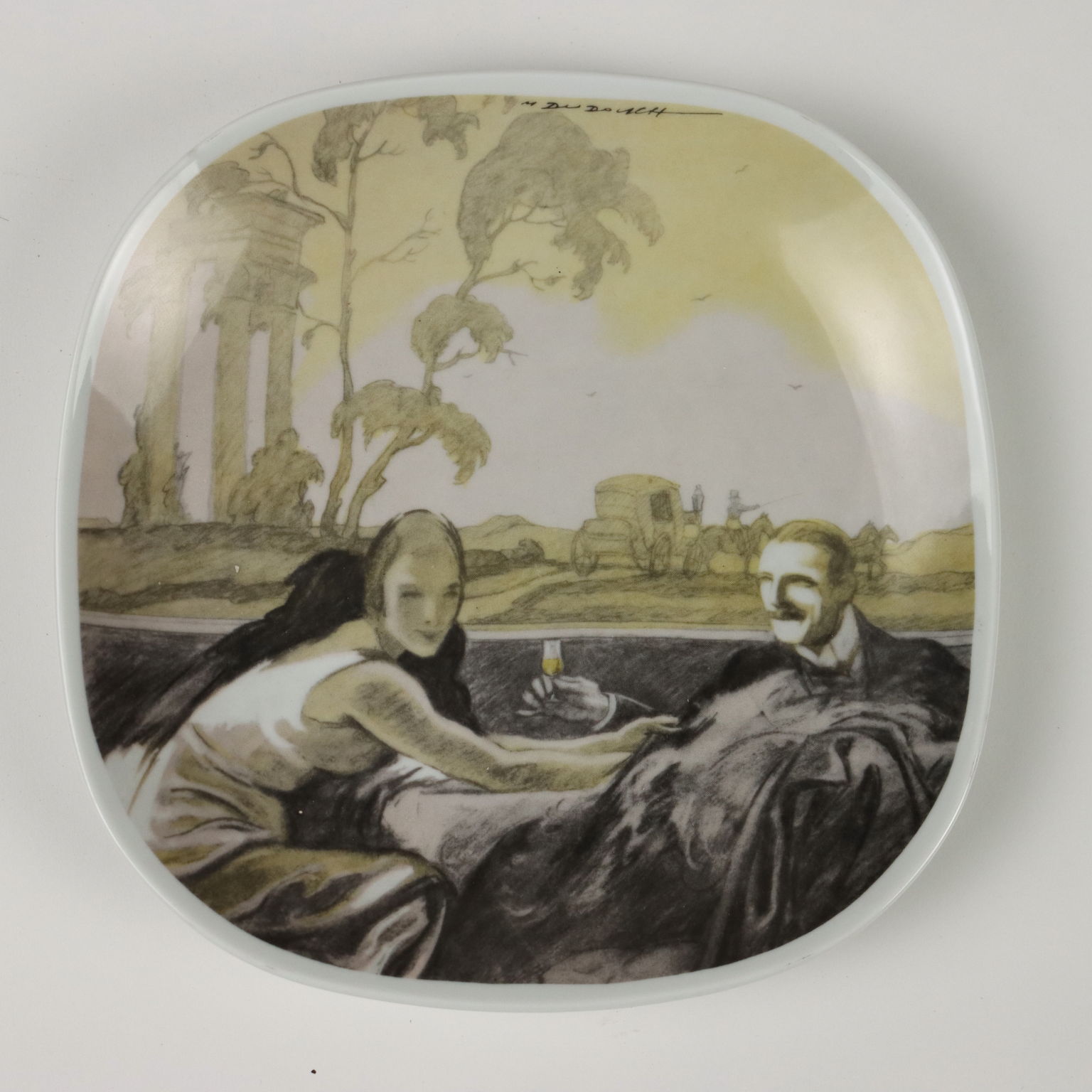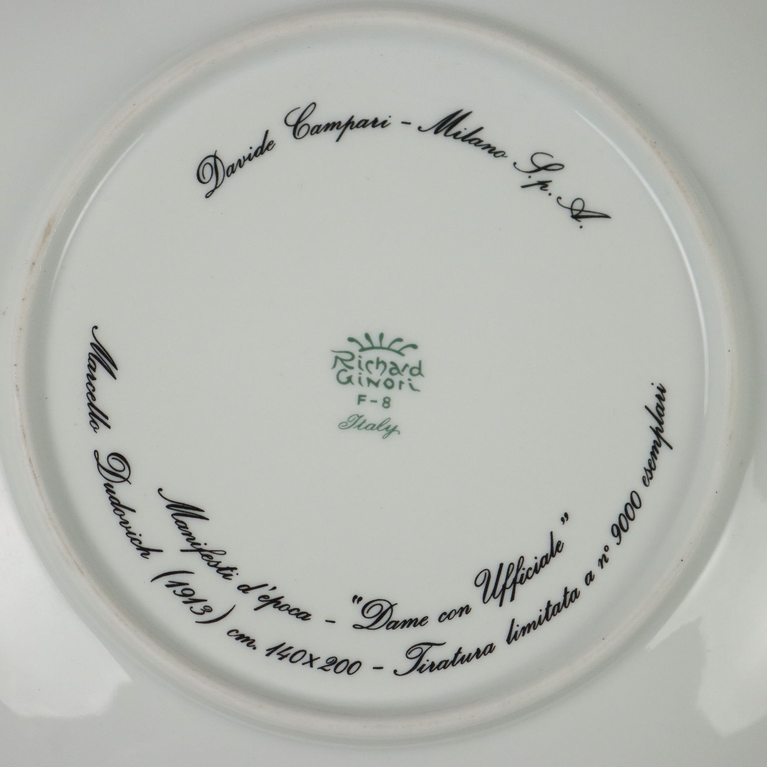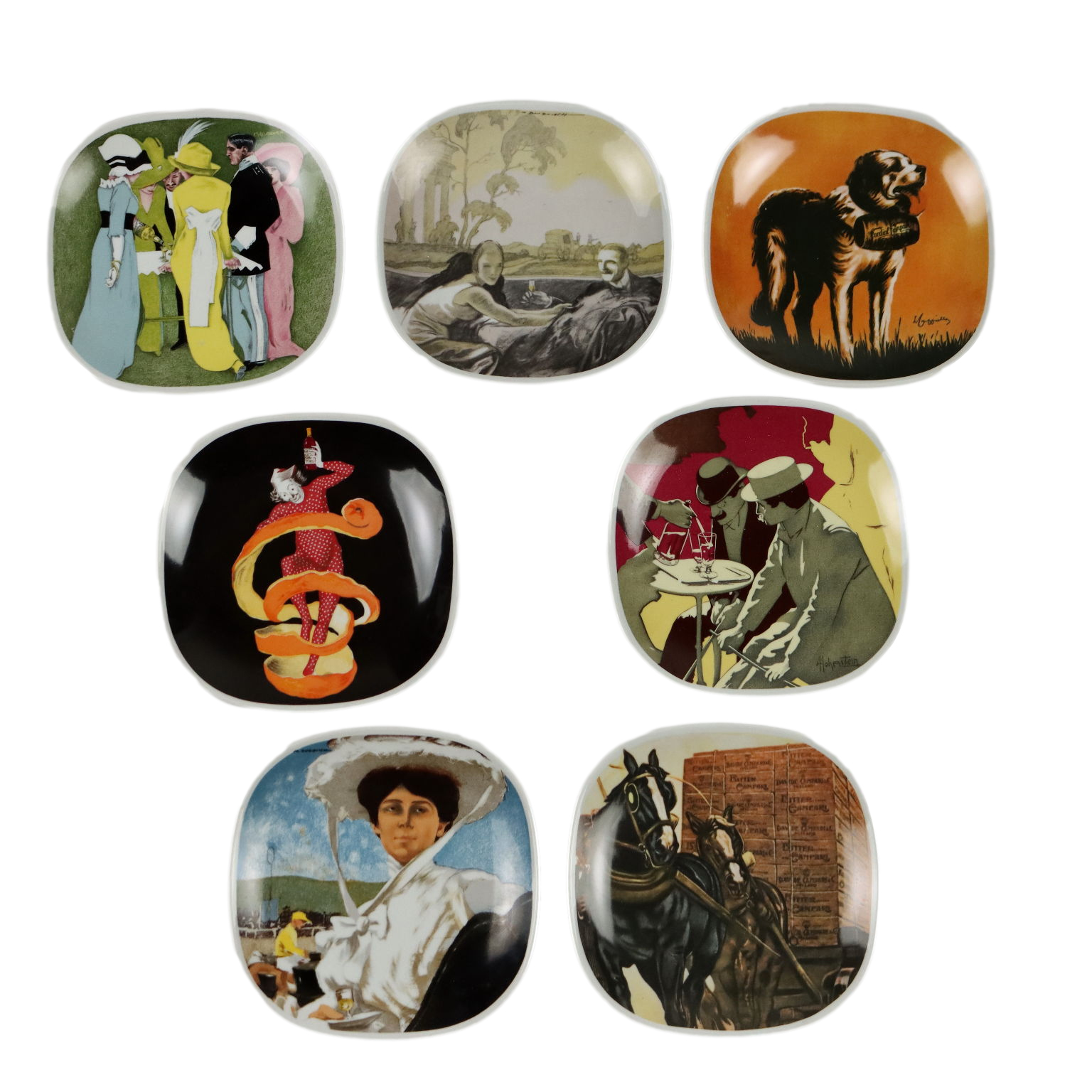 Gruppo di 7 piatti in porcellana della serie manifesti d'epoca disegnati da Marcello Dudovich nel 1913. Edizione limitata a 9000 esemplari. Al verso di ogni piatto, marchio della manifattura e indicazioni della serie.