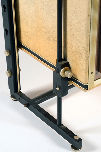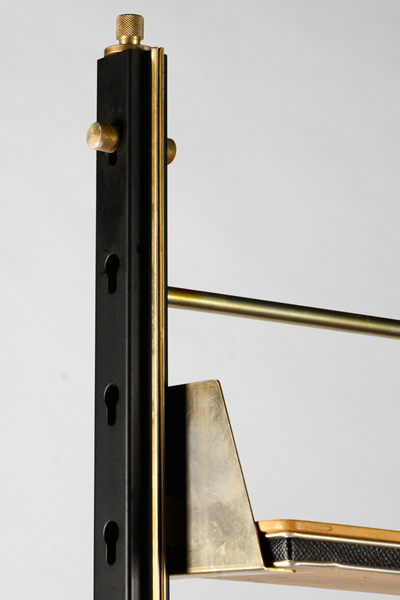 Libreria; montanti in metallo profilato in ottone, legno ricoperto in laminato plastico e skai. Buone condizioni, presenta piccoli segni di usura.