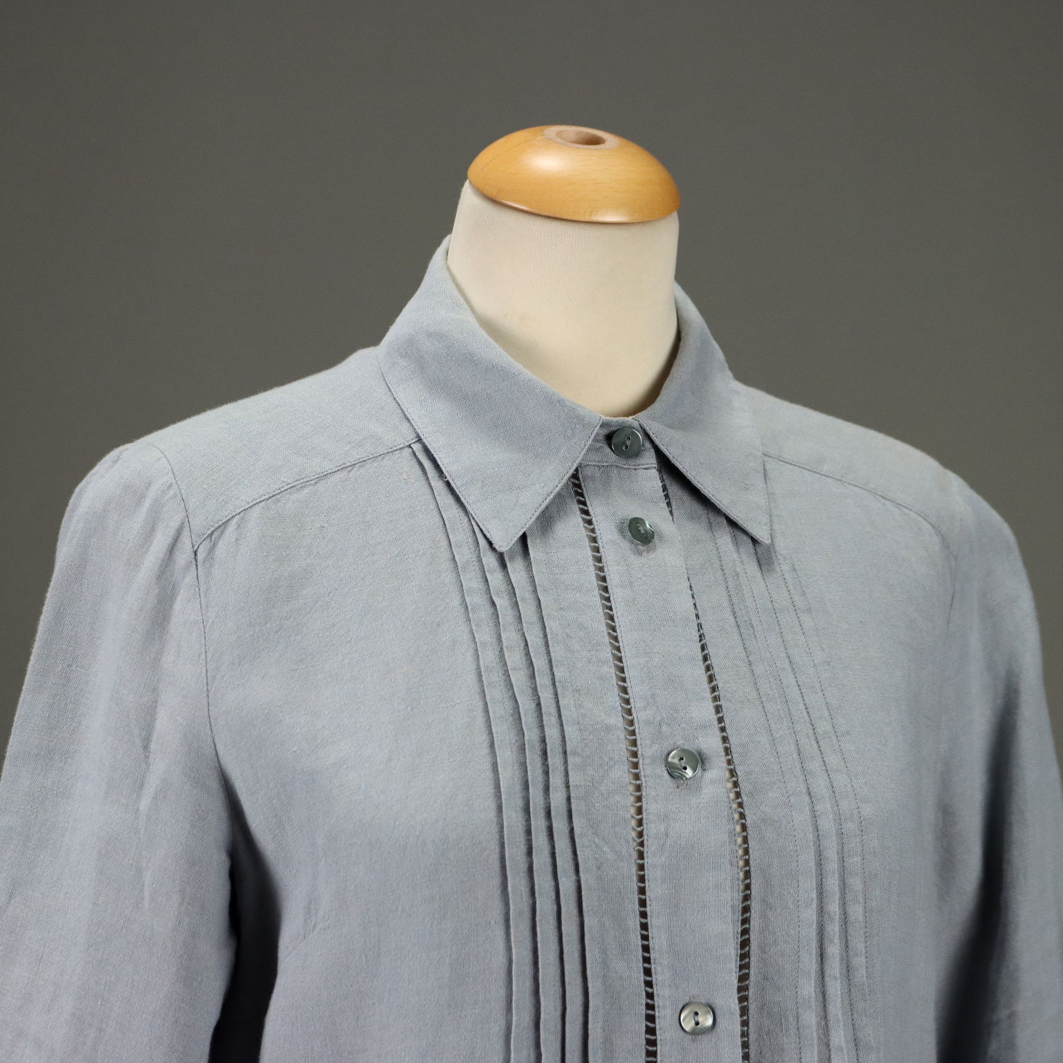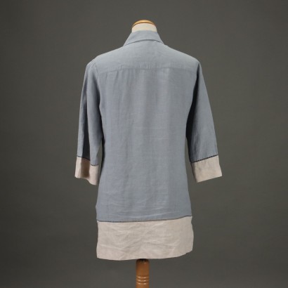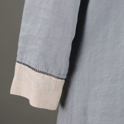 Chemisier in puro lino, nelle tonalità tenui del beige e azzurro polvere, con dettagli traforati. Plissettatura sul corpetto. Manica a 3/4. Bottoni in madreperla.