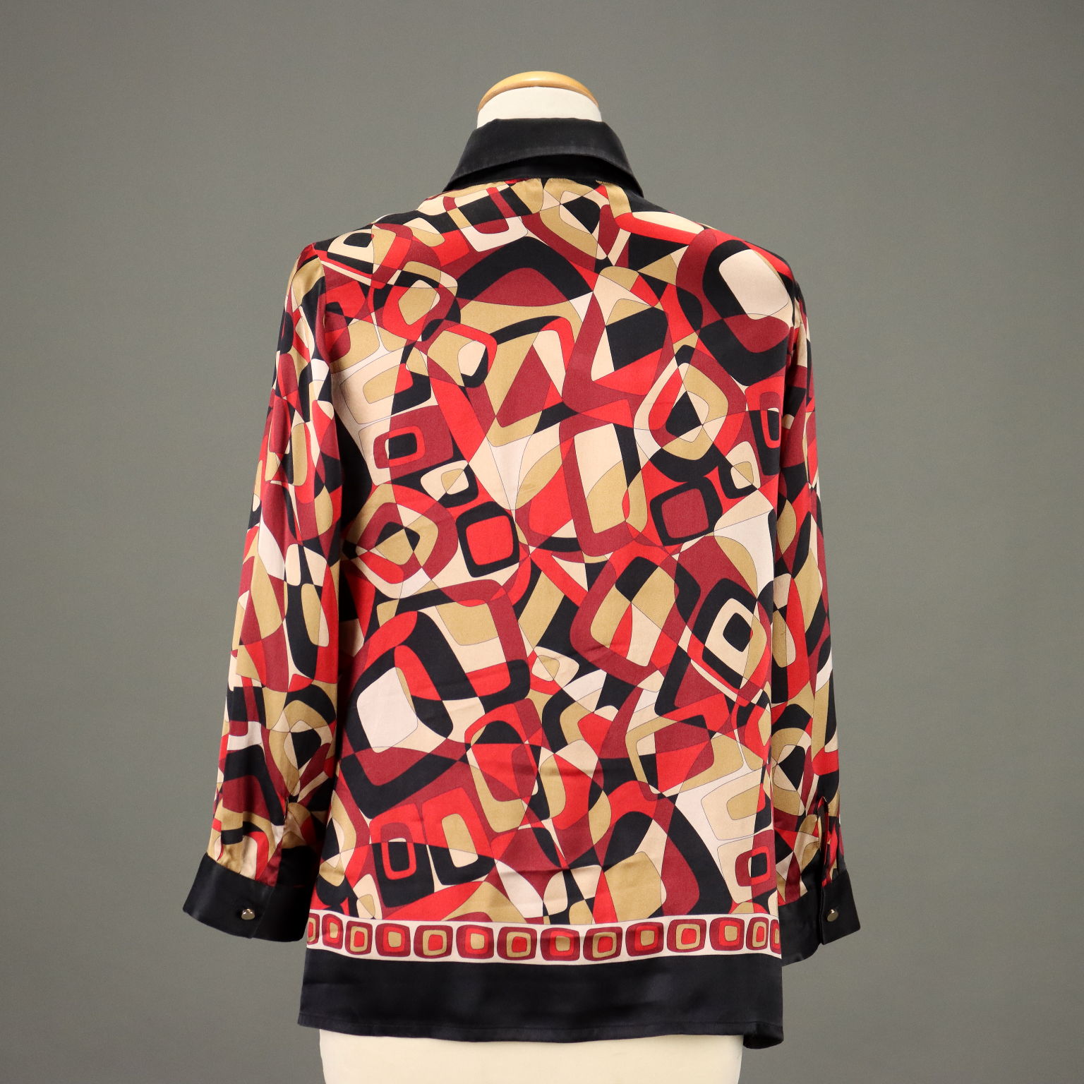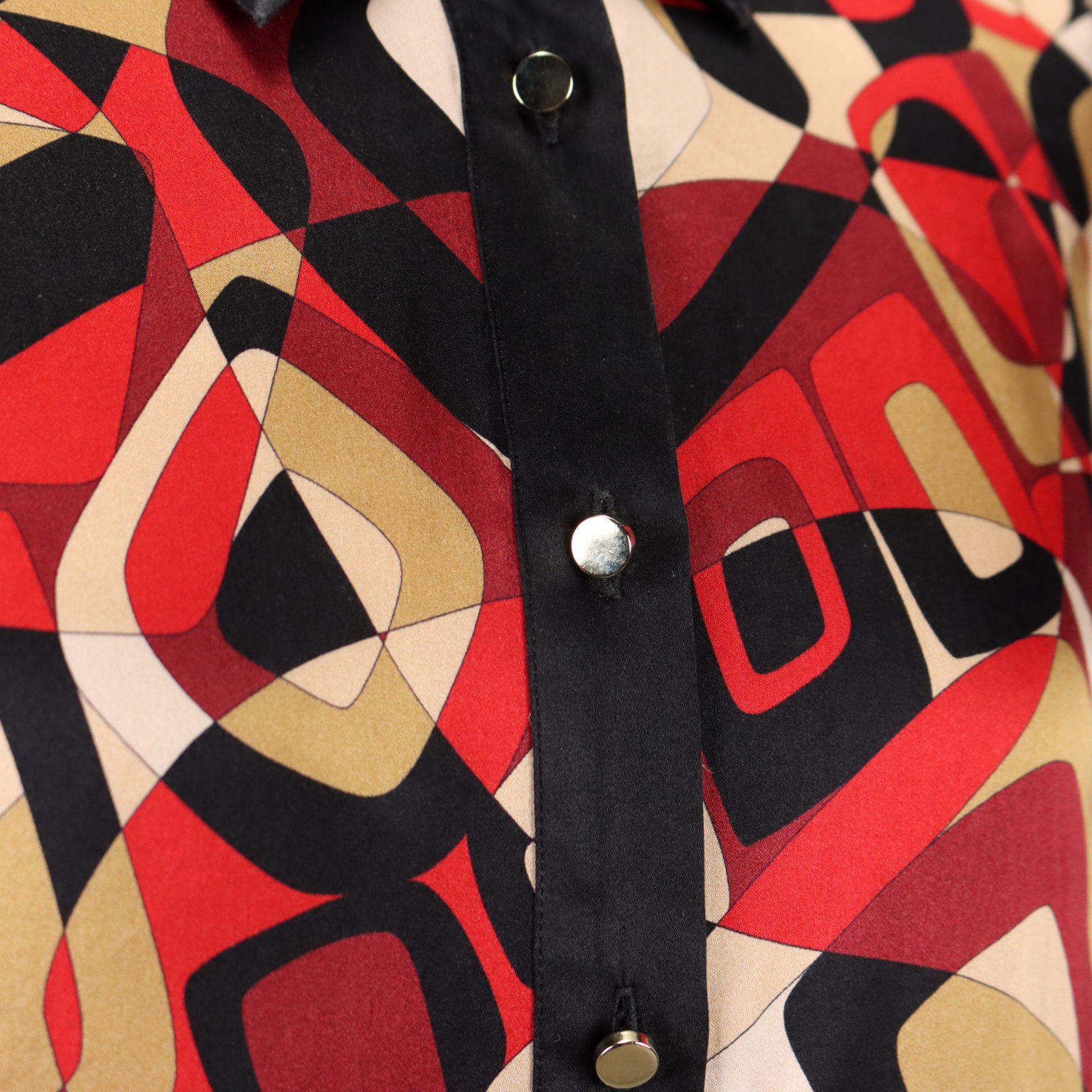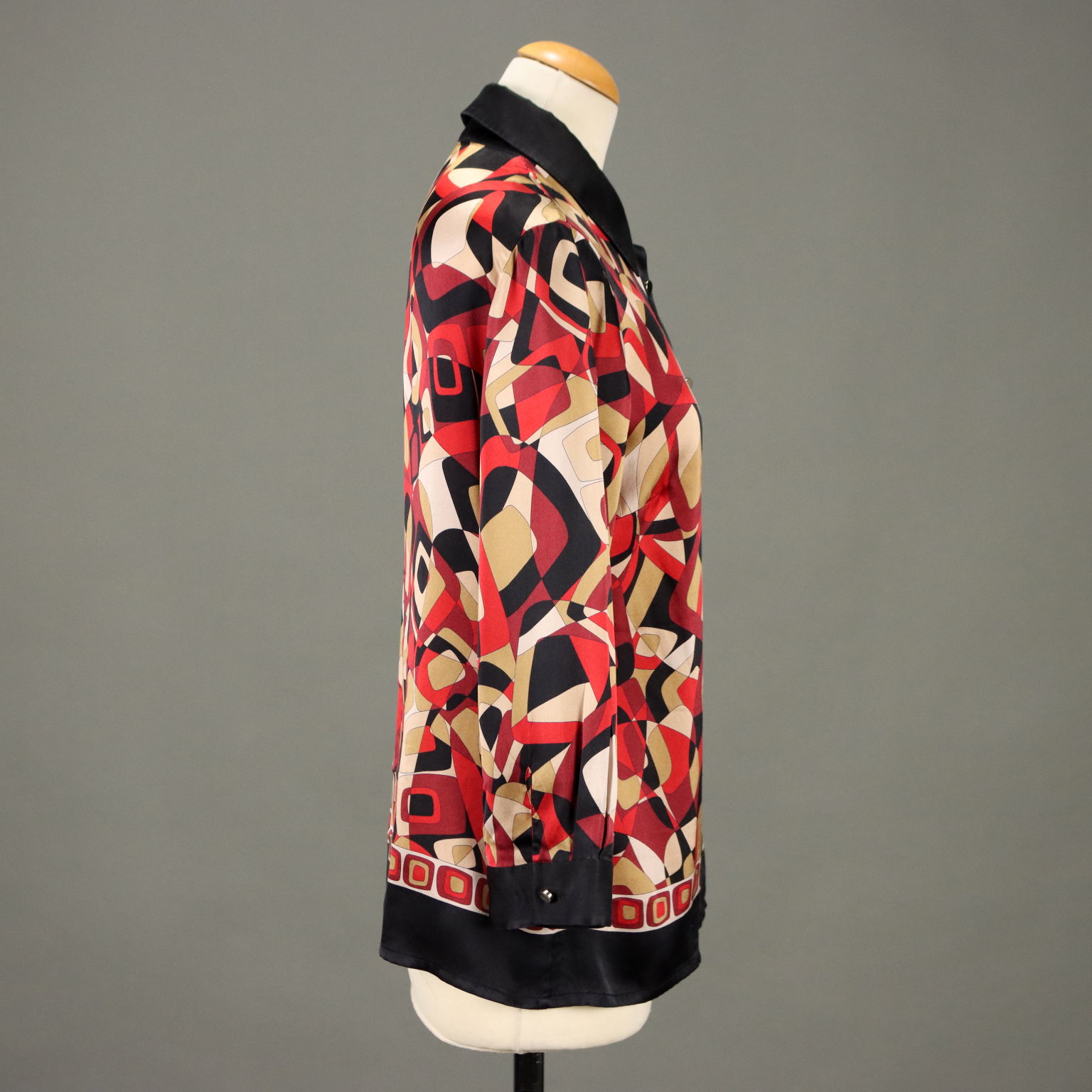 Blusa in pura seta, con stampa geometrica nelle tonalità del rosso, bordeaux, nero e beige. Manica a 3/4. Bottoni in metallo.