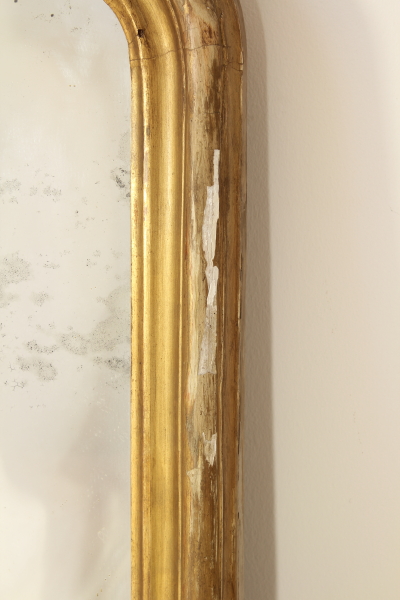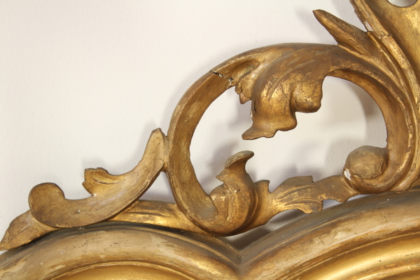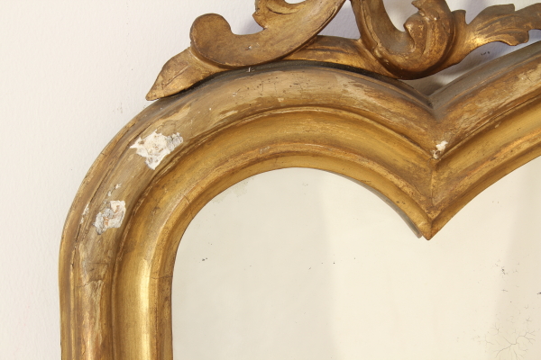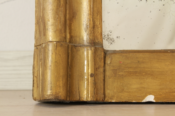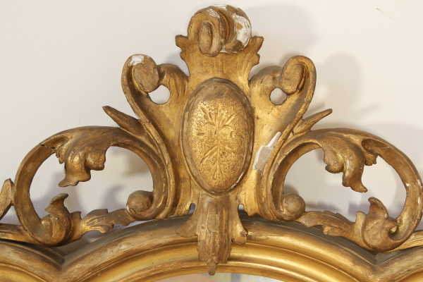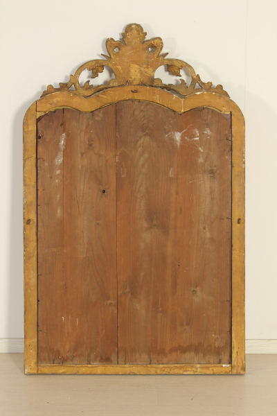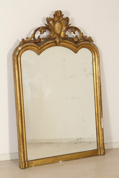 Specchiera dorata presentante montanti sagomati, cimasa tripartita con intaglio.