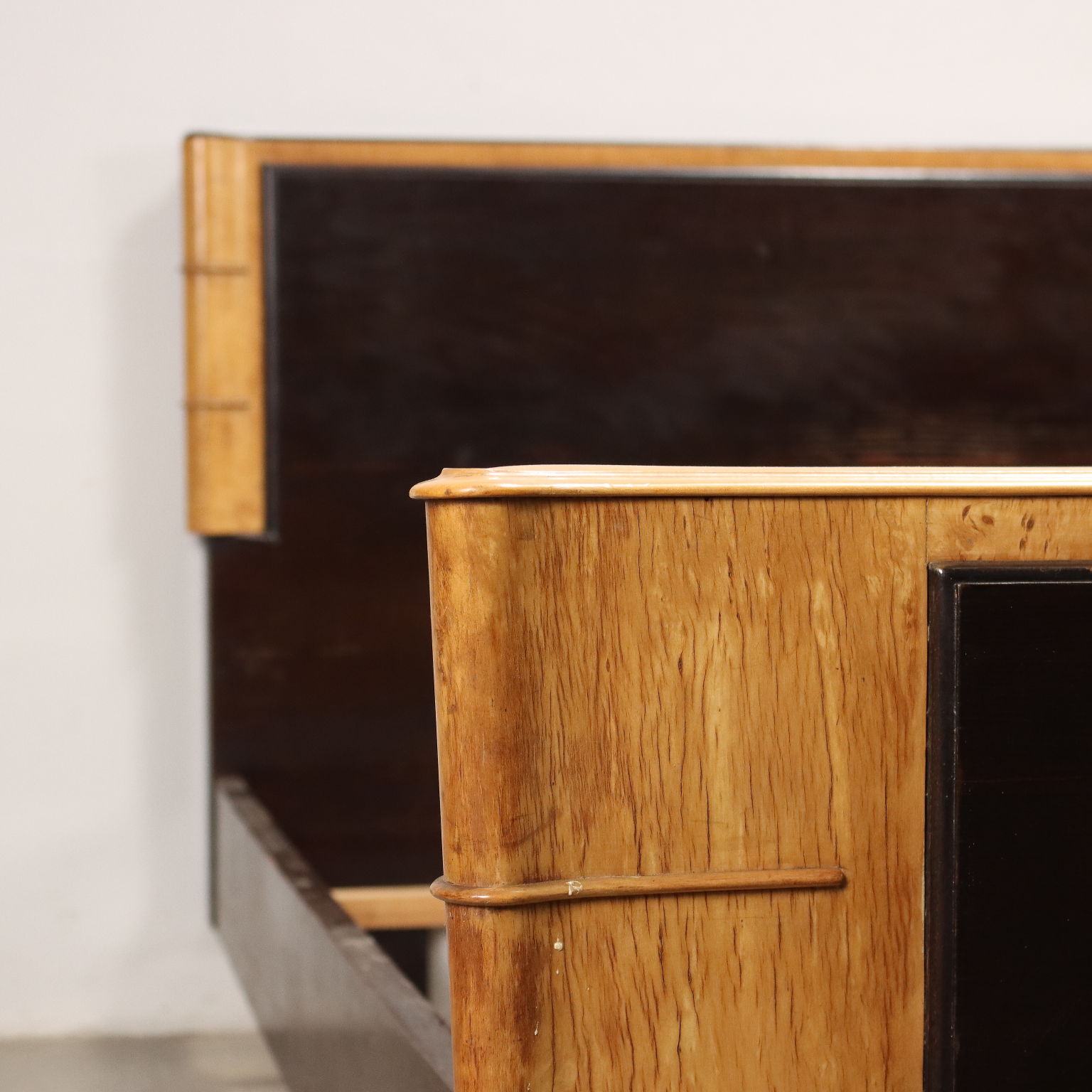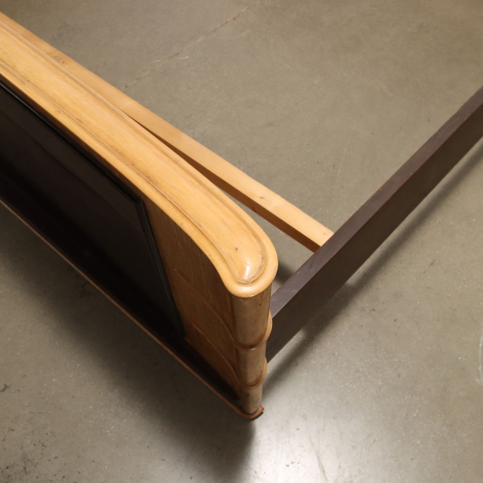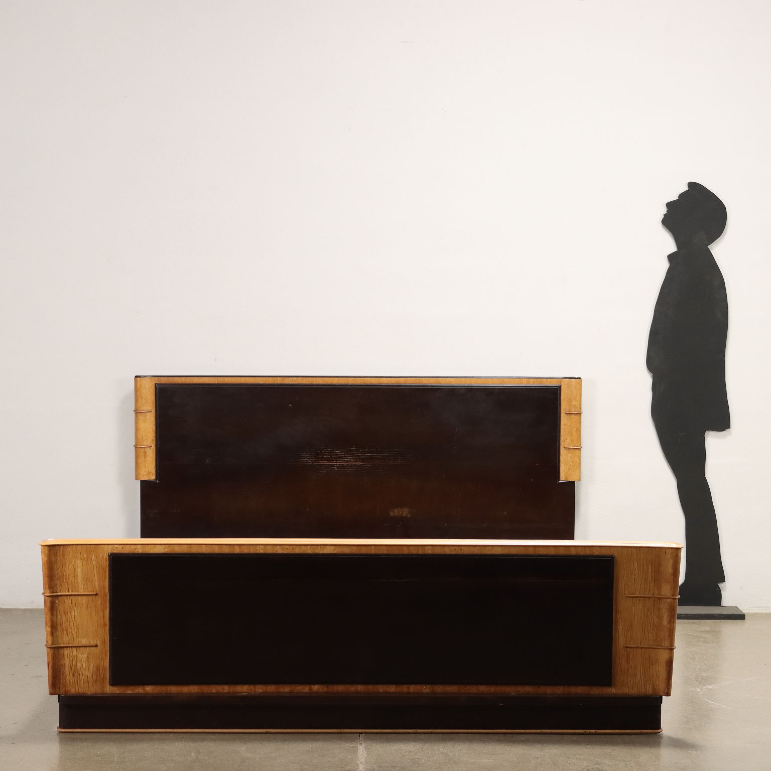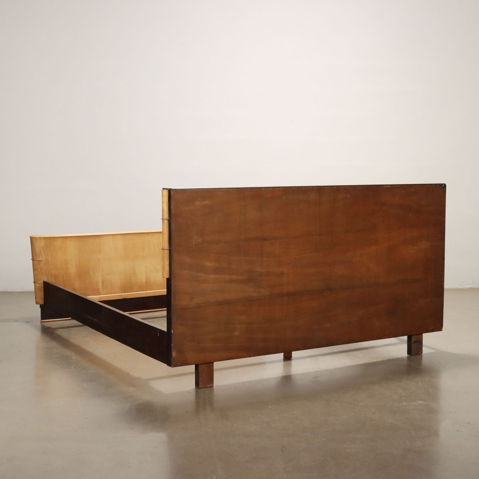 Letto matrimoniale in legno impiallacciato frassino tinto e radica di acero.