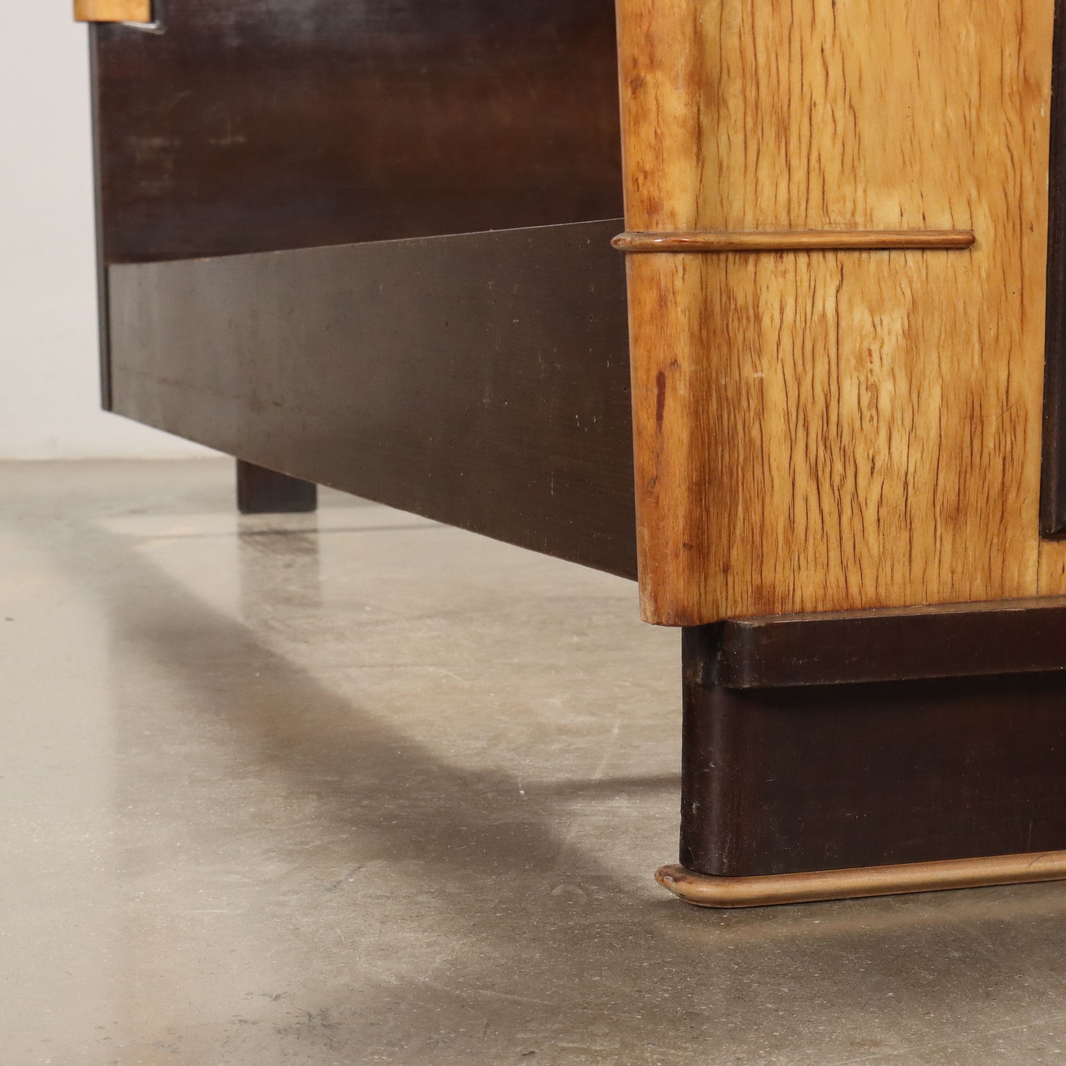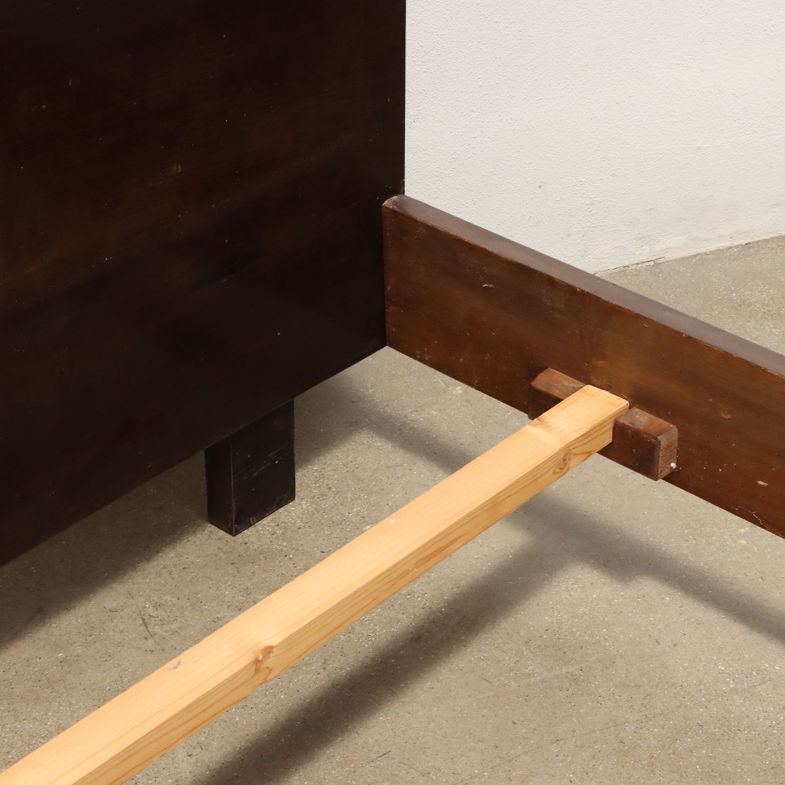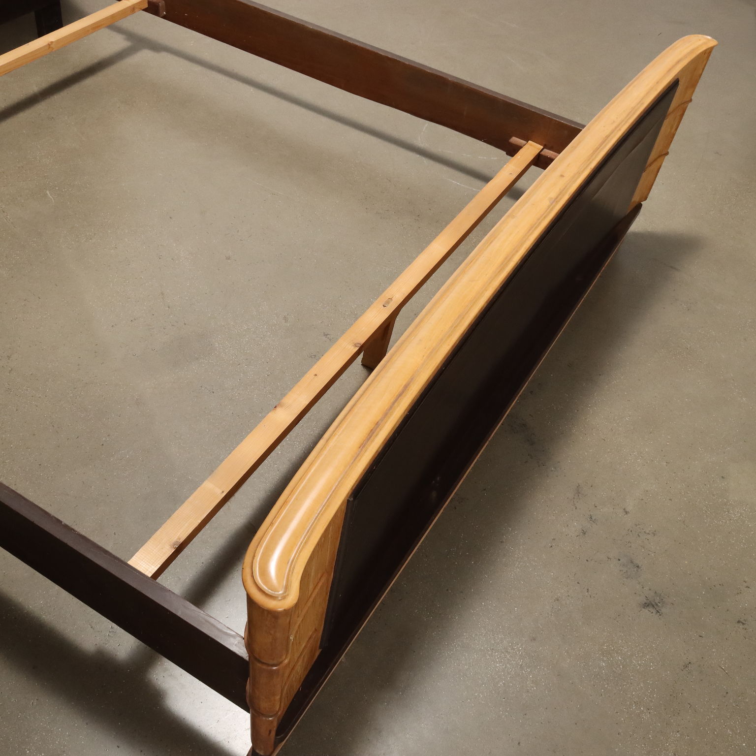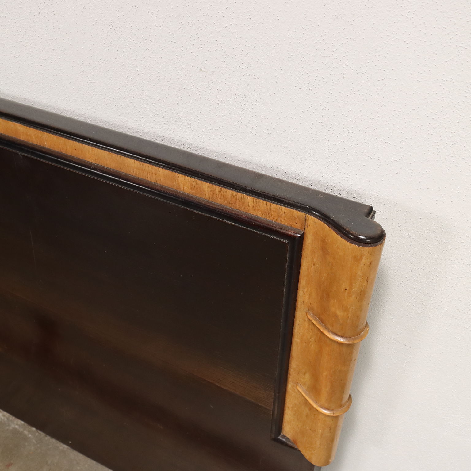 Letto matrimoniale in legno impiallacciato frassino tinto e radica di acero.